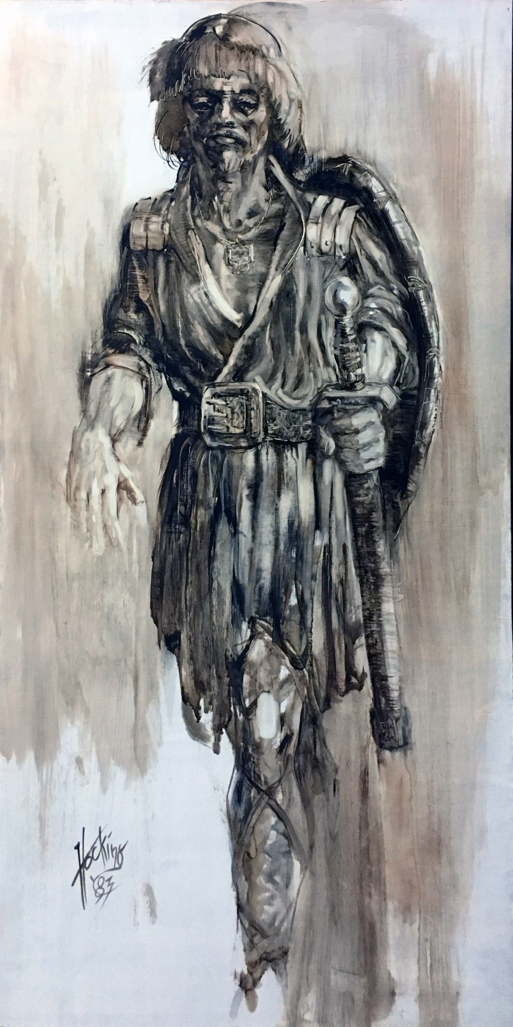 Image of a standing, bearded male figure wearing medieval garb and holding a sword in one hand