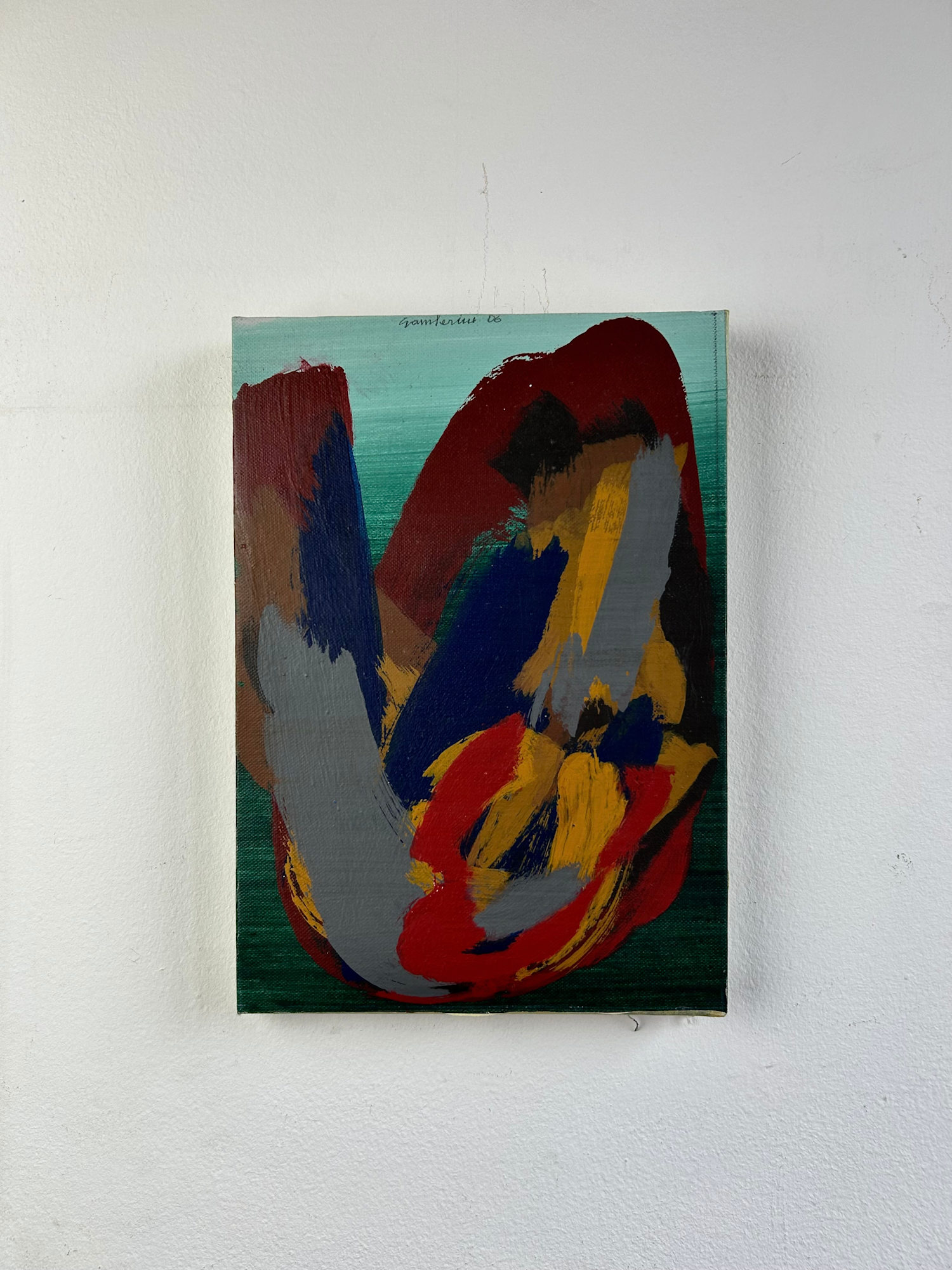 A luminous burst of color and motion, Estate evokes the heat, rhythm, and vitality of summer. Gamberini applies enamel in bold, expressive strokes, layering gestures of red, yellow, blue, and grey against a serene green backdrop. The painting radiates the freedom and immediacy typical of his late work, capturing an emotional atmosphere rather than a representational scene. Exhibited at Art Action, Novara, 2008