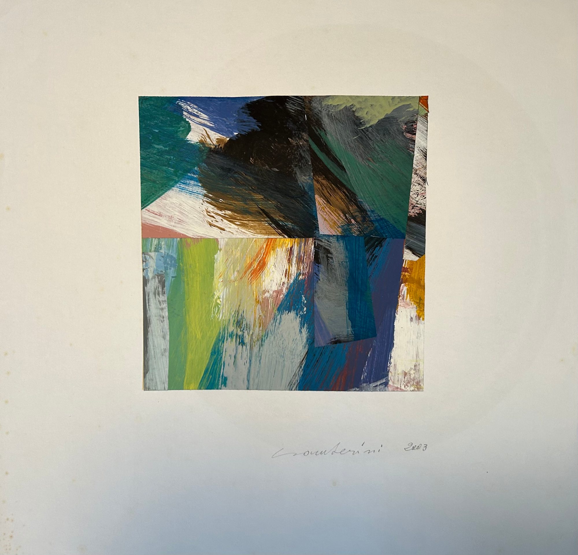 In this compact yet luminous composition from the "Riflessi" series, Ruggero Gamberini fractures colour and gesture into a poised square of shifting planes. Sweeping strokes of teal, slate, ivory and muted gold collide and overlap, their directional energy held in tension by the strict geometry of the format. The collage structure introduces subtle interruptions - edges, seams, tonal breaks - that read like light caught on a moving surface.