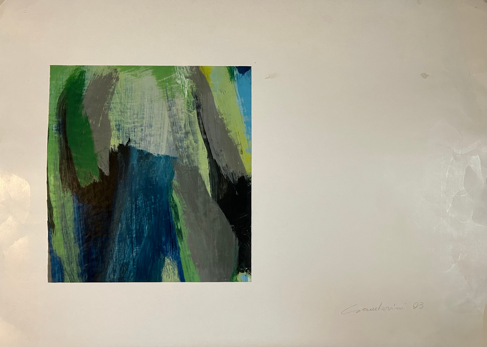In this 2003 collage, Ruggero Gamberini works through layered gestures of oil paint and paper to construct a compact field of shifting depths. Muted greys, mossy greens and saturated blues slide against one another, creating a sense of vertical movement and internal tension. The surface feels worked and revised, as if the image has been arrived at through hesitation rather than certainty. Abstraction here is not decorative but exploratory - a space where colour, texture and rhythm test their own limits.