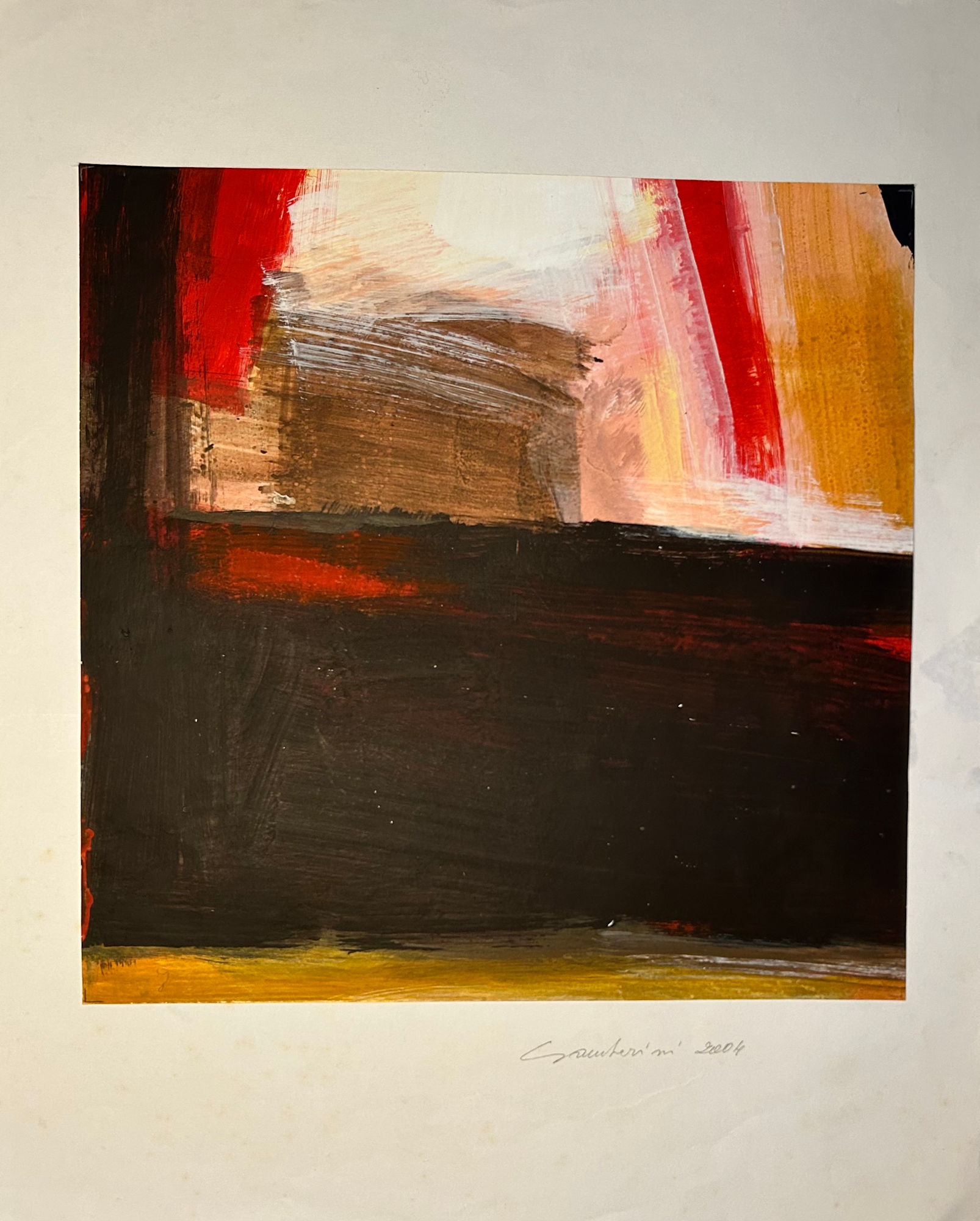 In this "Untitled" collage from 2004, Ruggero Gamberini layers oil paint across paper in broad, weighted planes, allowing colour to behave architecturally rather than descriptively. Earthy blacks and browns anchor the composition, while flashes of red, ochre and chalky white cut through the surface like structural interruptions. The work balances gesture and restraint: brushstrokes remain visible, but never indulgent, suggesting a landscape that has been stripped of geography and reduced to rhythm, mass and tension. It feels less like a view and more like a memory of one - compressed, sedimented, and slightly unsettled.