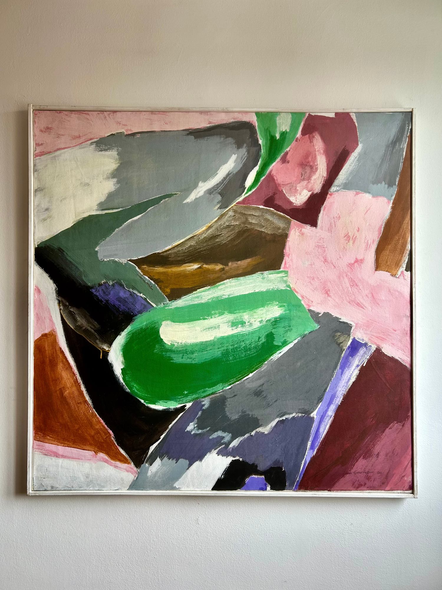 This 2011 work reveals Gamberini’s mastery in balancing chromatic weight and compositional rhythm. The dialogue between vibrant greens, muted pinks, and neutral greys animates the surface, reflecting the artist’s continuous pursuit of equilibrium between spontaneity and form.