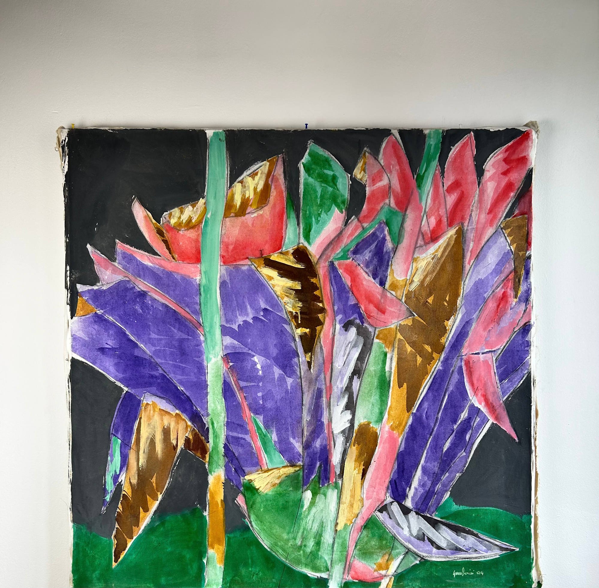 In this vibrant late canvas, Gamberini merges floral vitality with abstract geometry. Sweeping gestures and saturated tones create a dynamic interplay between form and movement, reflecting the artist’s enduring fascination with rhythm and structure in nature.