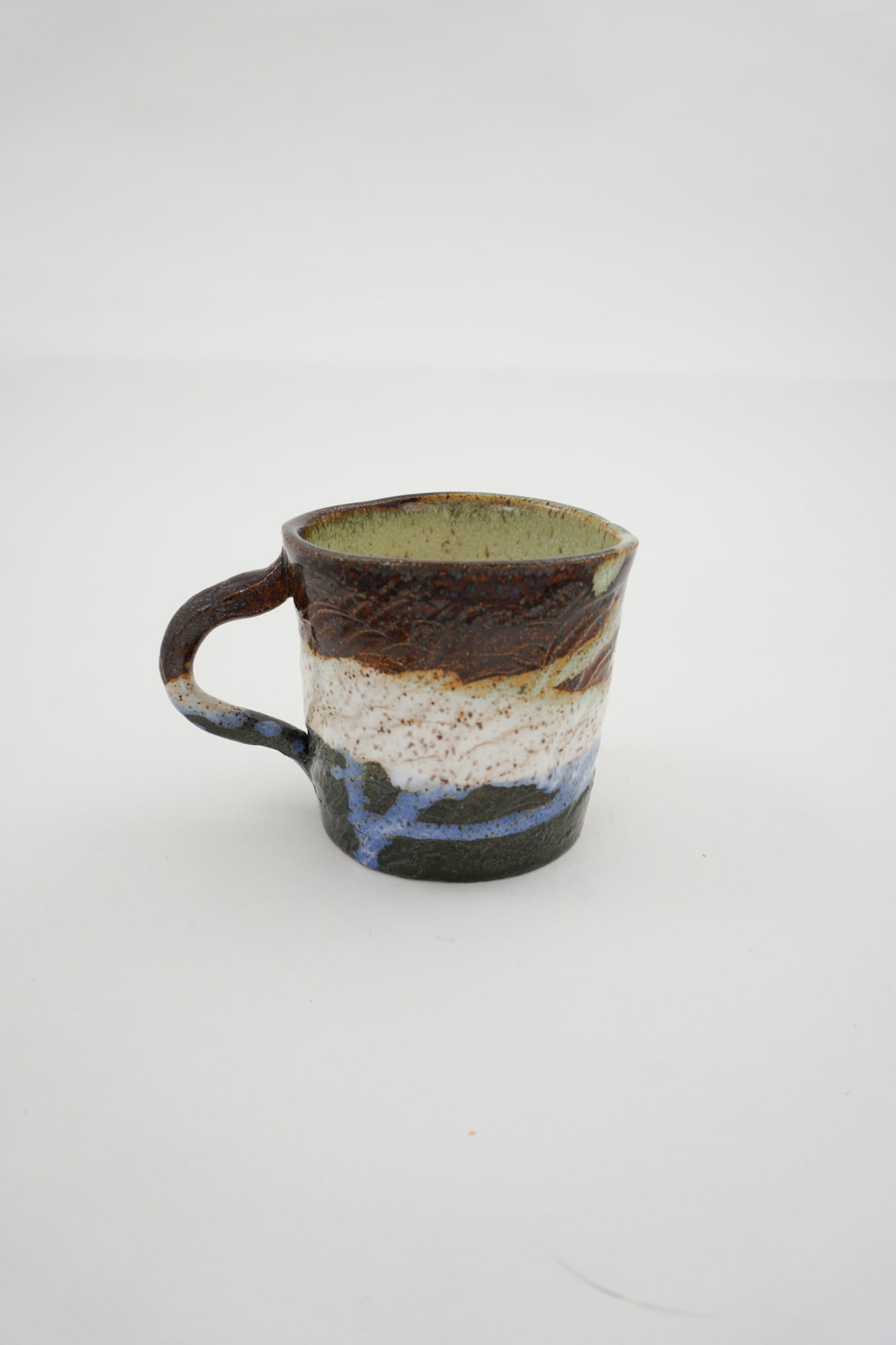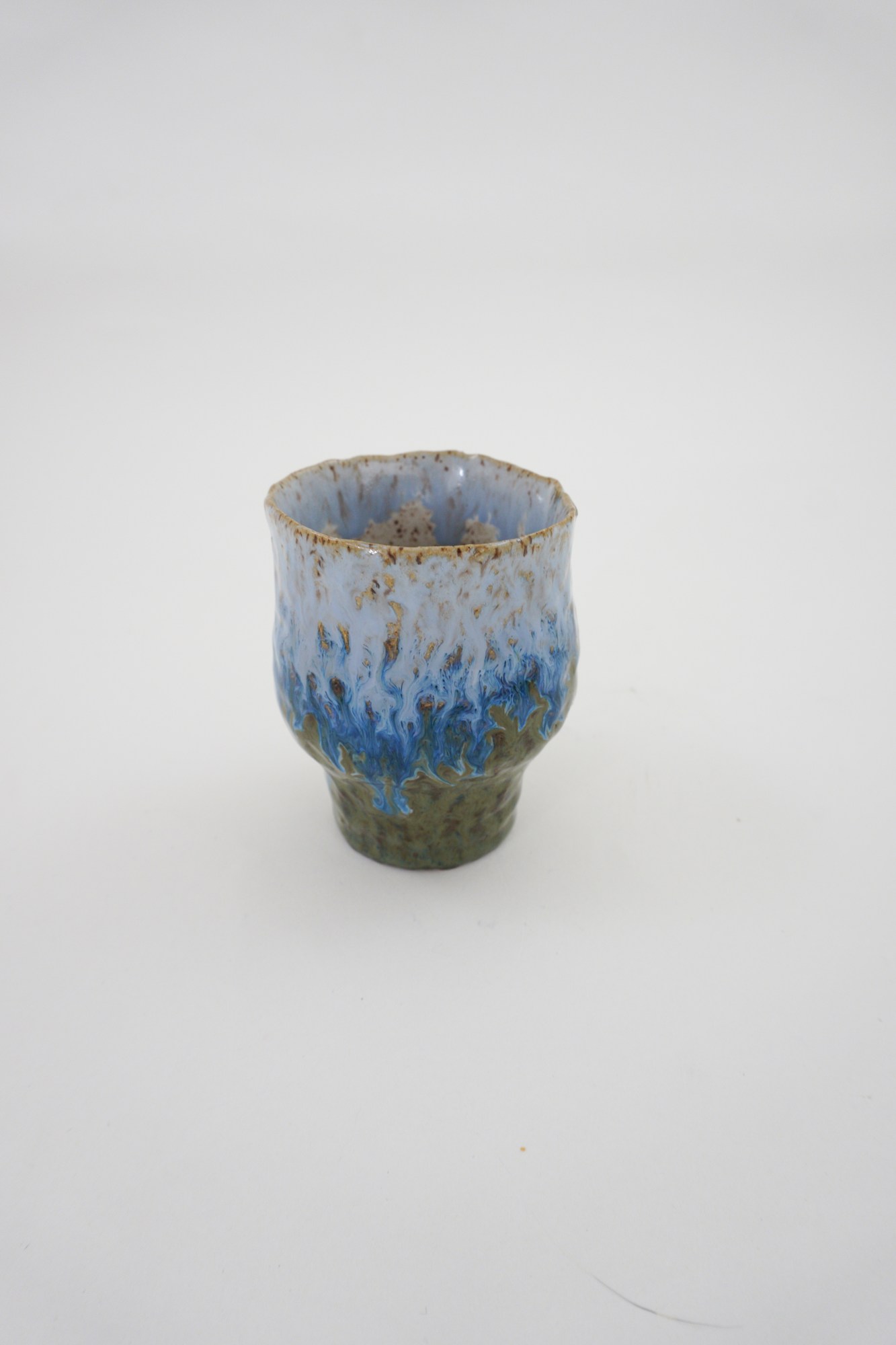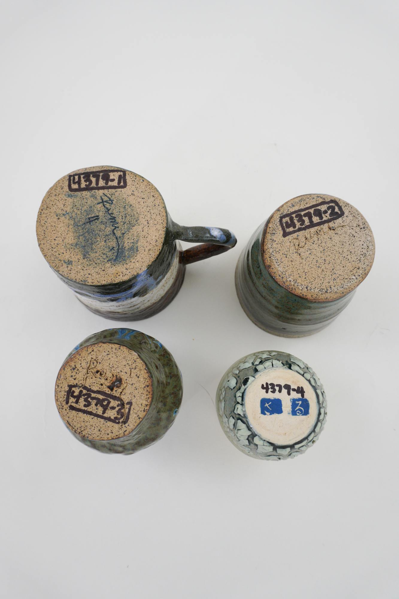 4379-1 Earthenware, blue, brown, white and green underglaze. 4379-2 Earthenware, blue, brown, white and green underglaze. 4379-3 Earthenware, blue, brown, white and green underglaze. 4379-4 Small porcelain, green underglaze, crawl around base of exterior cup.