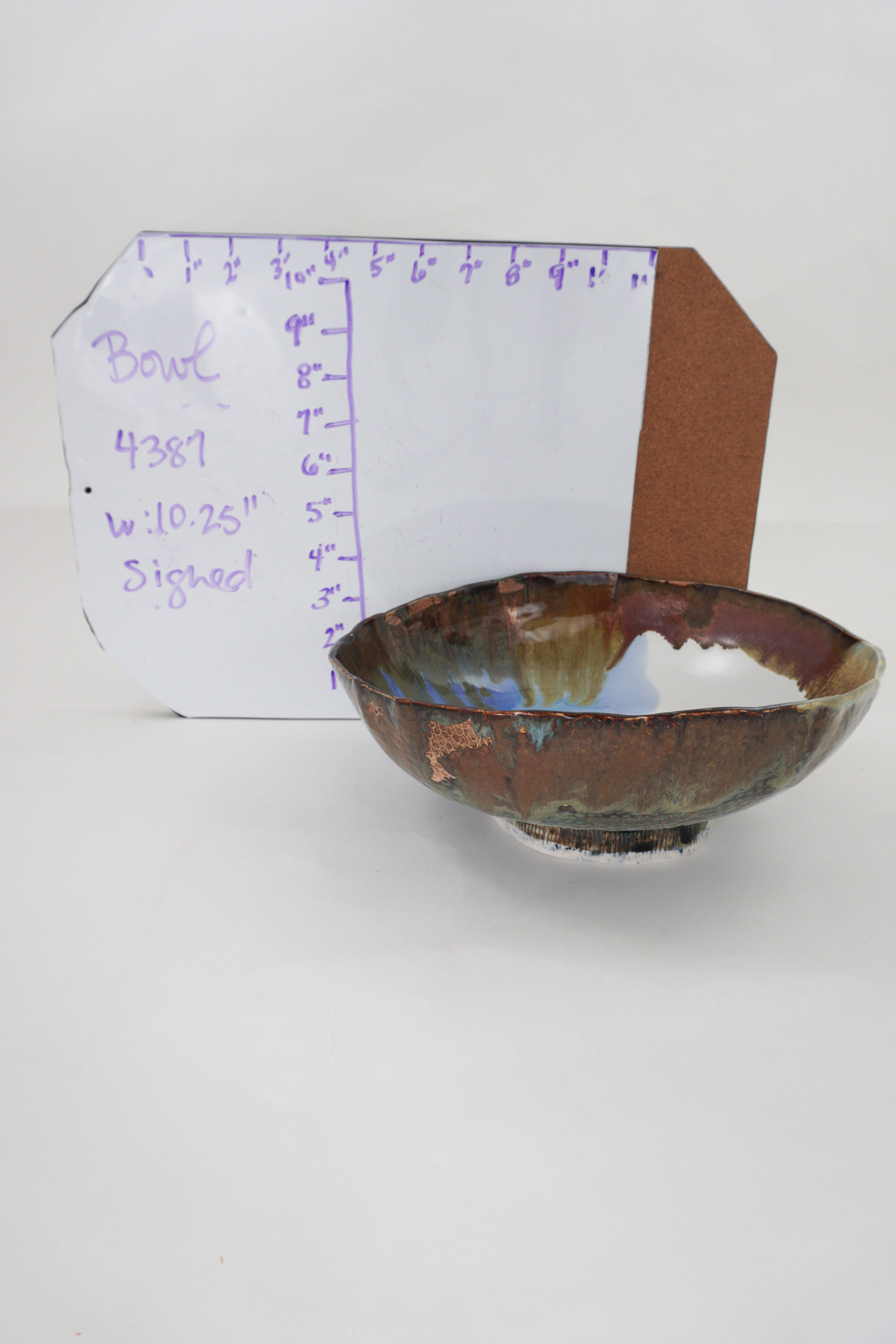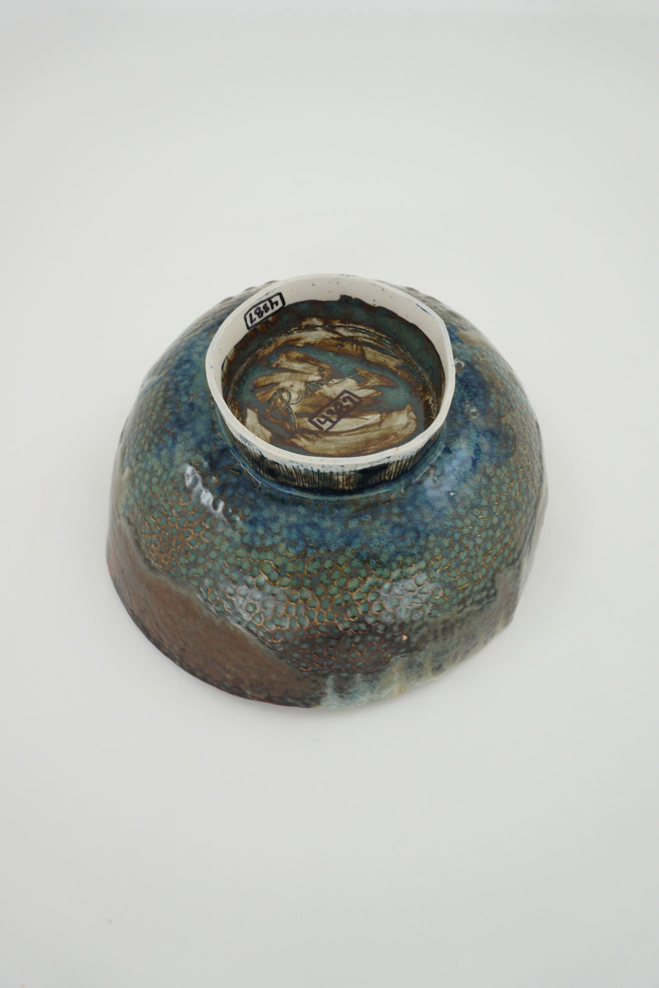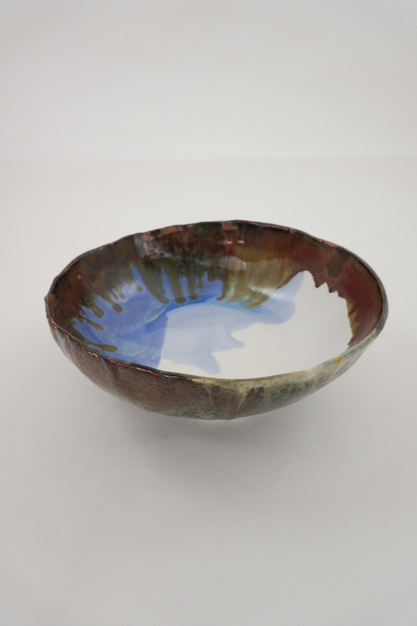 Copper brown, blue and white underglaze on interior. Exterior brown underglaze.