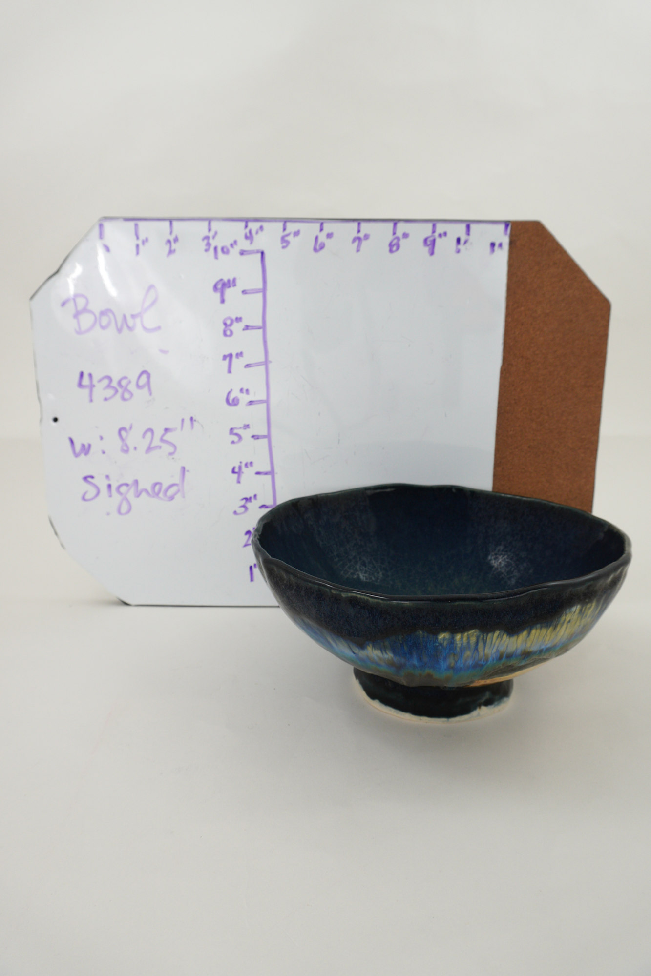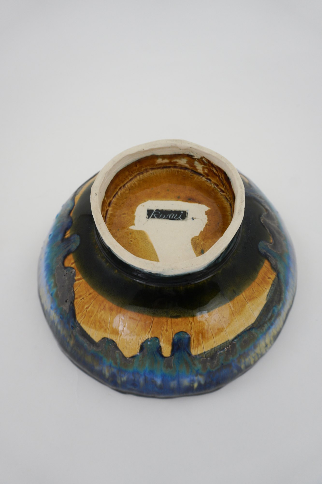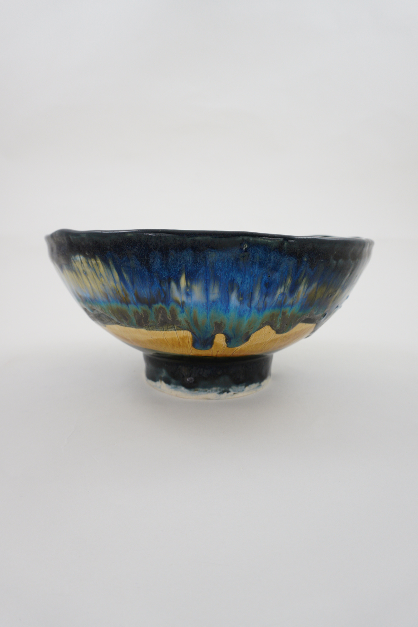 Dark blue and light brown underglaze. Predominately dark blue underglaze around entire bowl.