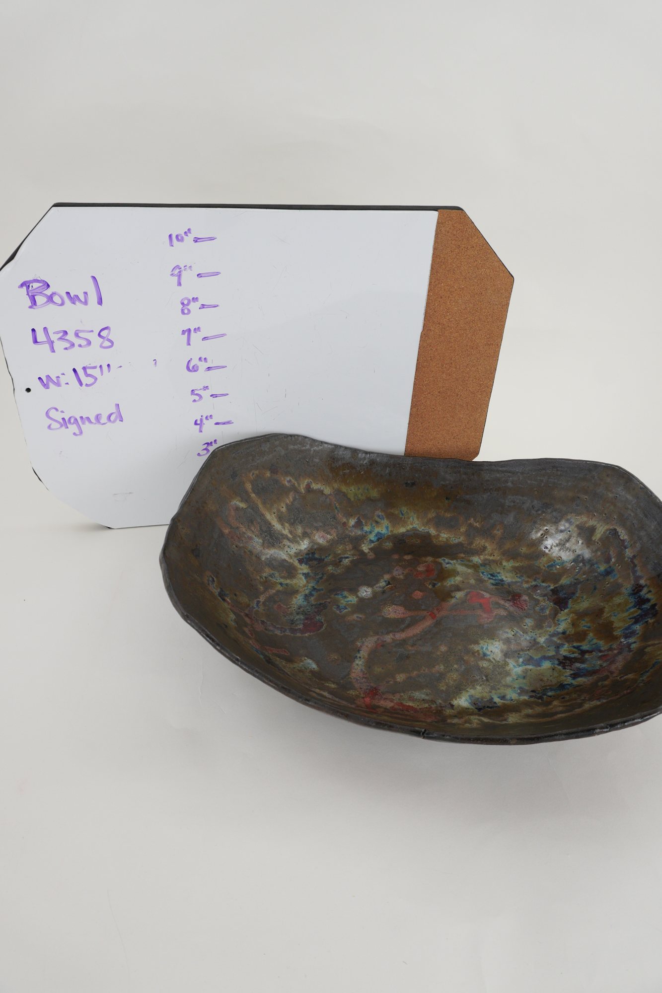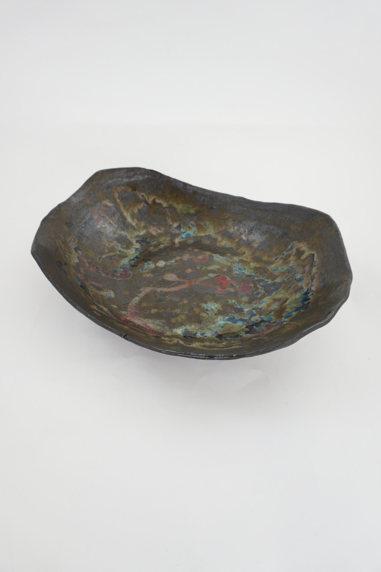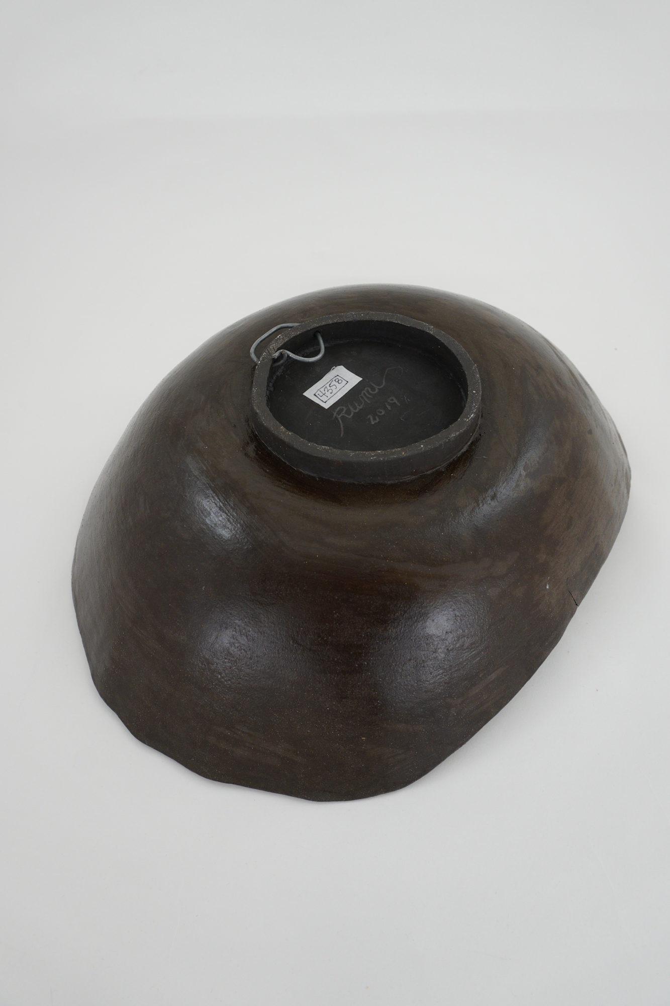 Large and deep oval bowl. Dark copper color with a few spots of red glaze. Hand signed and dated 2019 on the base.