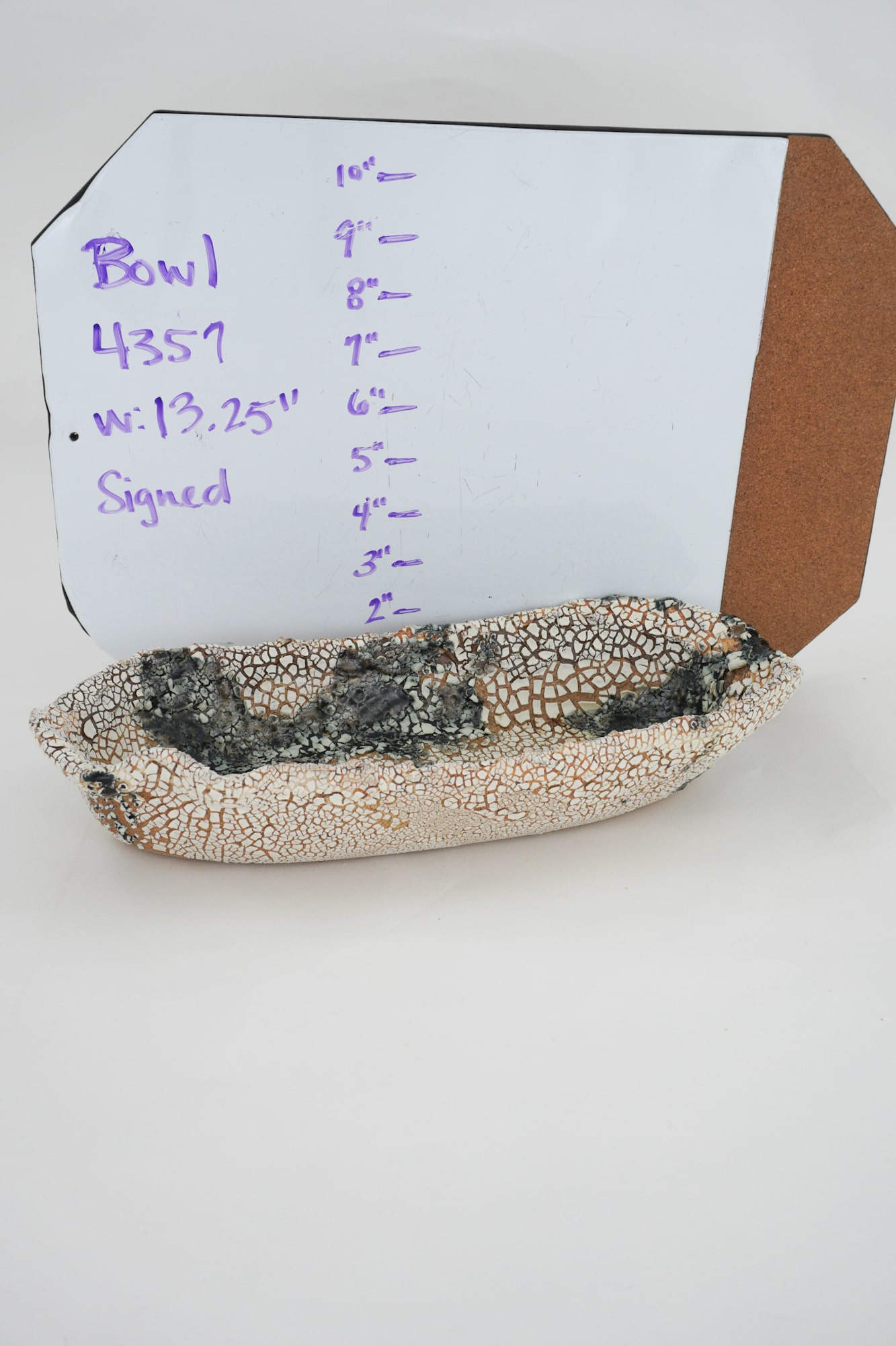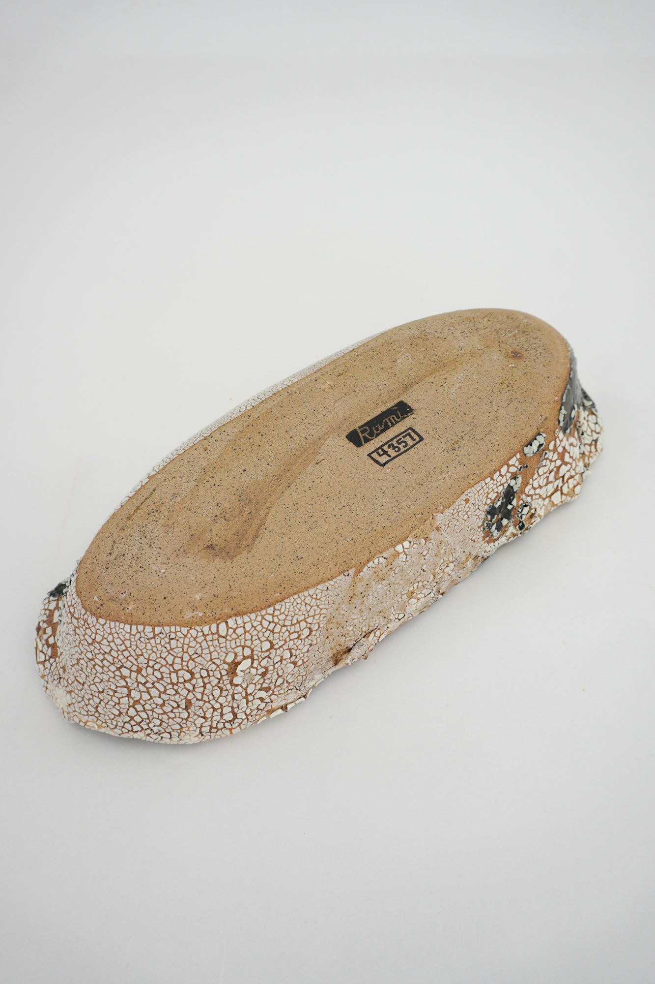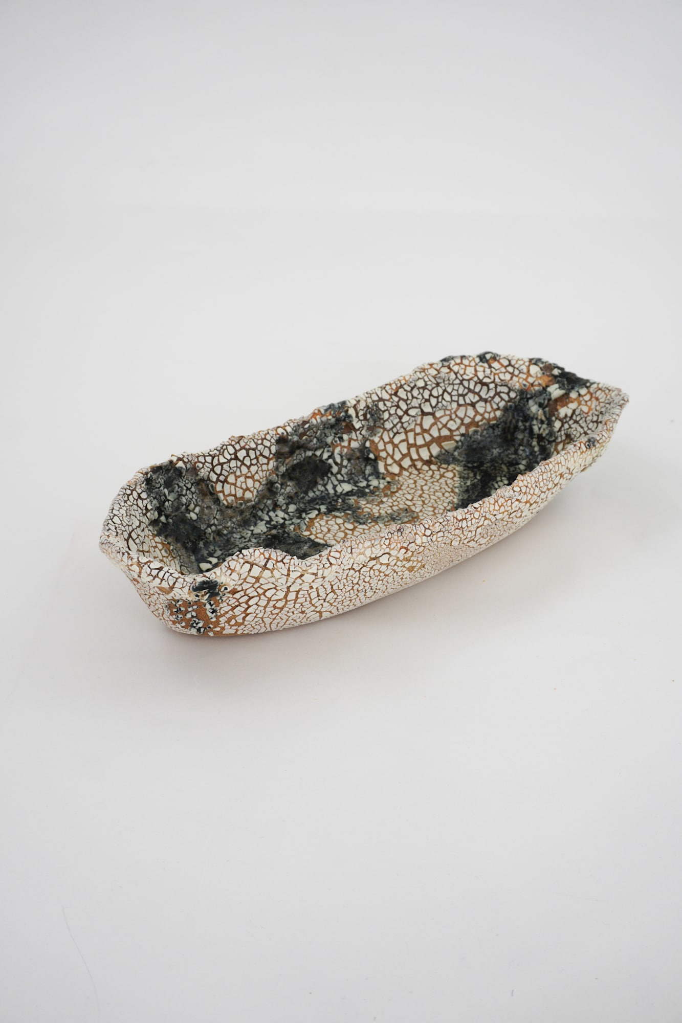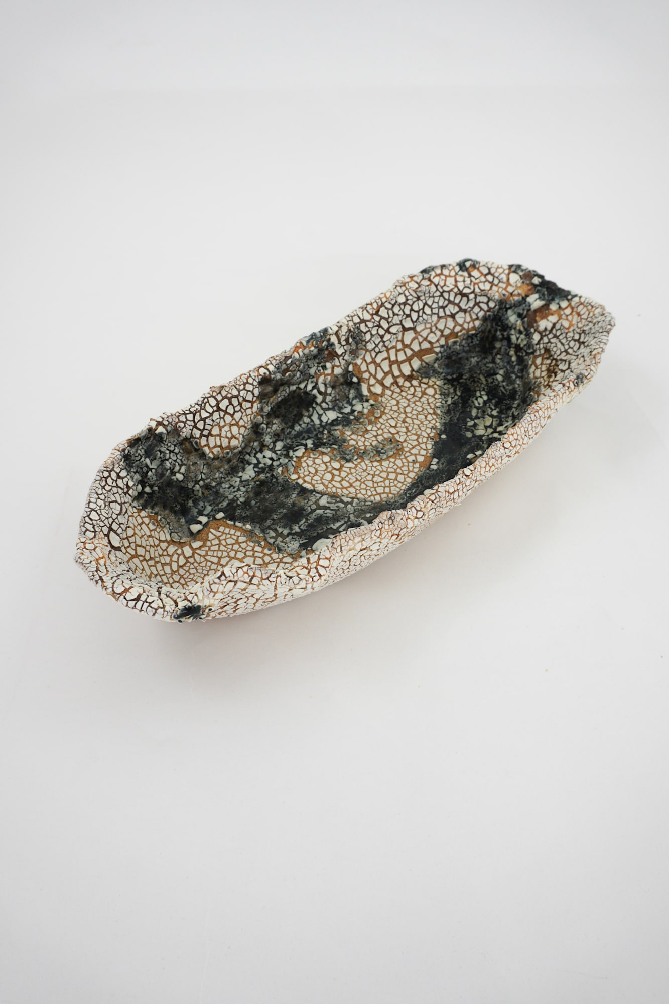 Organic oval shaped, light brown clay with dark blue glaze and white crawl covering the entire bowl.