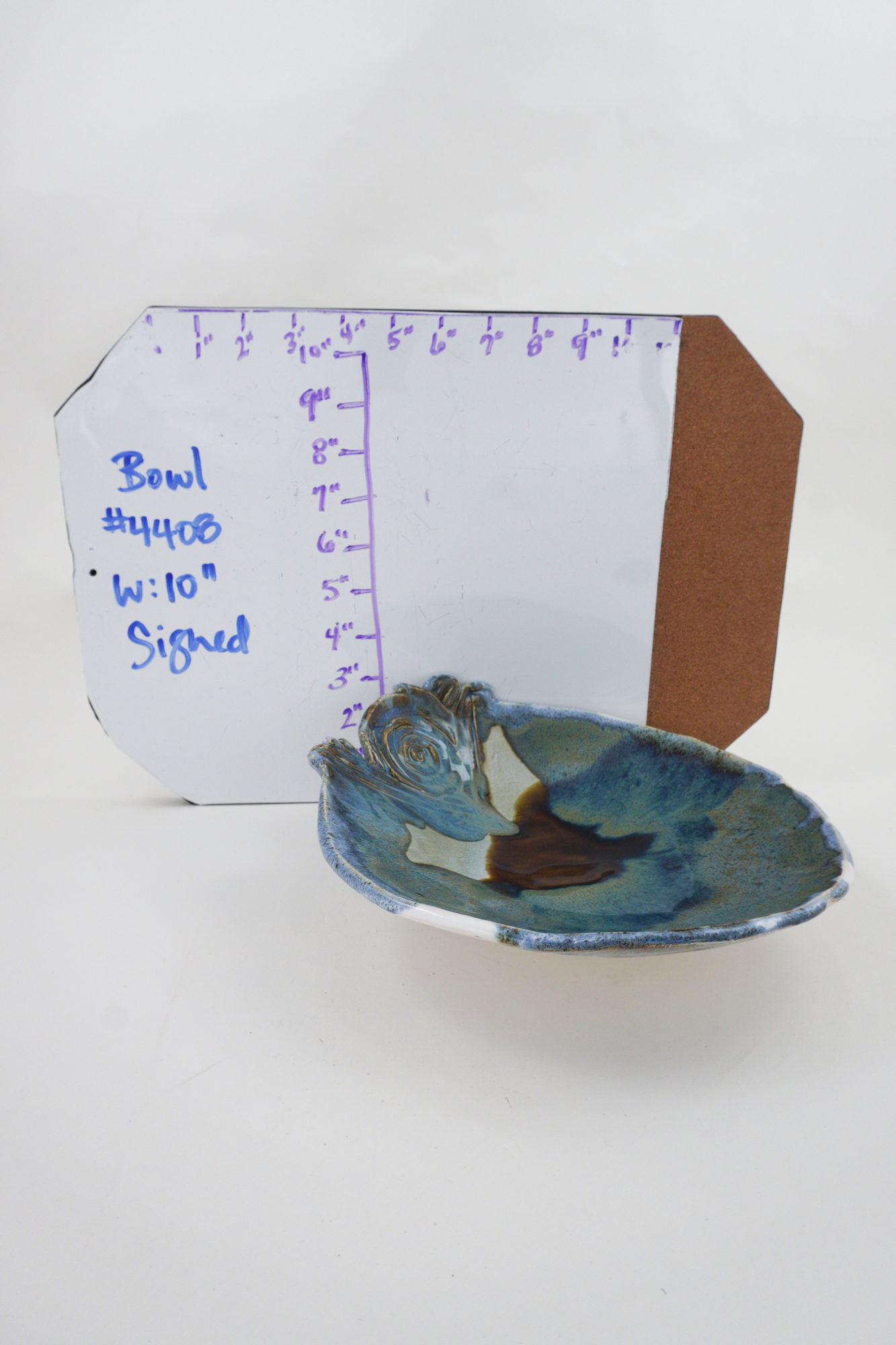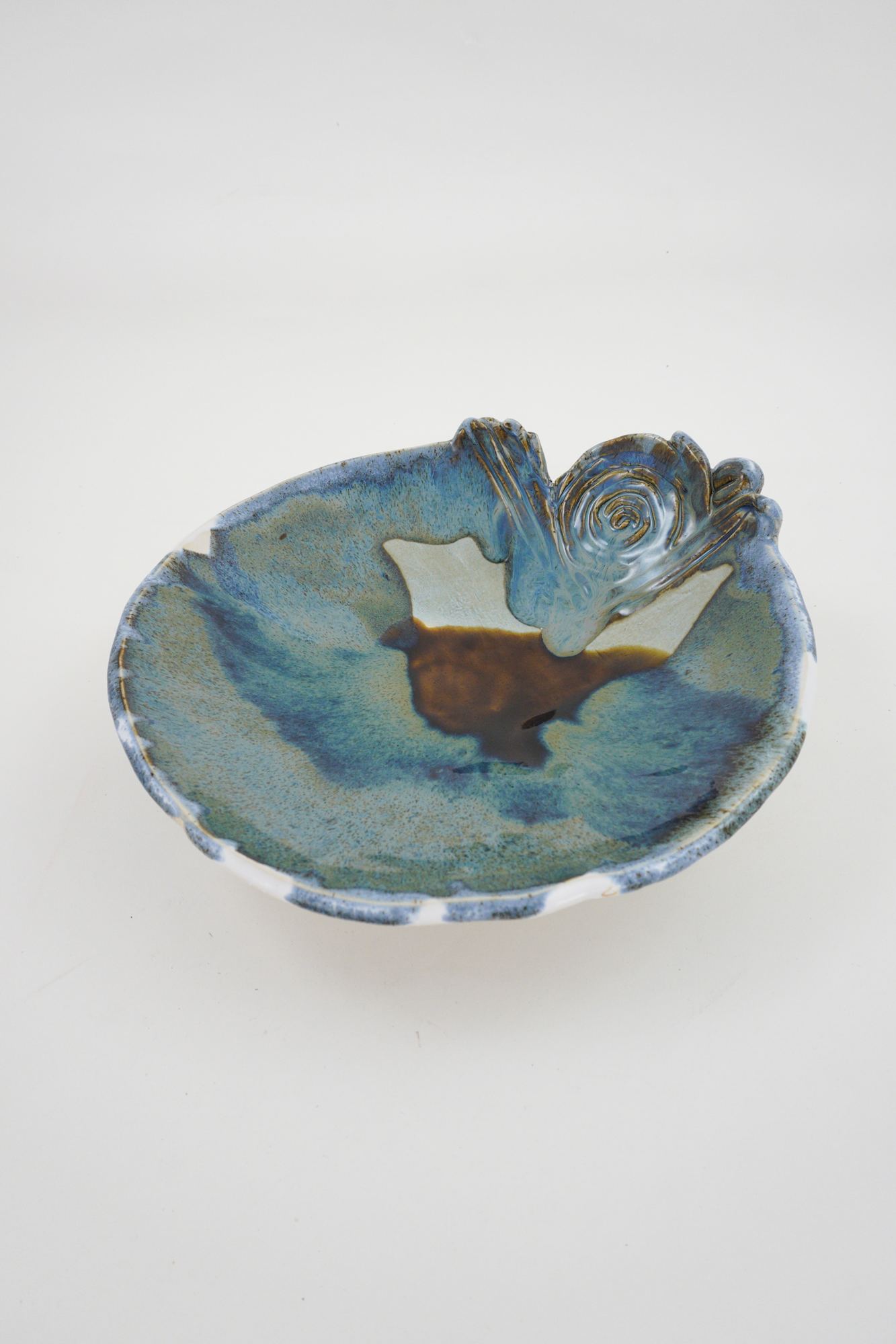 Blue, brown and white underglaze with brown and blue floral shaped coil on top lip of bowl.