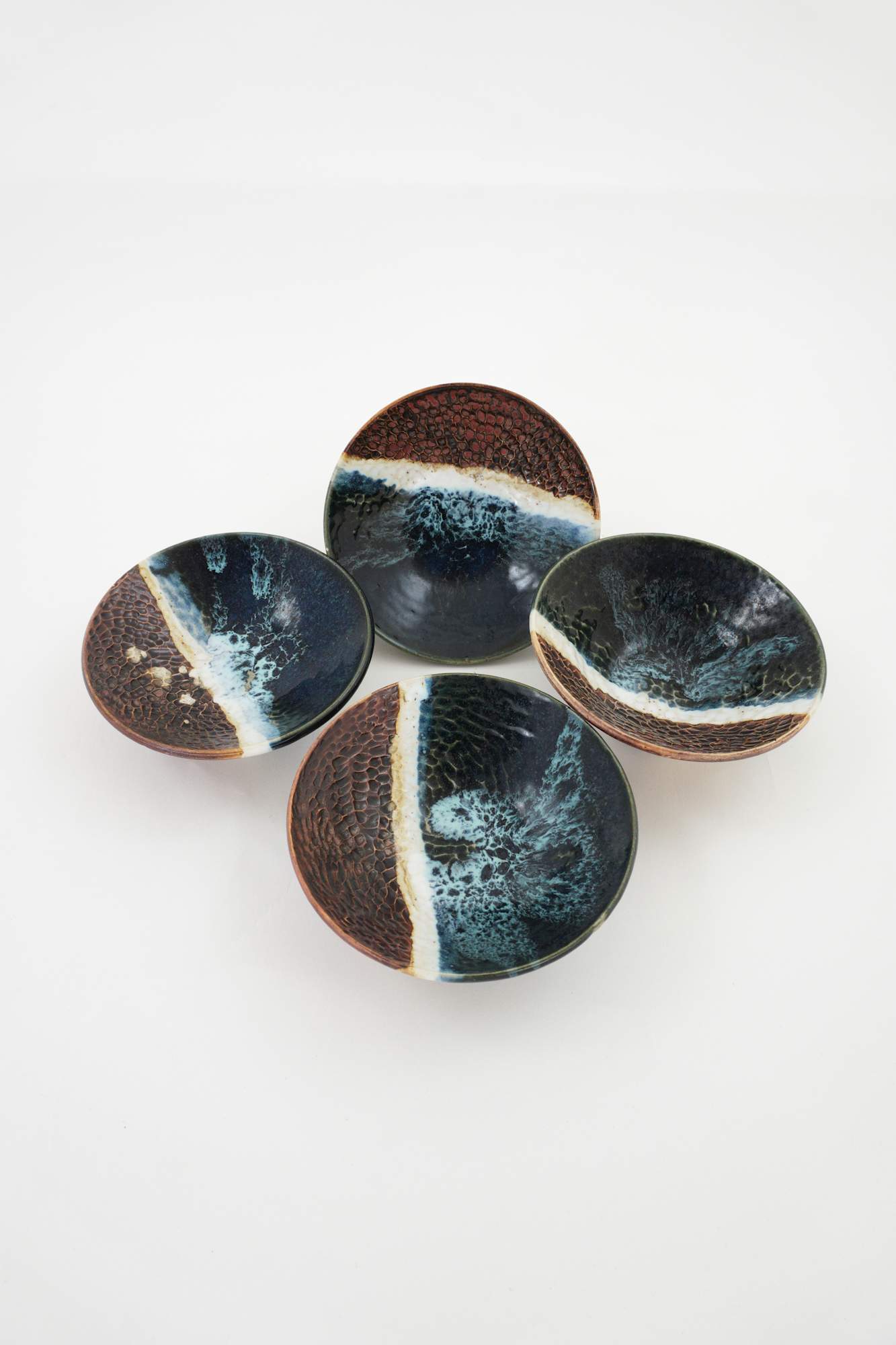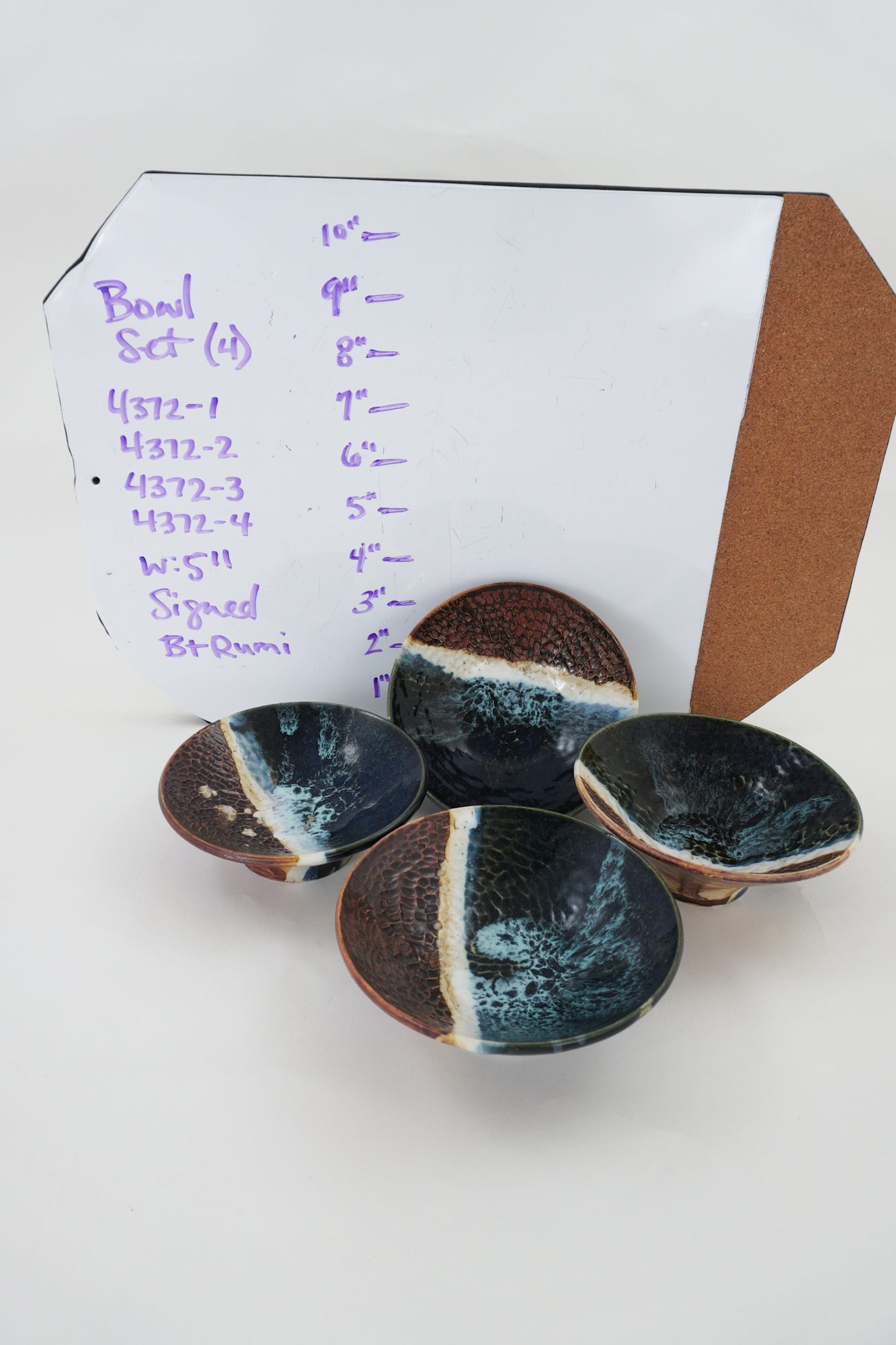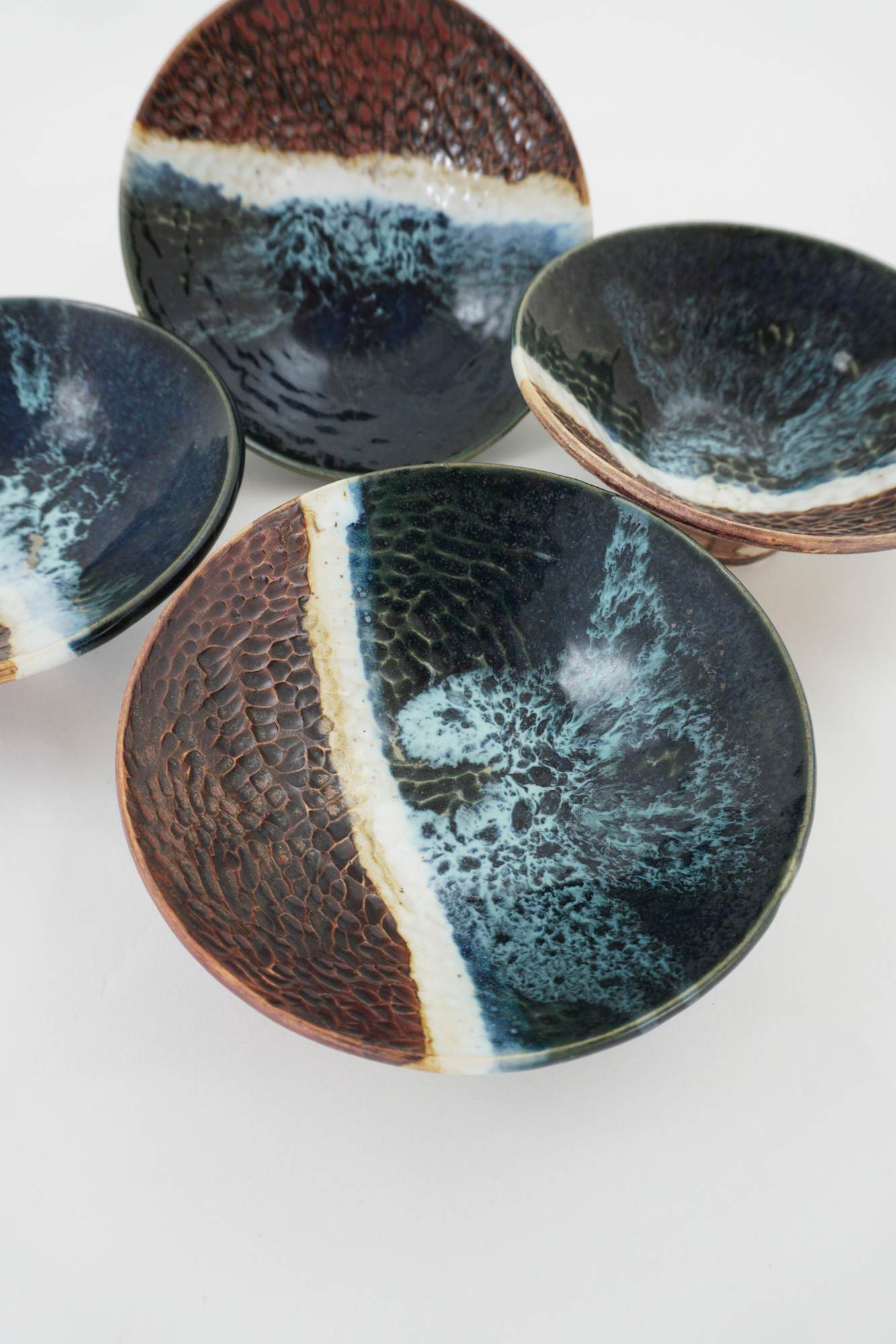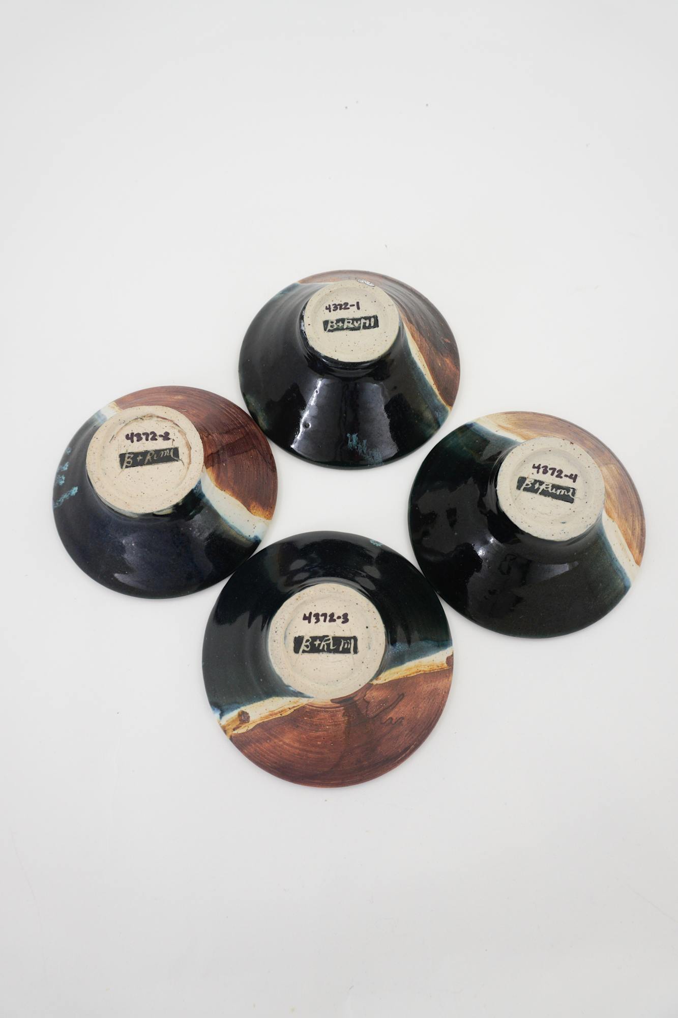 Dark blue and brown underglazed with snakeskin chiseled pattern carved into face of bowls. White stripe across the center. Bottom signed "B+Rumi"
