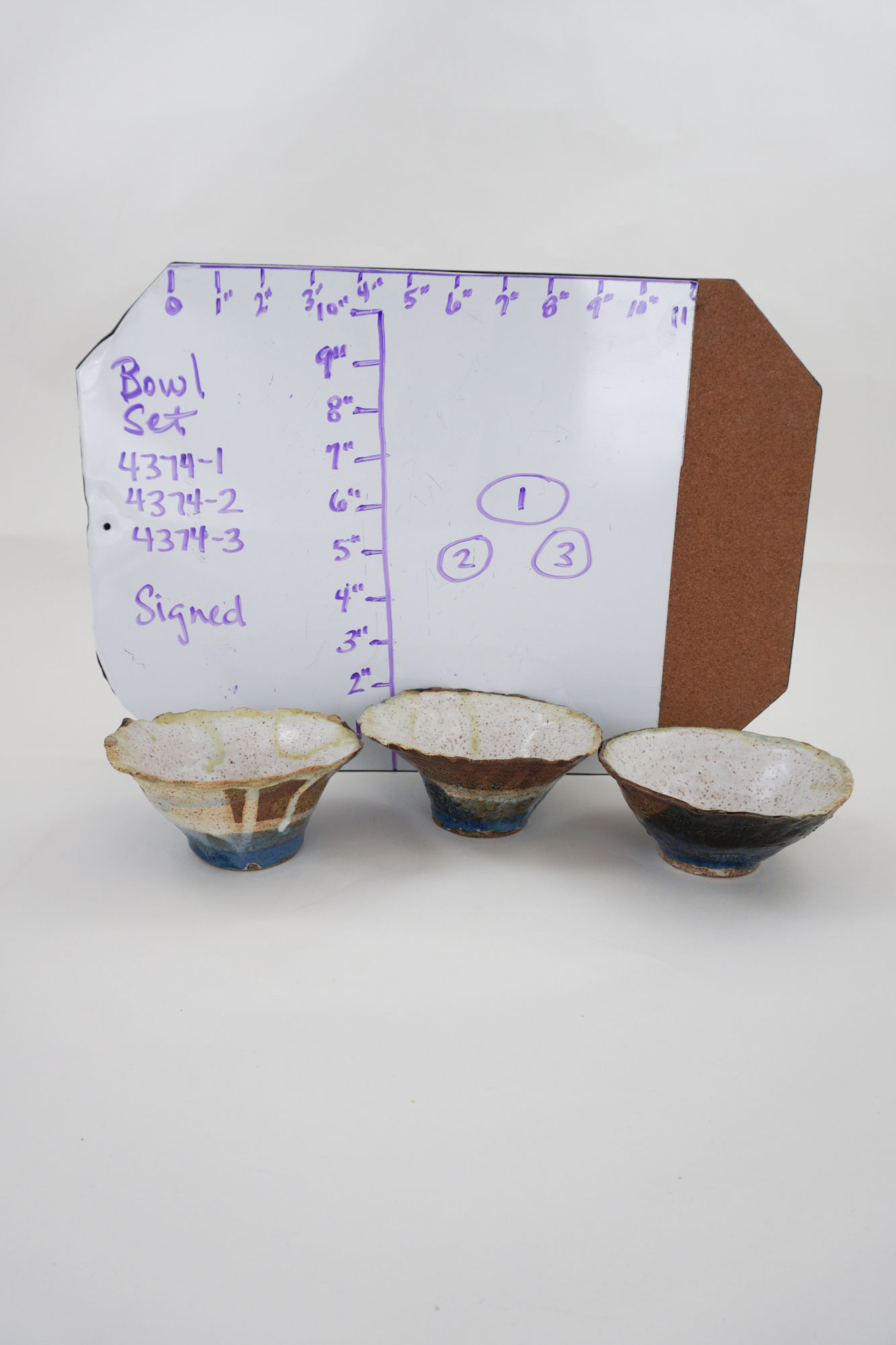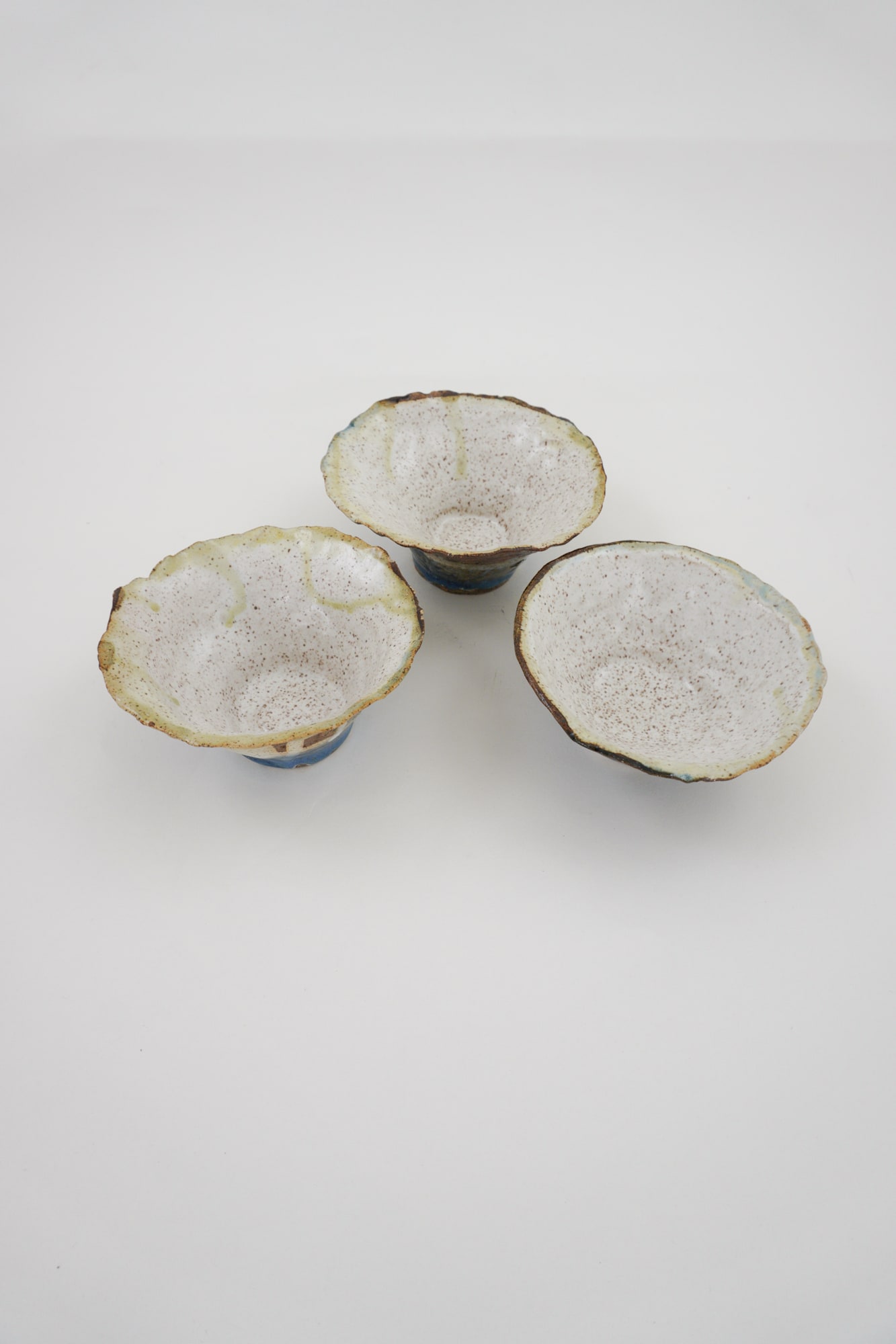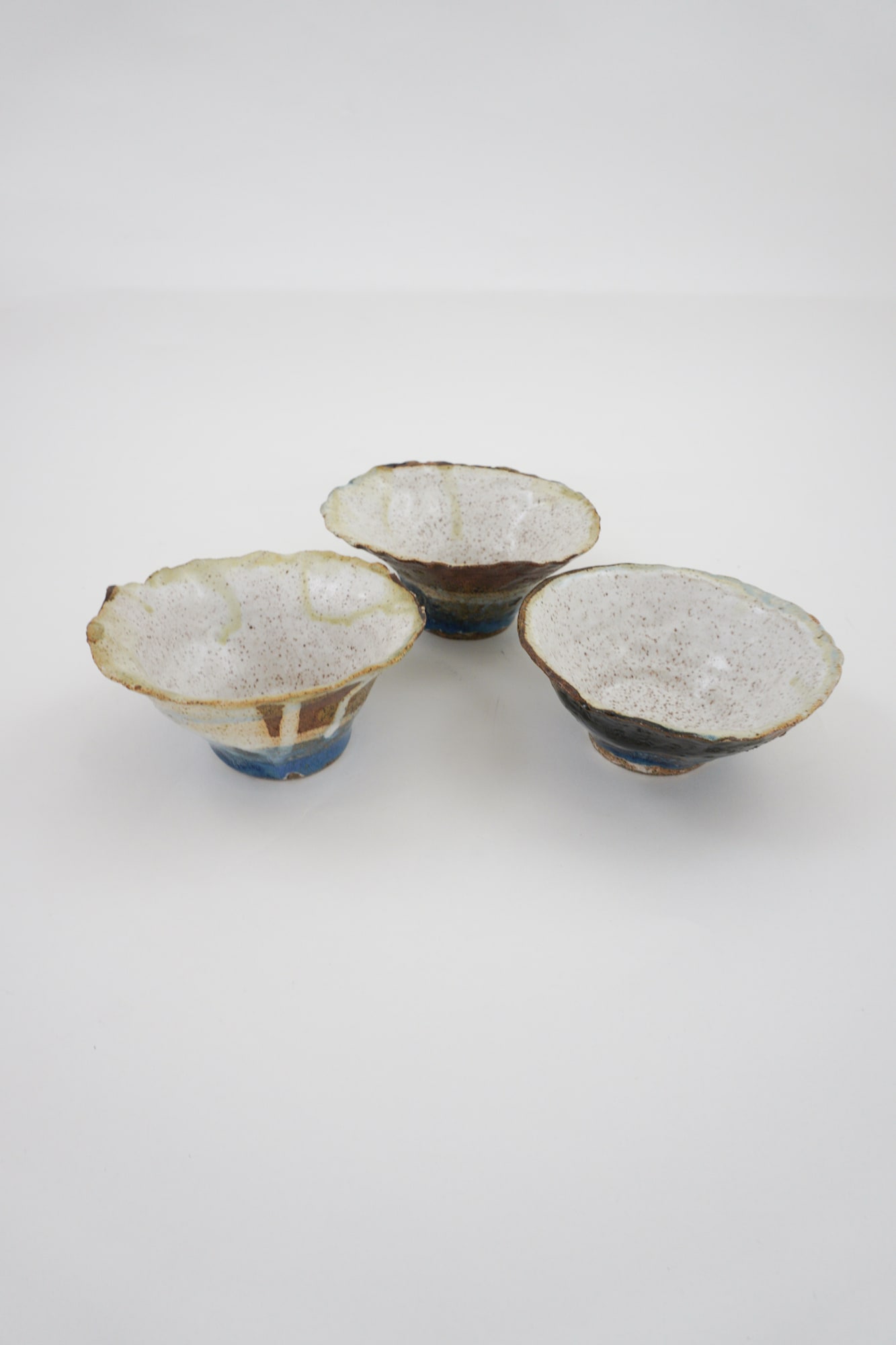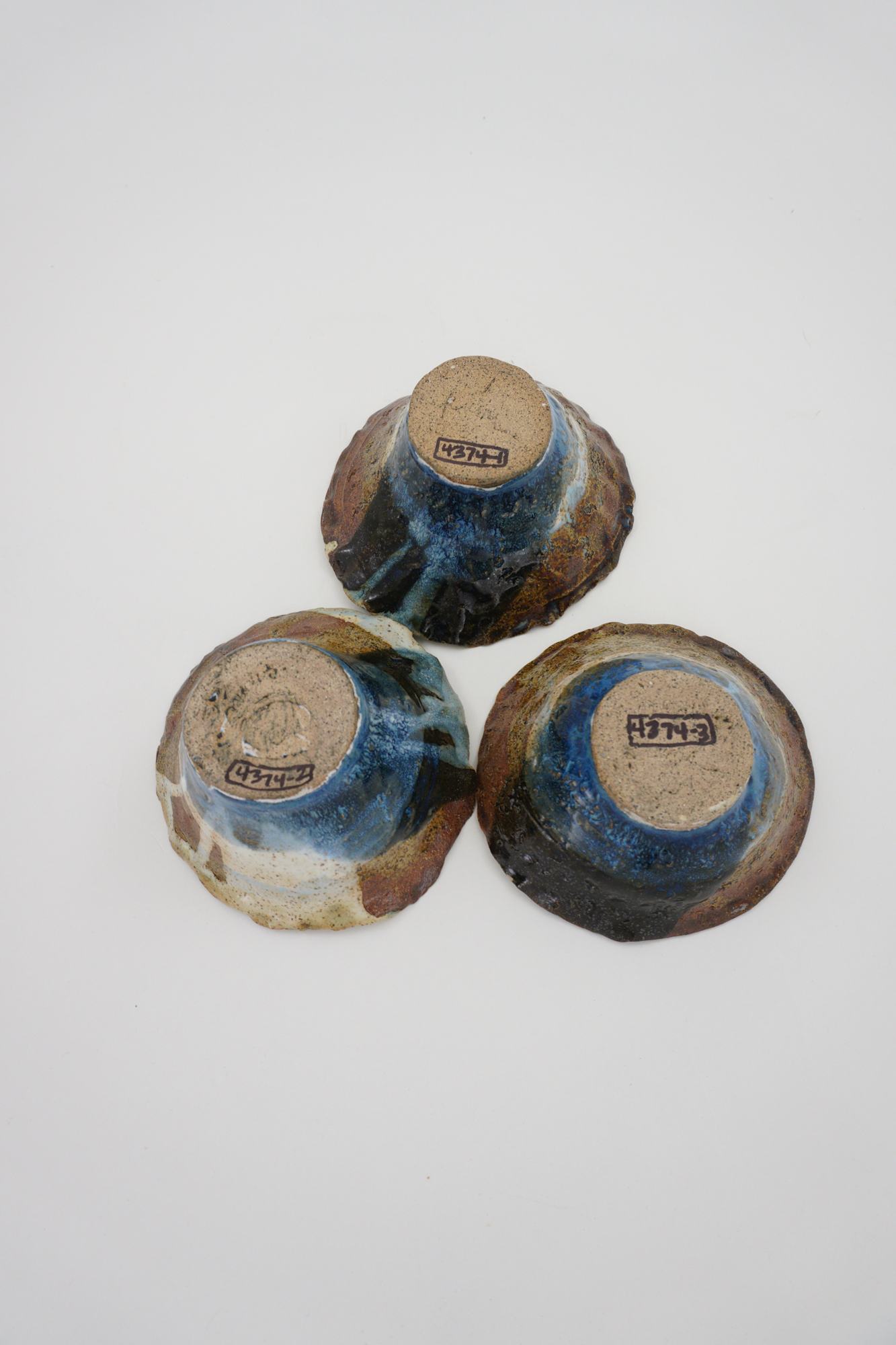 Earthenware, Pale pink glaze on interior, blue, brown and white glaze on exterior.