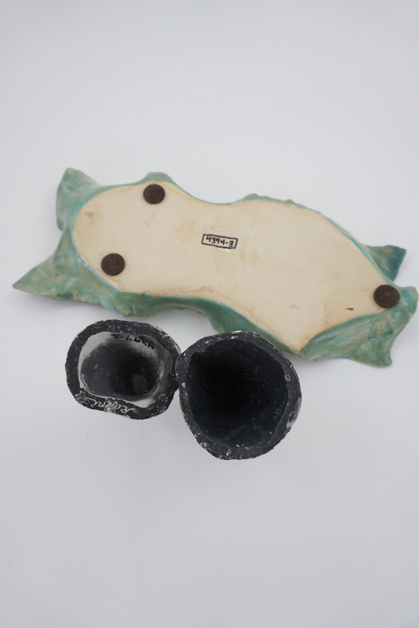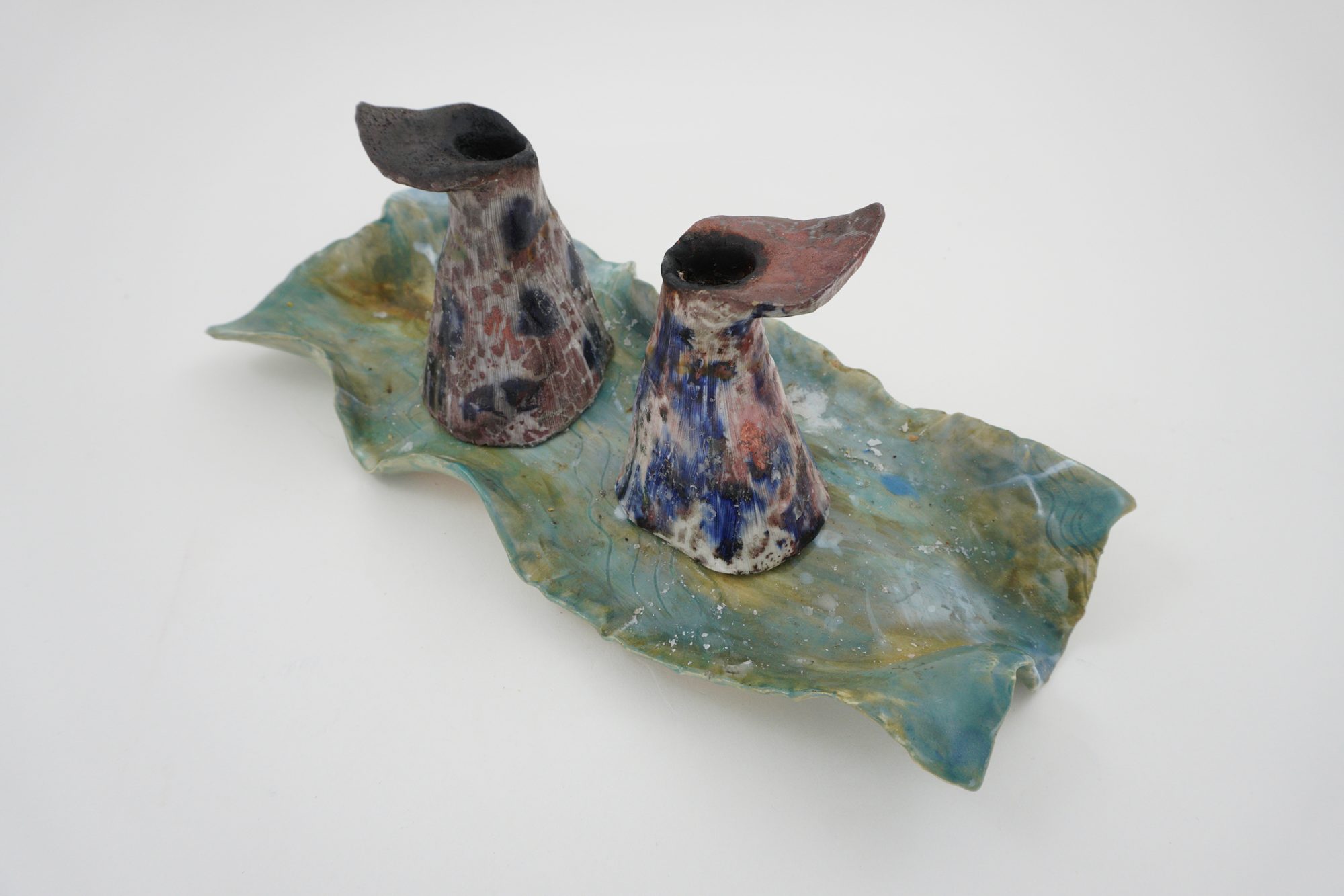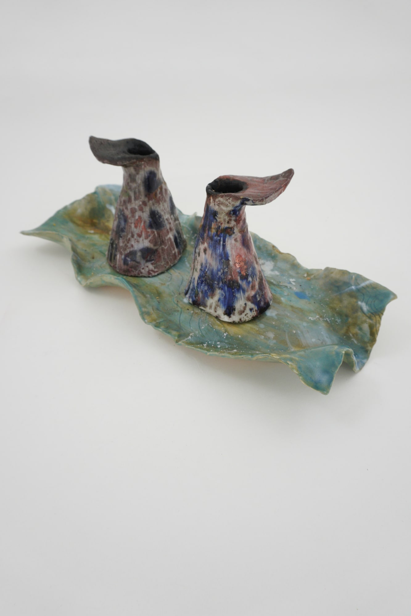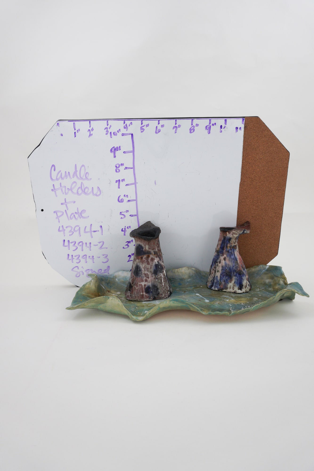 Two blue, brown and white medium height candle holders with a leaf-shaped top. Rectangular fluted-edge plate with light green and brown underglaze.