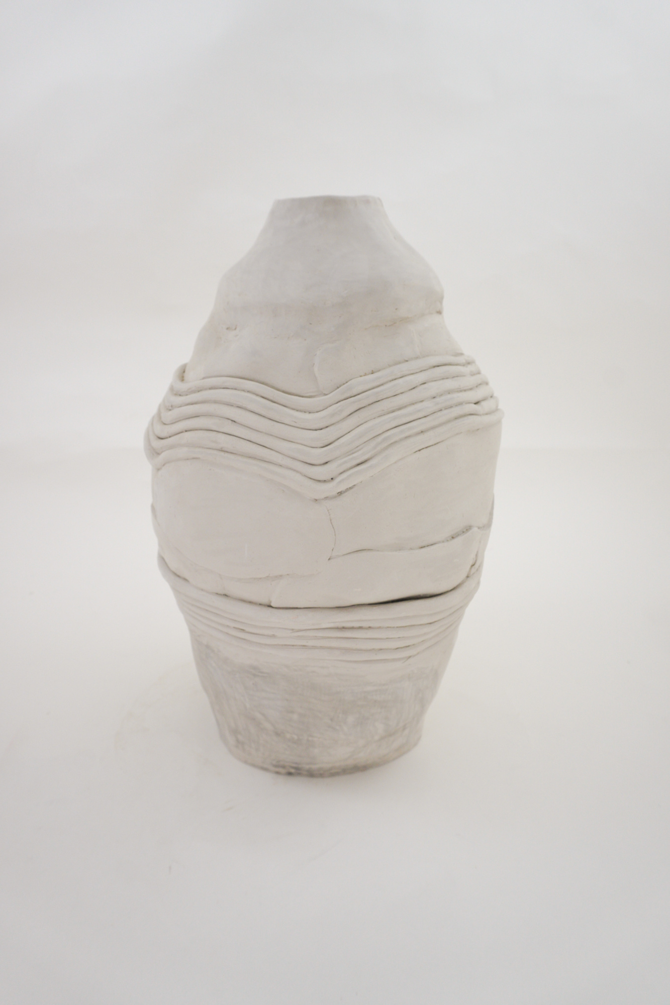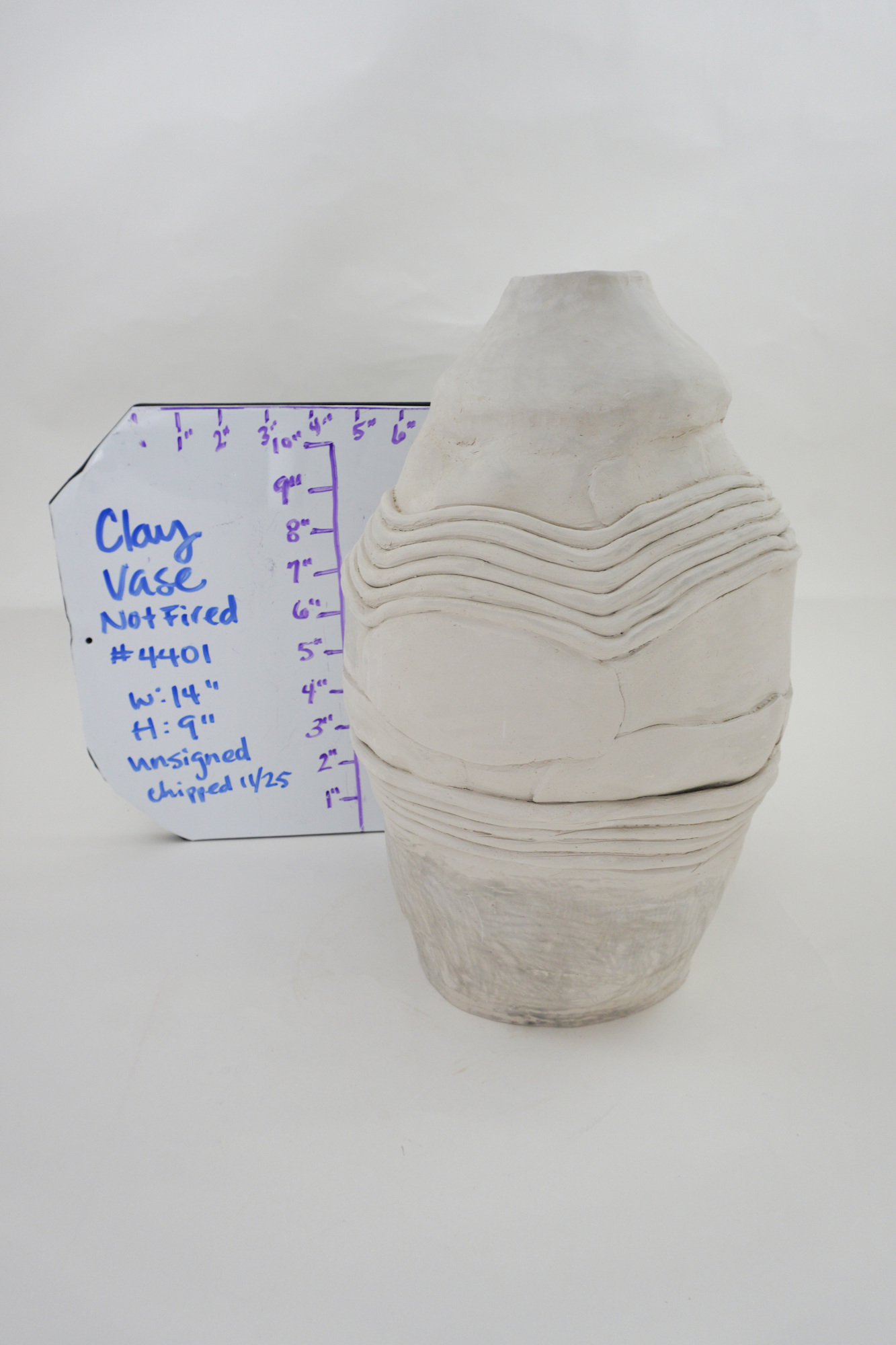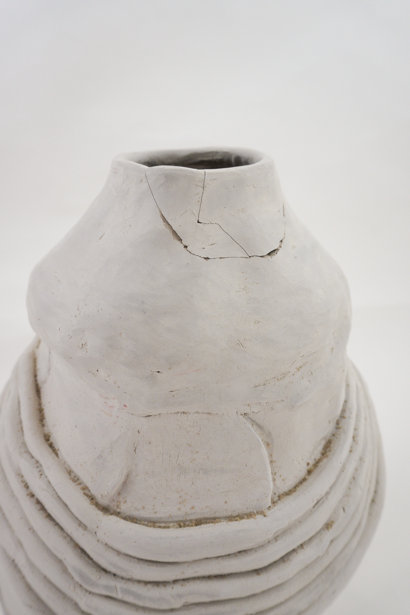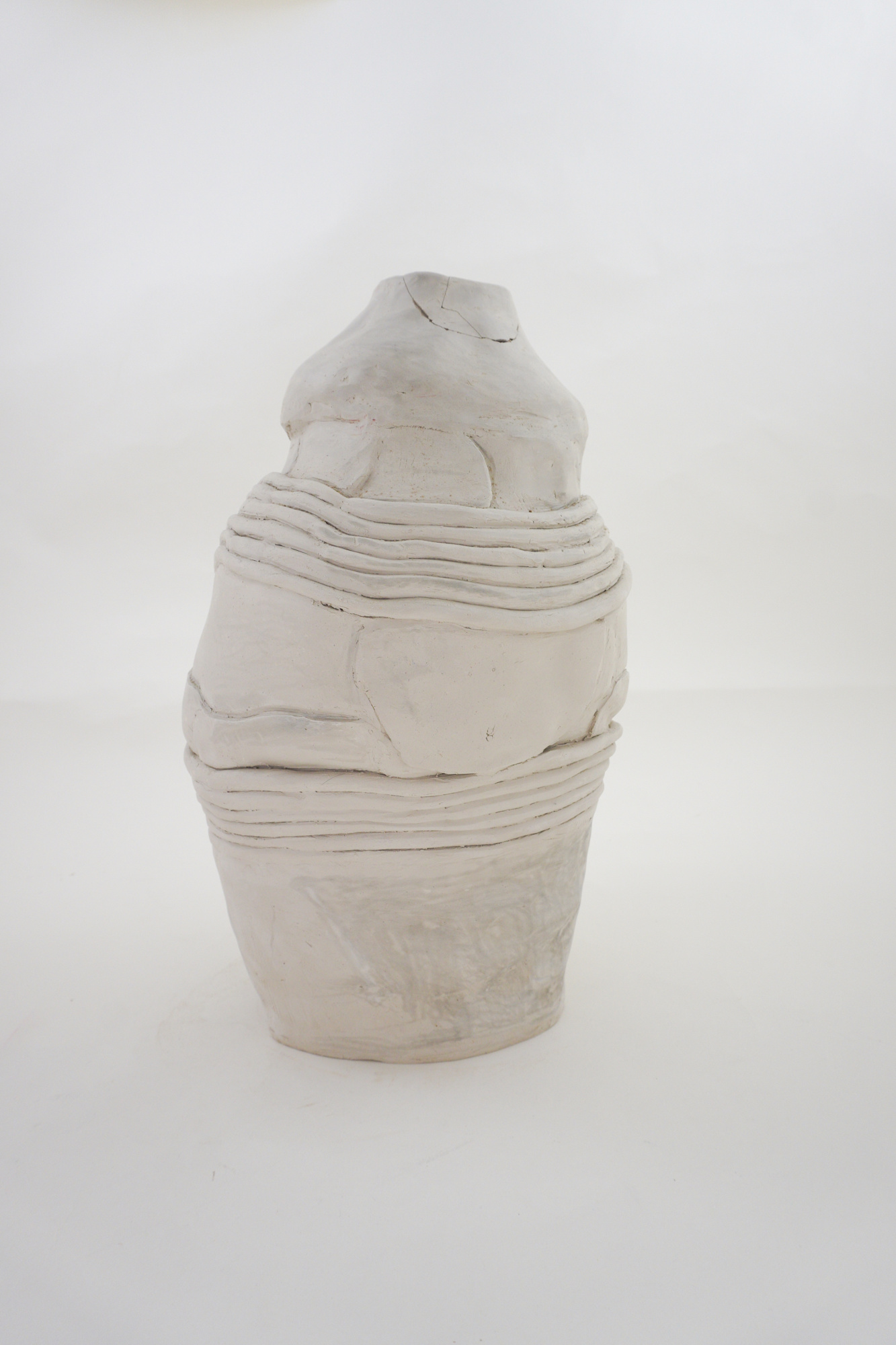 White clay, unfired, unglazed,not signed. Clay coils around mid section of vase.