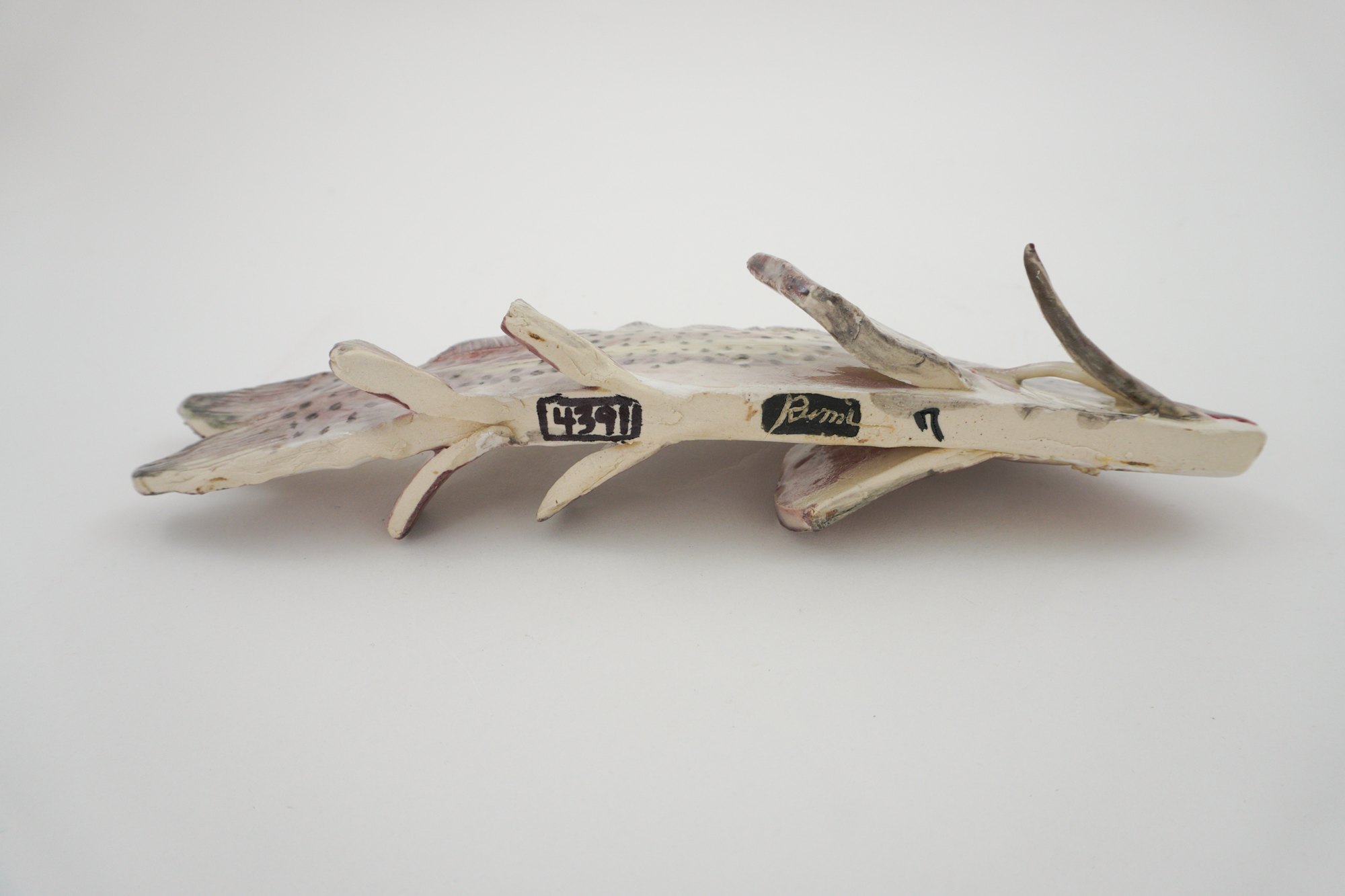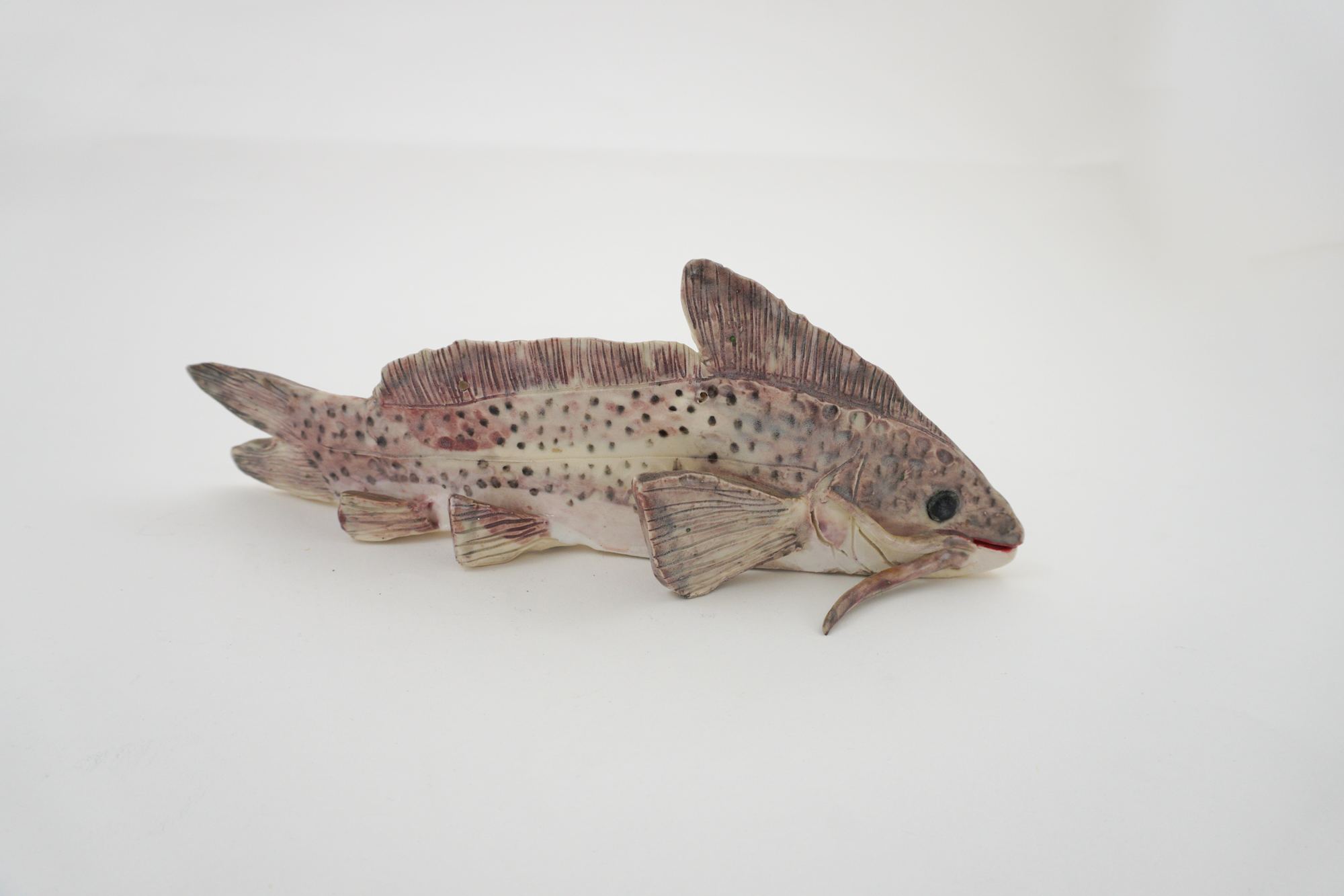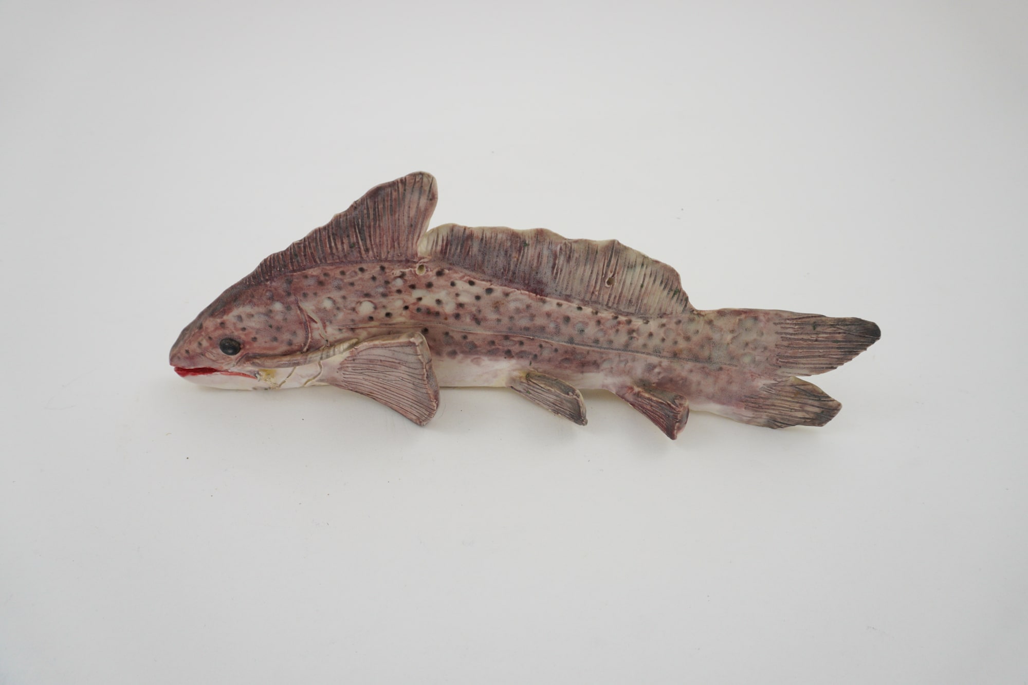 Horizontal fish. Red, brown and white underglaze.