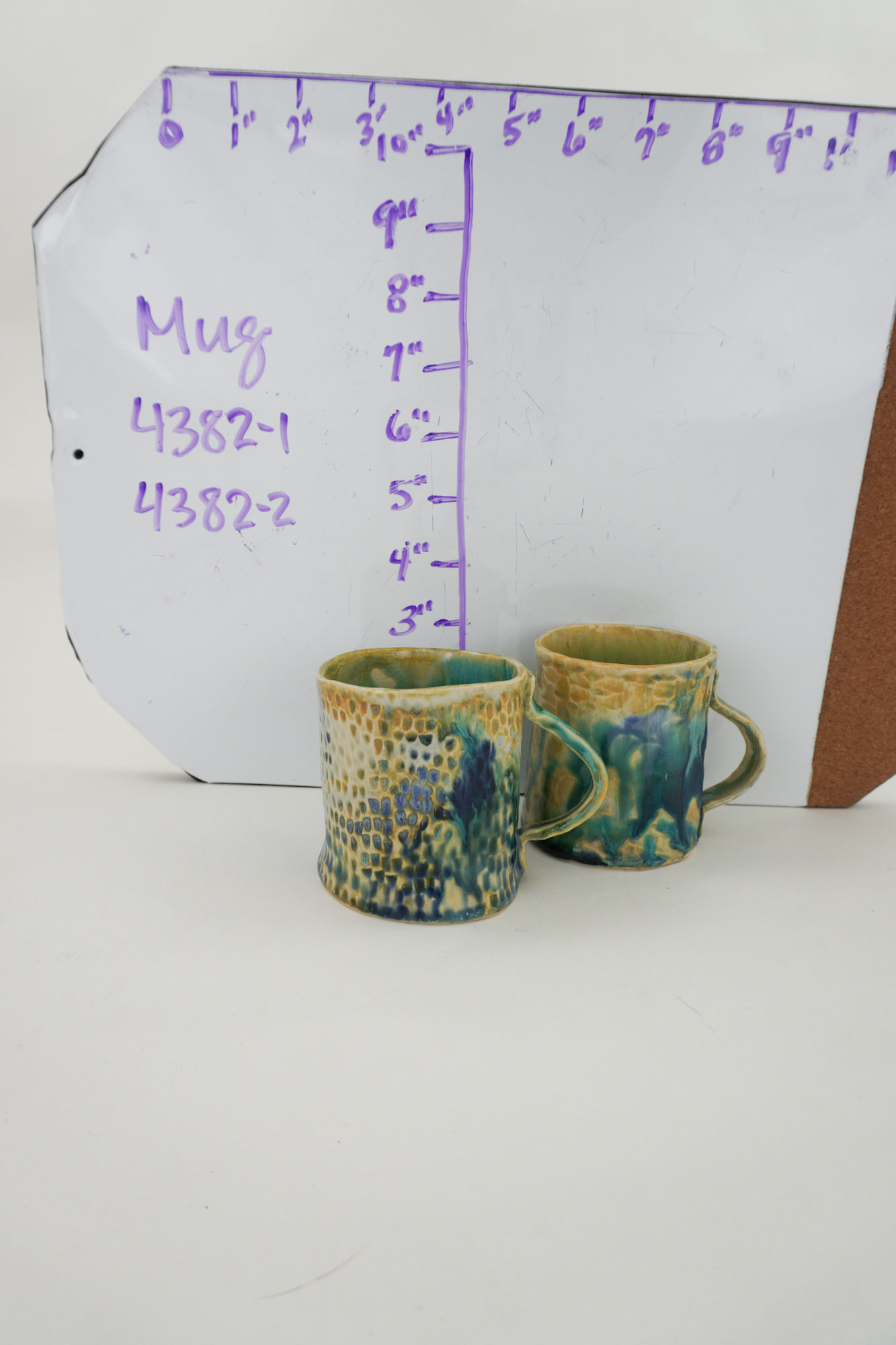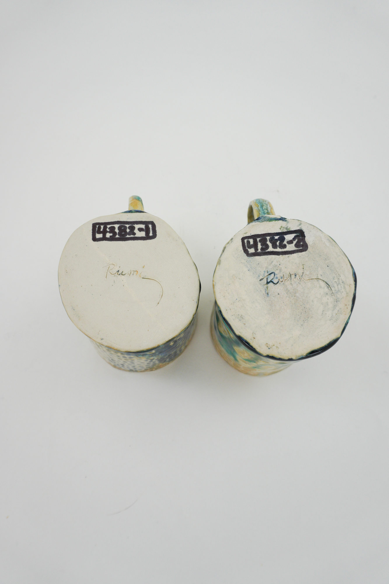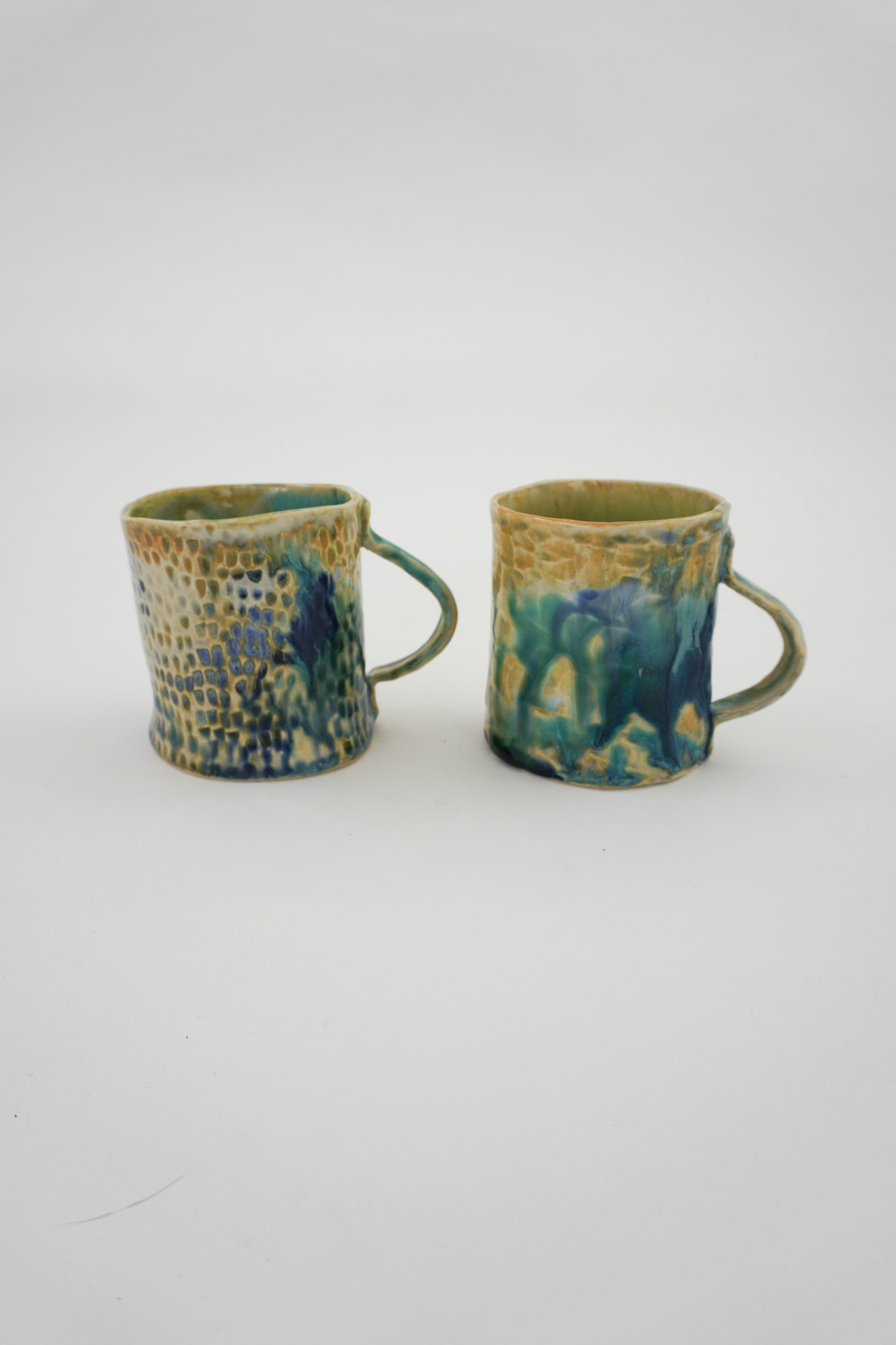Aqua blue, dark blue and light brown underglaze. Chiseled texture on exterior.