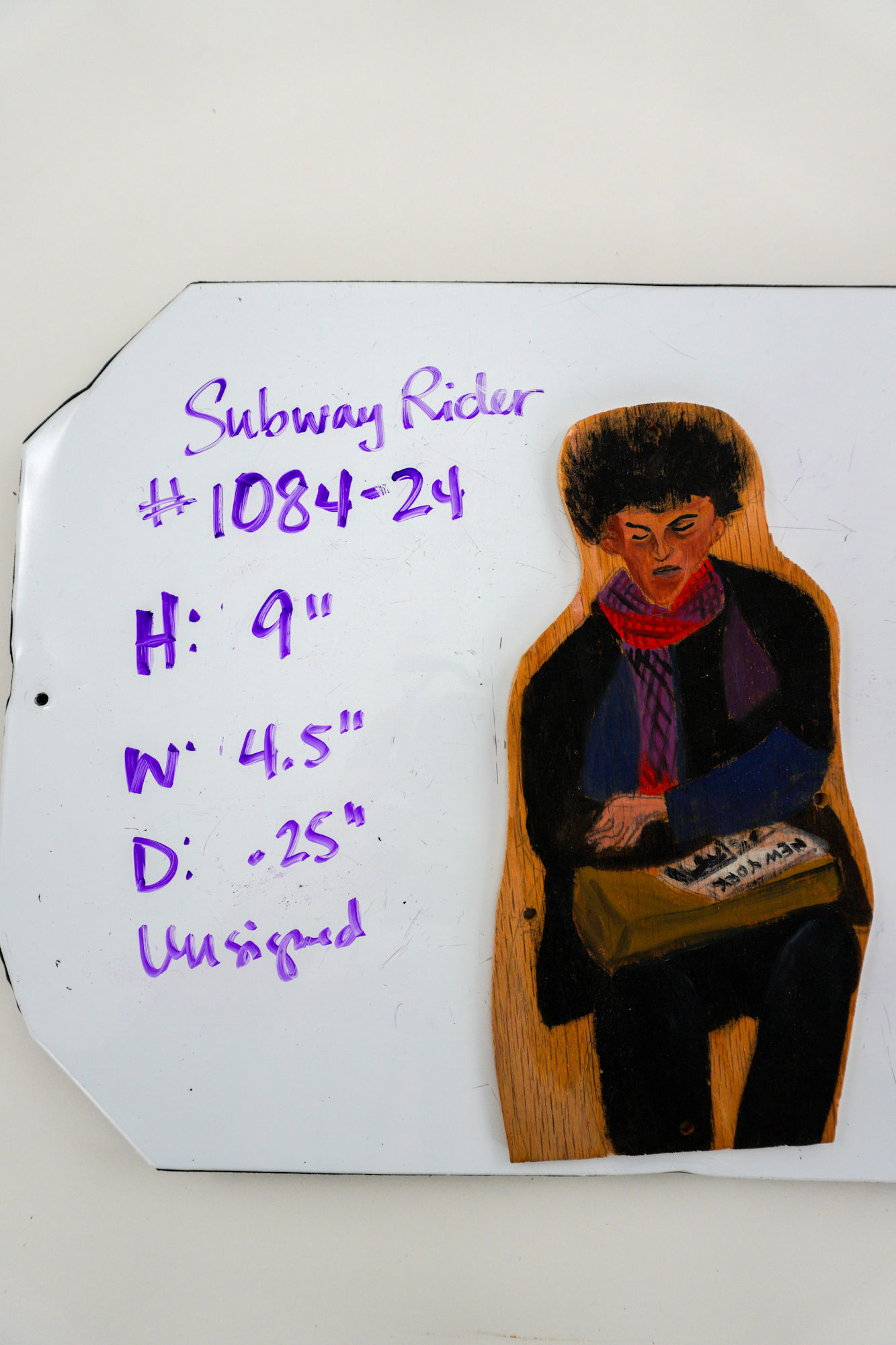 Man with black hair, long black coat, red and purple scarf and newspaper; From an installation titled "Manhattan Peace Shrine with 108 Subway Riders"