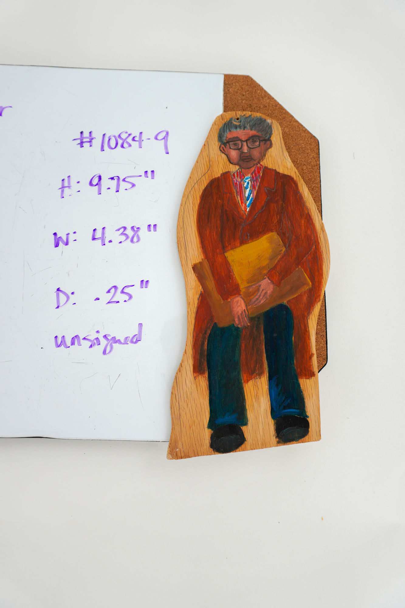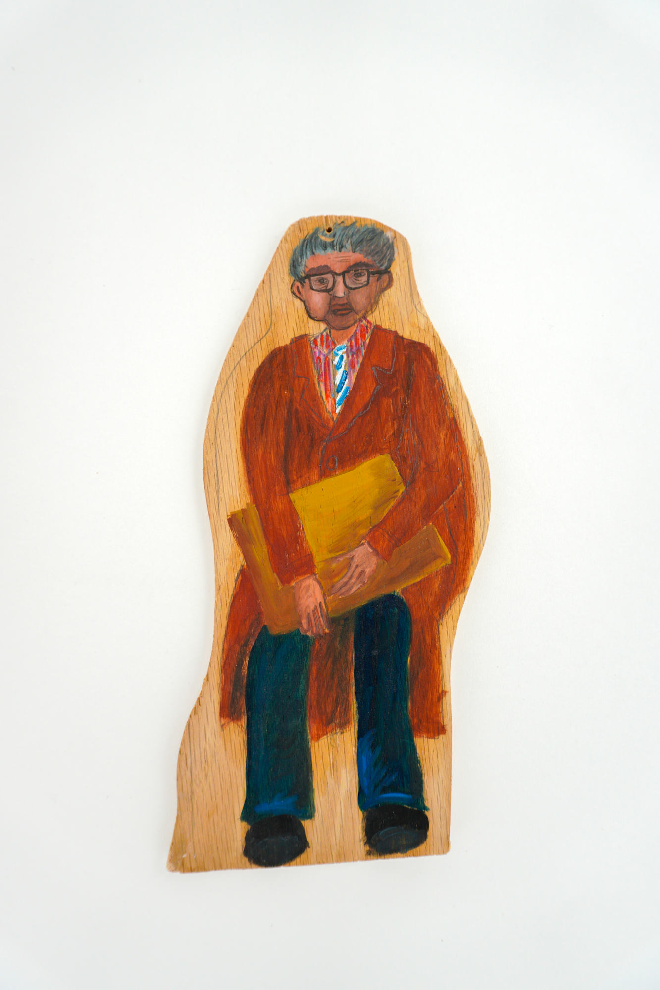 Man with glasses, brown coat, red striped shirt and blue striped tie; From an installation titled "Manhattan Peace Shrine with 108 Subway Riders"