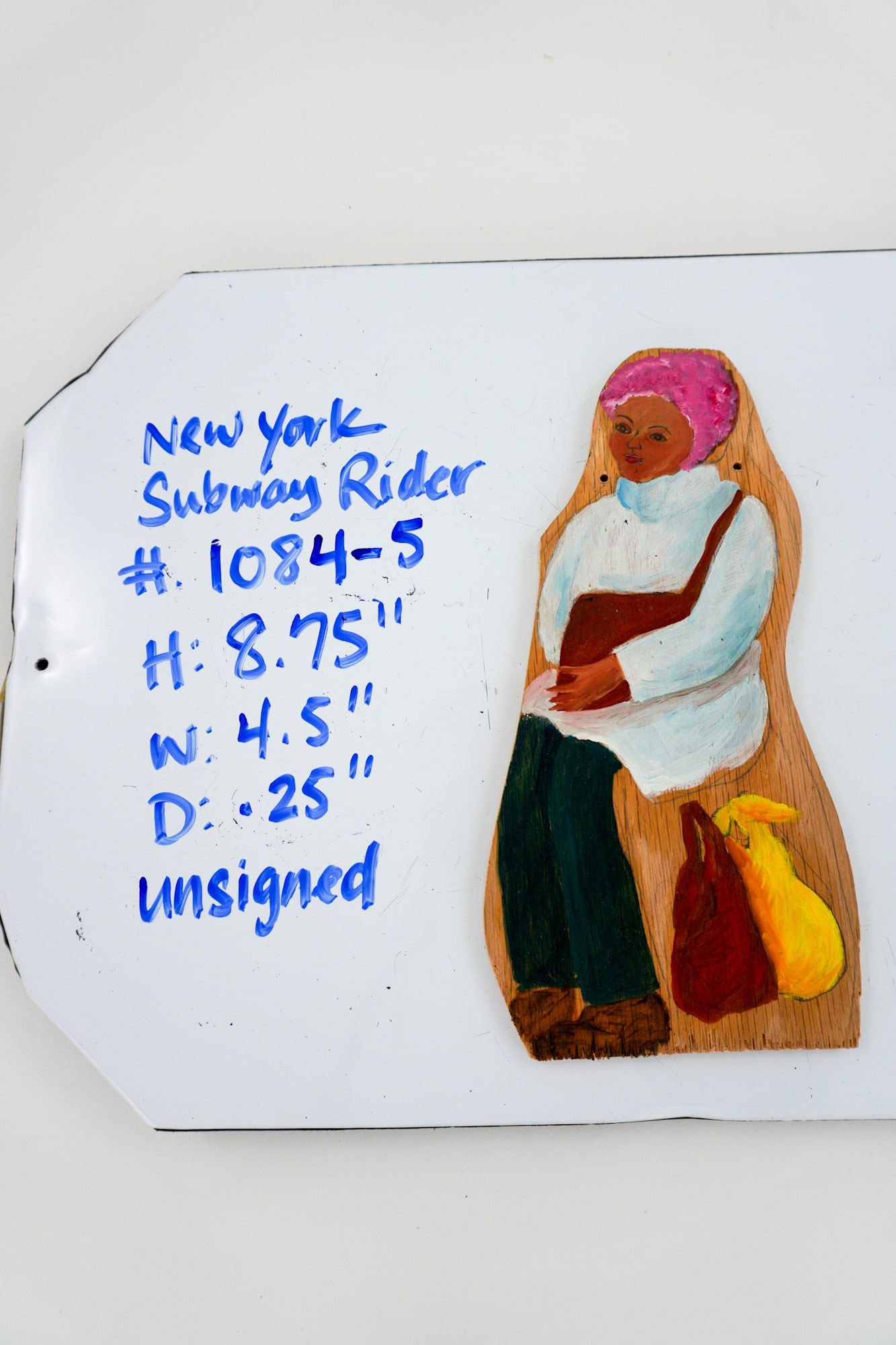 Woman with pink hat, white shirt, brown purse, 2 shopping bags; From an installation titled "Manhattan Peace Shrine with 108 Subway Riders"