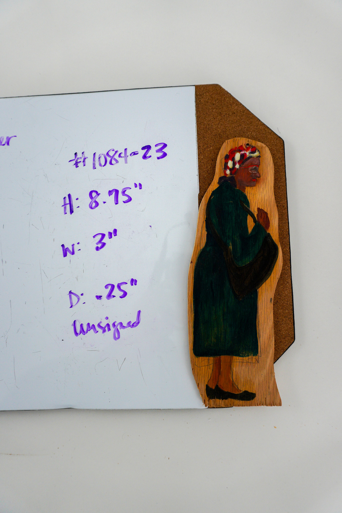 Woman with red and white hat with long green coat and black purse; From an installation titled "Manhattan Peace Shrine with 108 Subway Riders"