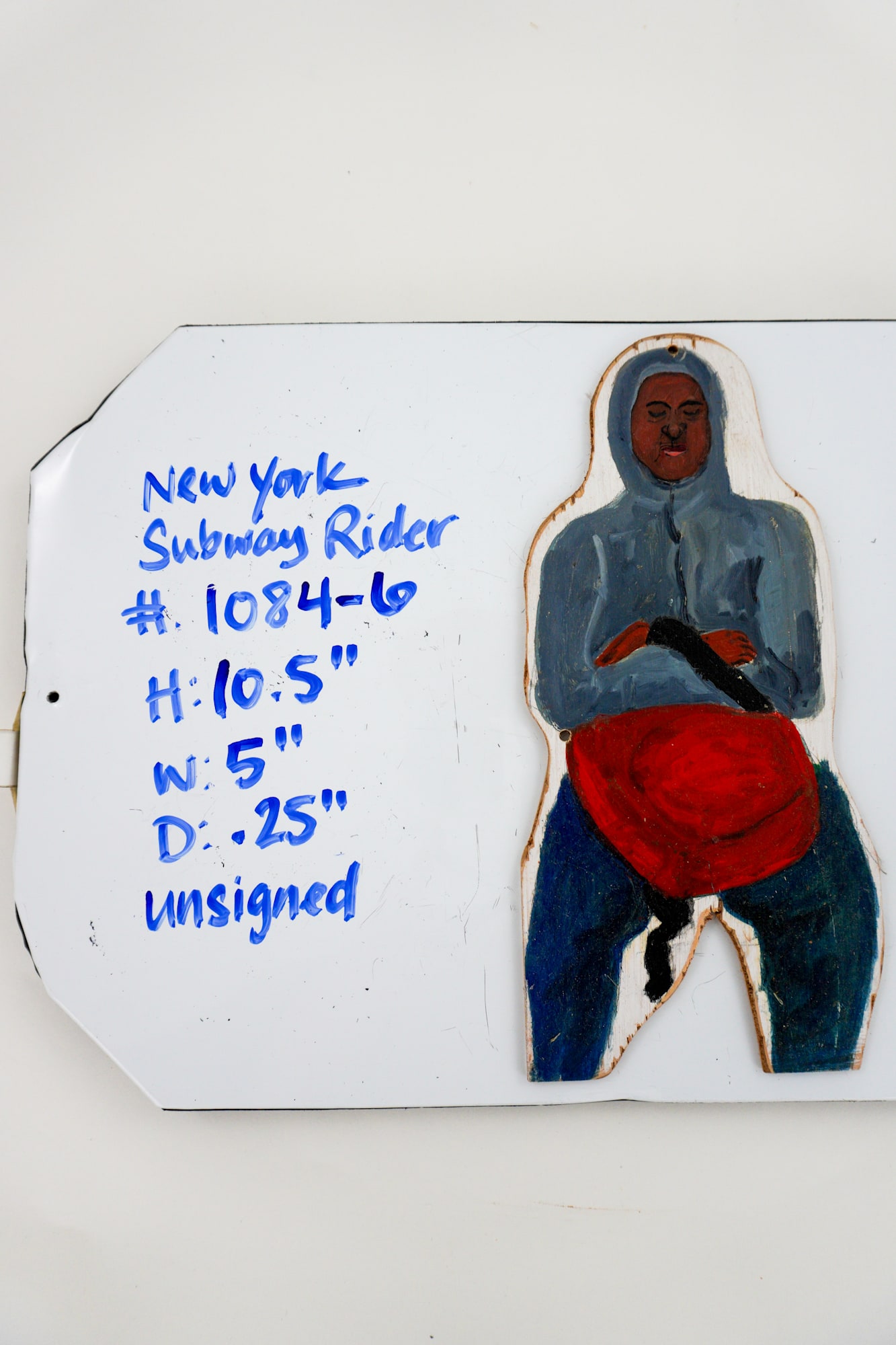 Man in gray hooded jacket with red messenger bag; From an installation titled "Manhattan Peace Shrine with 108 Subway Riders"