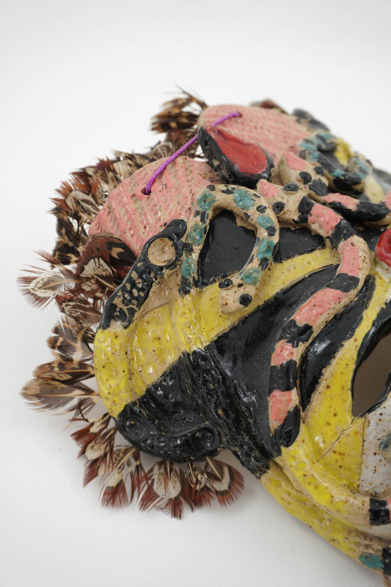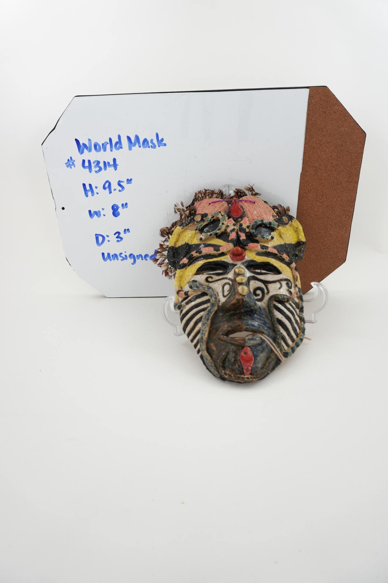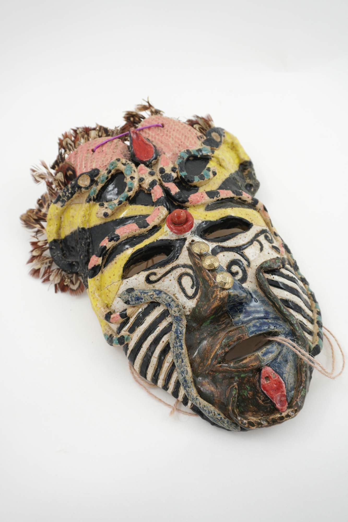 Hand painted with adornments around crown and along nose. Snakes around face.