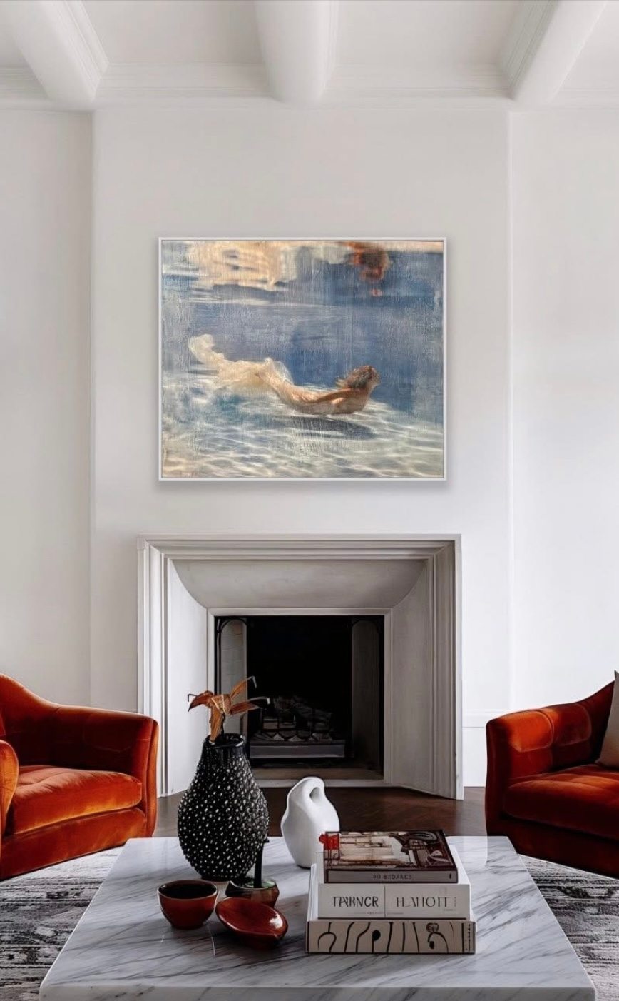 Her form—fluid, luminous—is touched by the same shimmering alchemy that once lifted Aphrodite from the foam. Fabrics billow around her like pale surf, revealing and concealing with the ocean’s own discretion. The water gathers her in soft currents, as though the Nereids themselves guide her ascent.