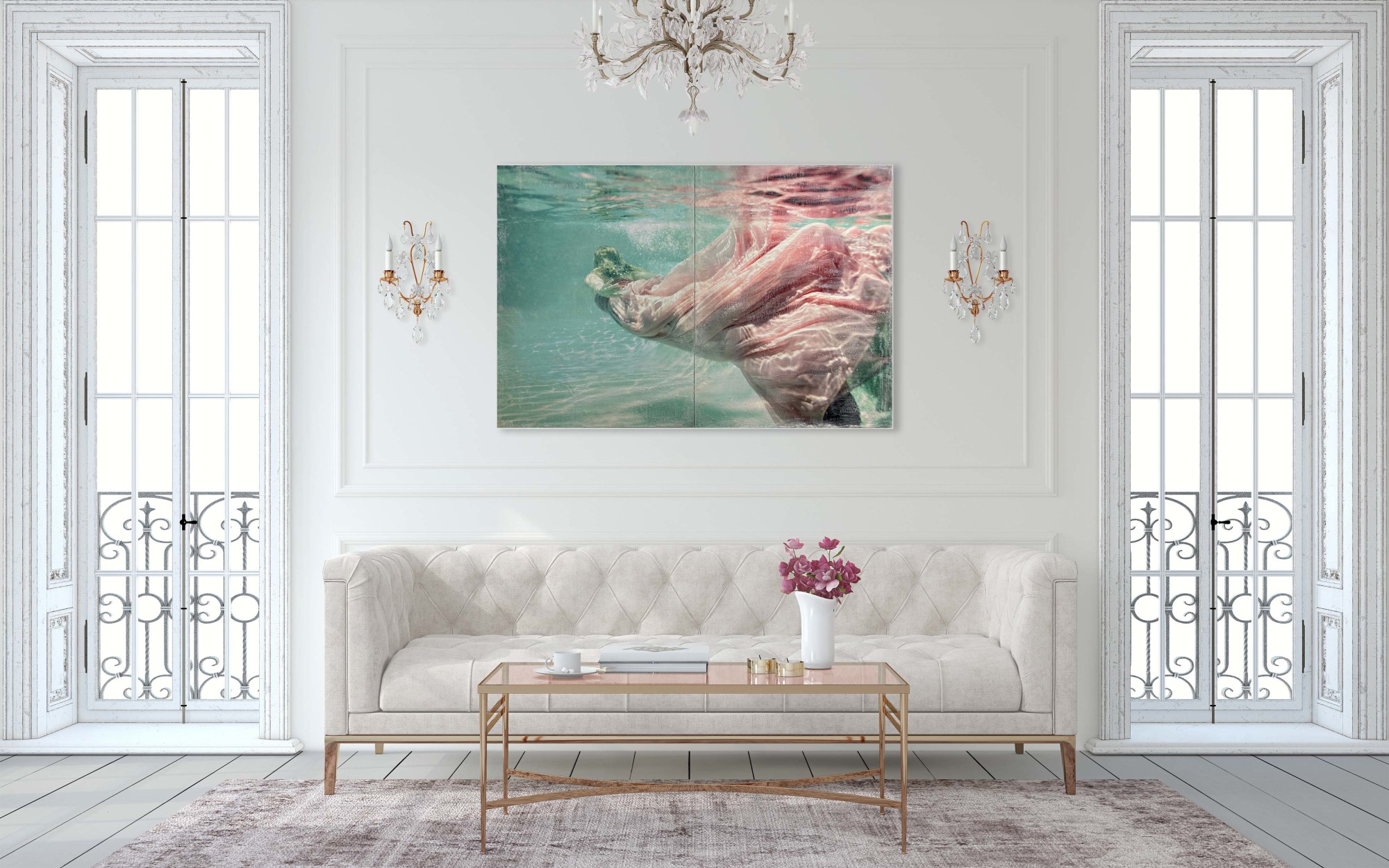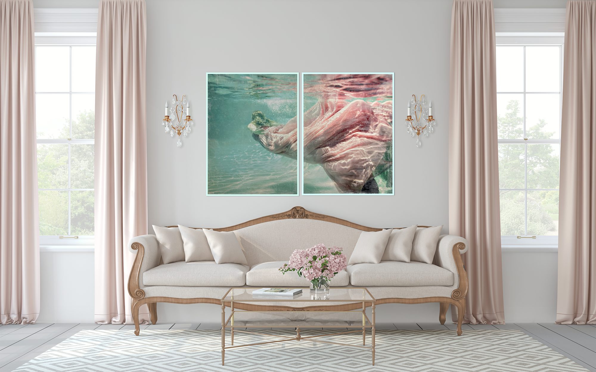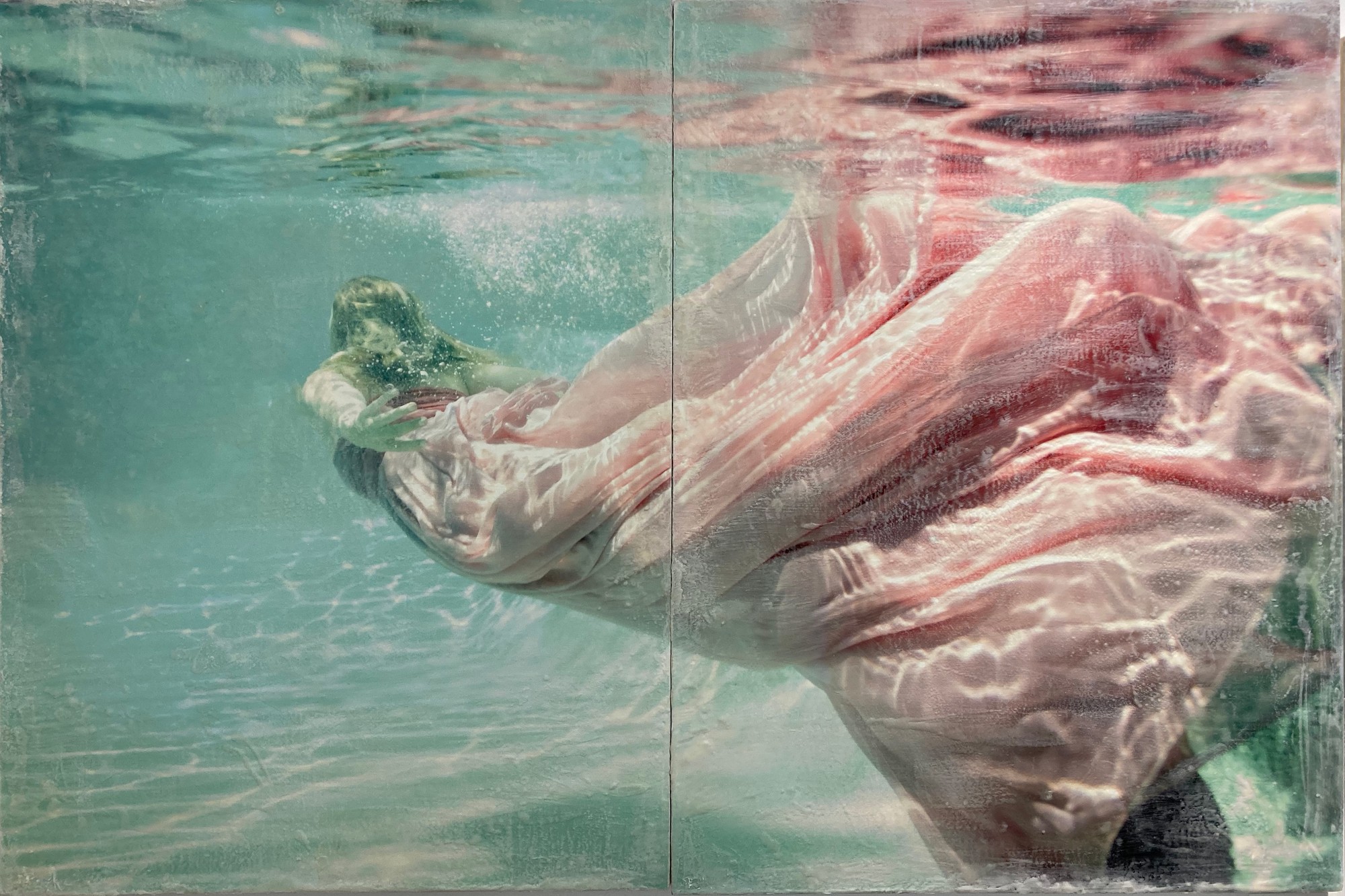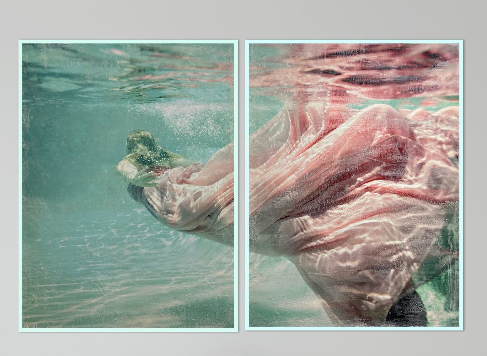 40 x 30 inches each — Encaustic Mixed Media She moves through quiet water, silk drifting like dawn beneath the surface— a gentle bearer of calm, echoing Eirene, ancient goddess of peace, whose presence softens everything she touches.