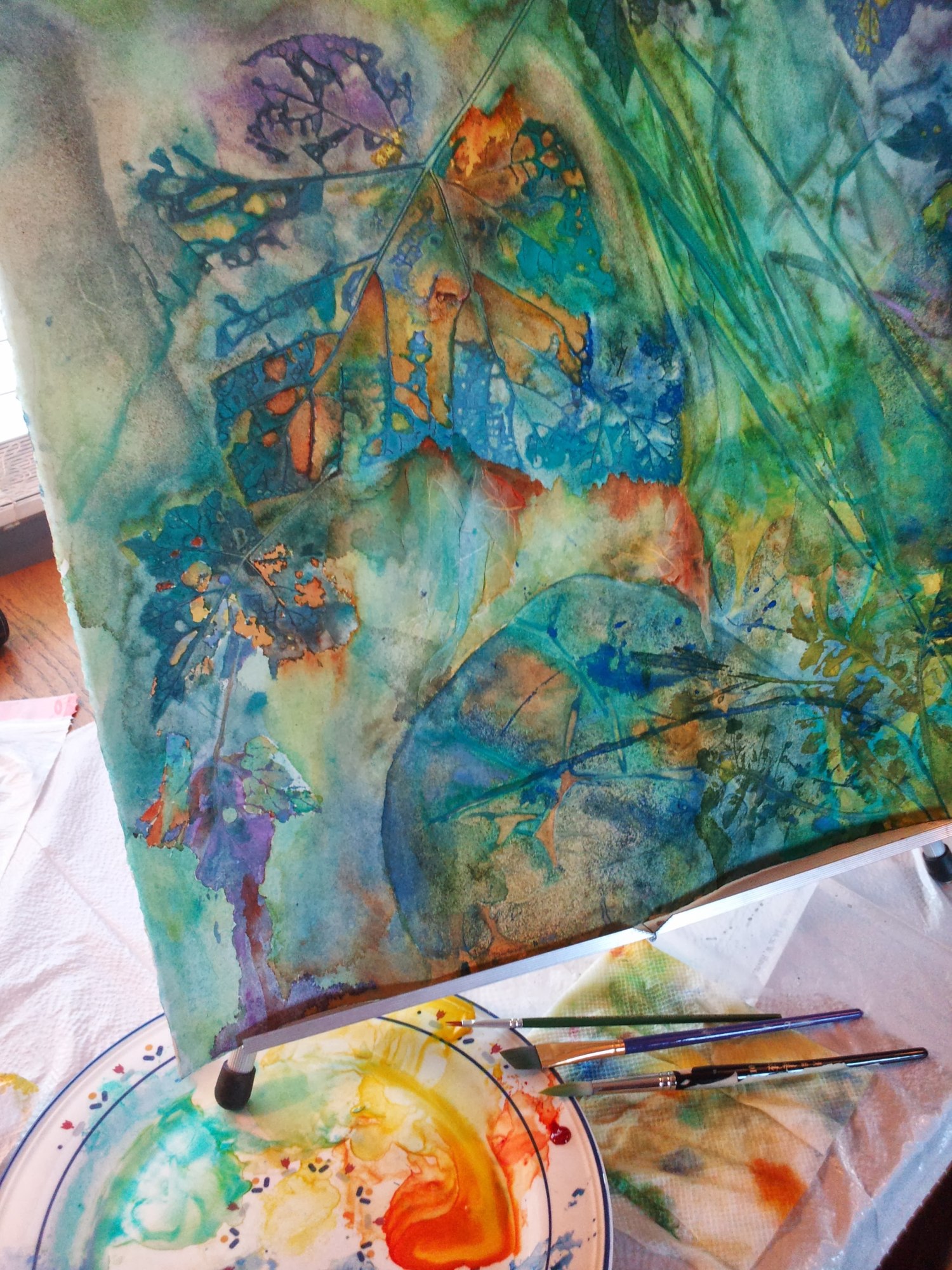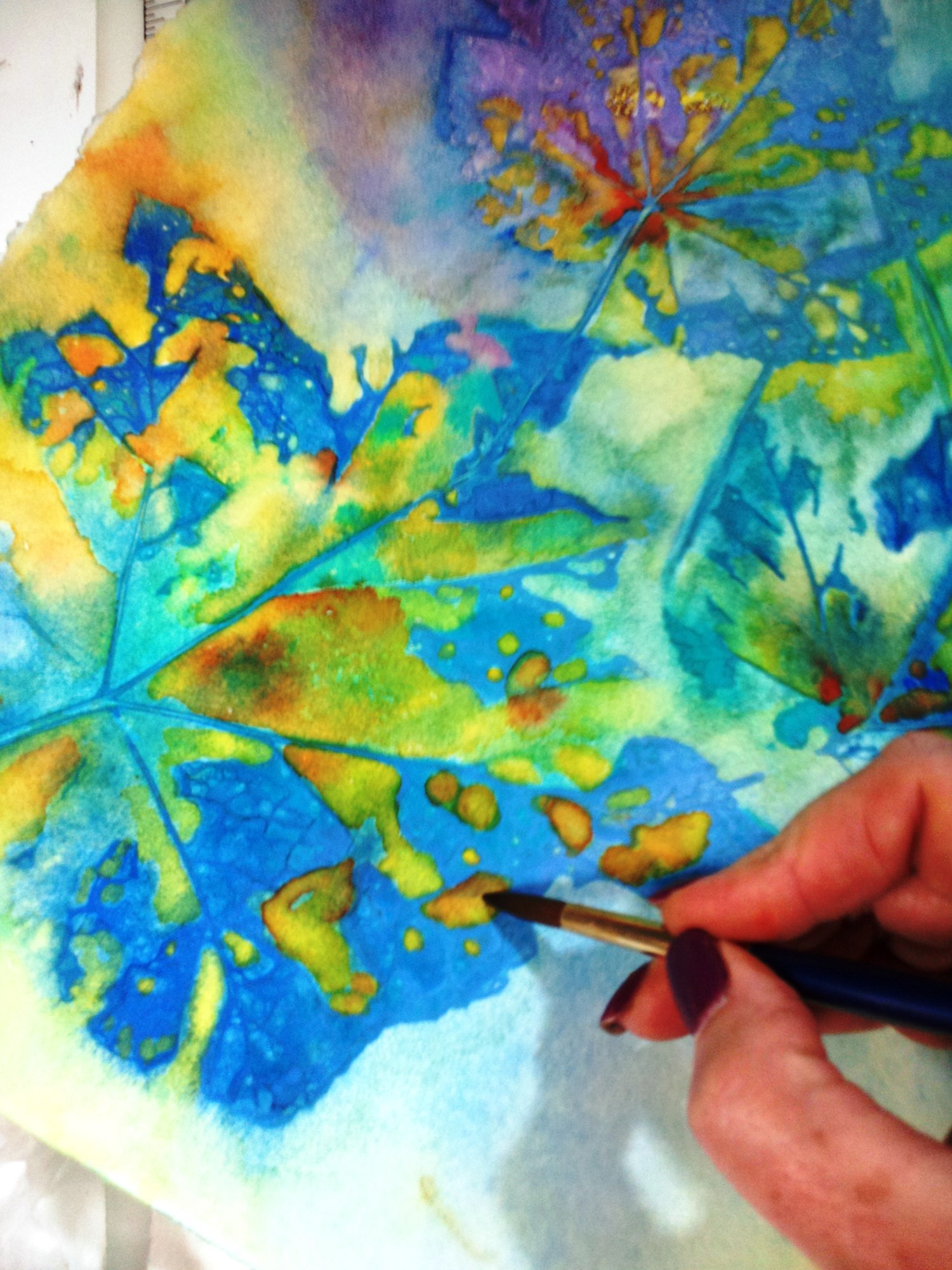 Leaves collected from a day-trip to Tally Lake, MT were inspiration for this colourful piece. It was a chilly fall day by the lake, so quiet and there was fall colour all around me.