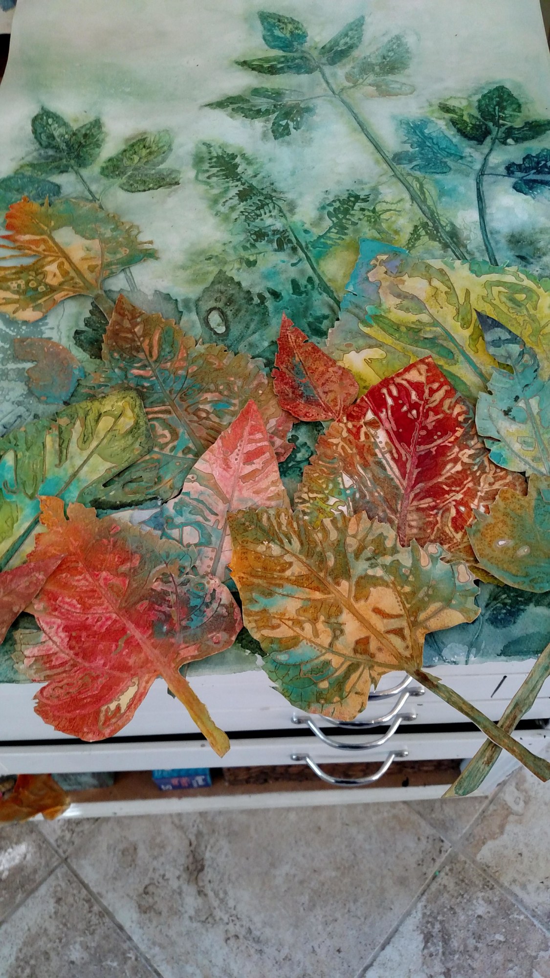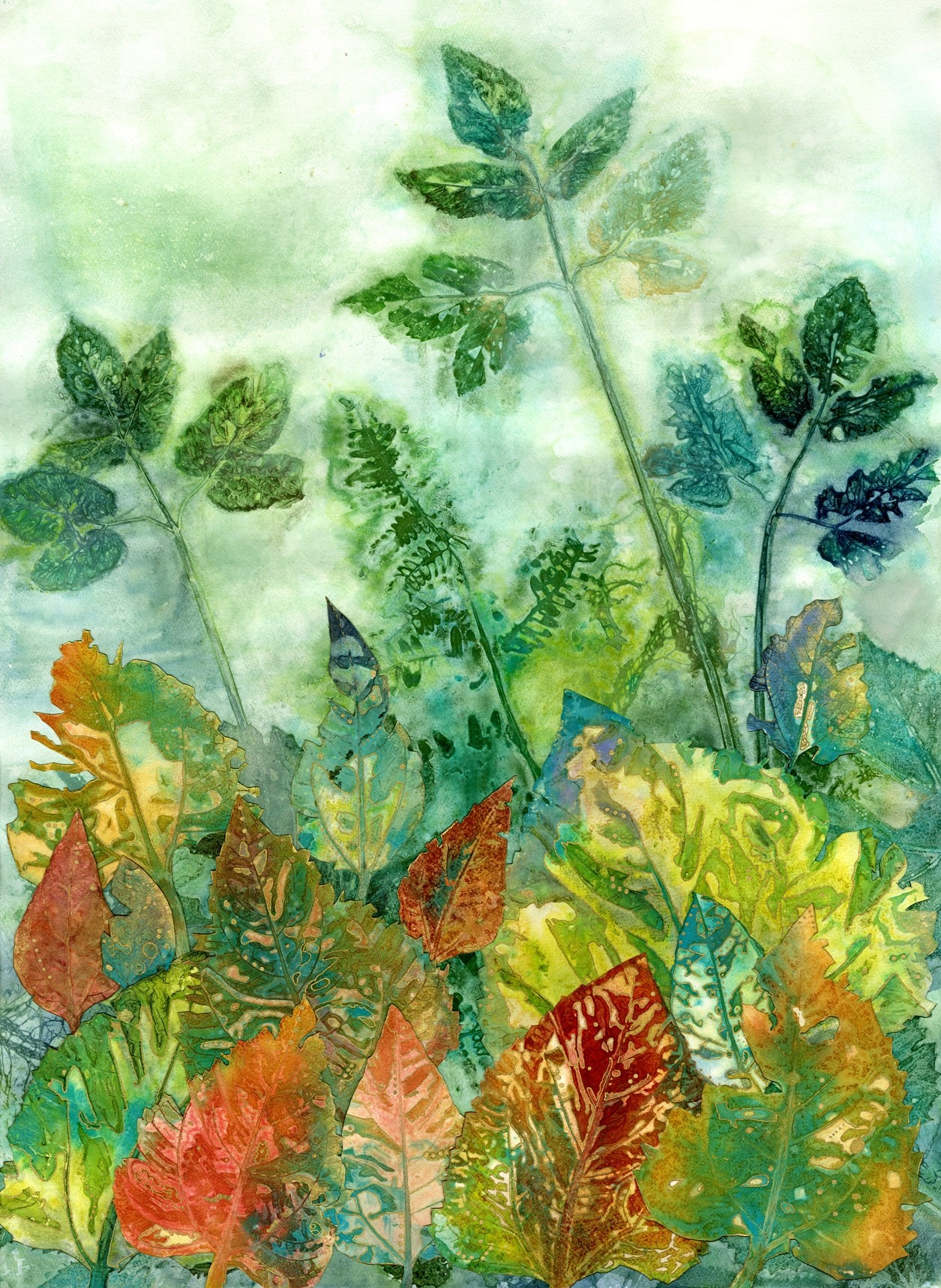 Watercolour Collage using sunflower leaves and garden groundcover for initial marks onto watercolour paper. Embellished with gold metal leafing and pen.