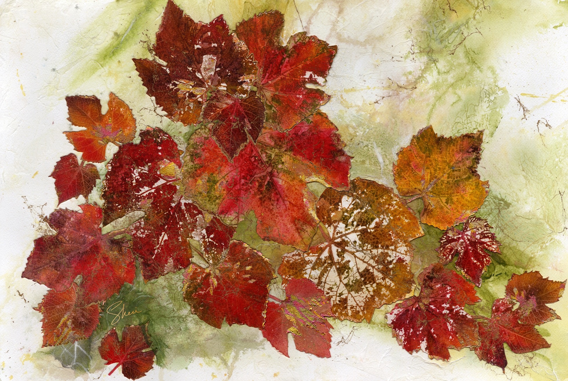 A collage of watercolour papers and Unryu rice papers created depth and texture in this piece. Gold metal leafing highlights some of the leaf edges.