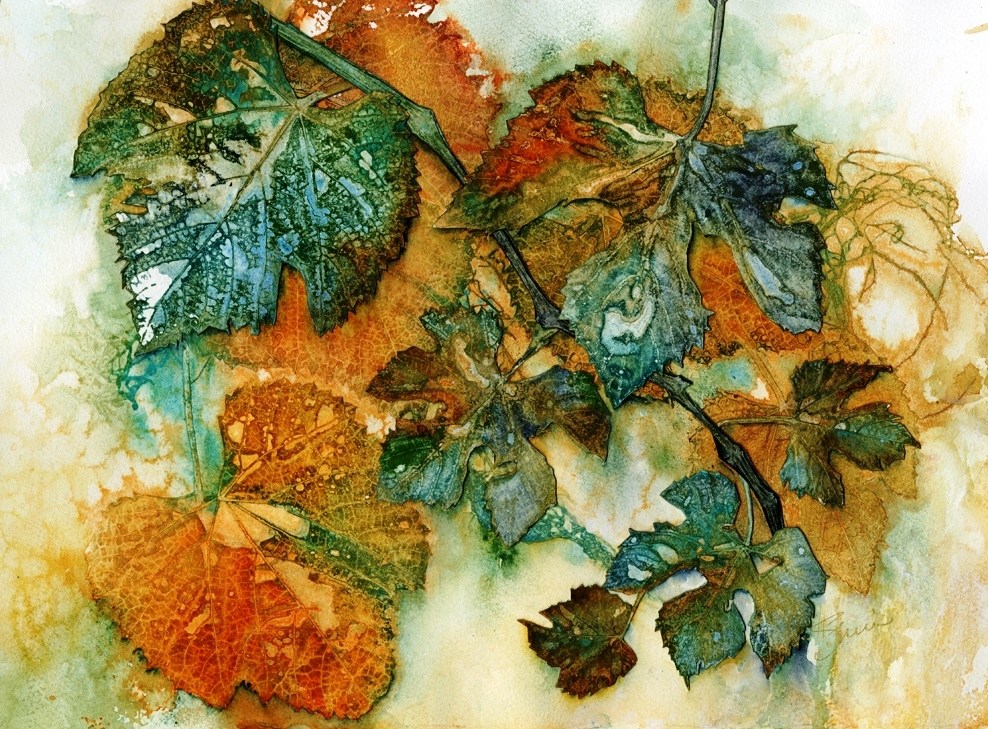 Watercolour collage on Arches 140 Lb. paper. Young green grape leaves were used to make initial marks onto paper.