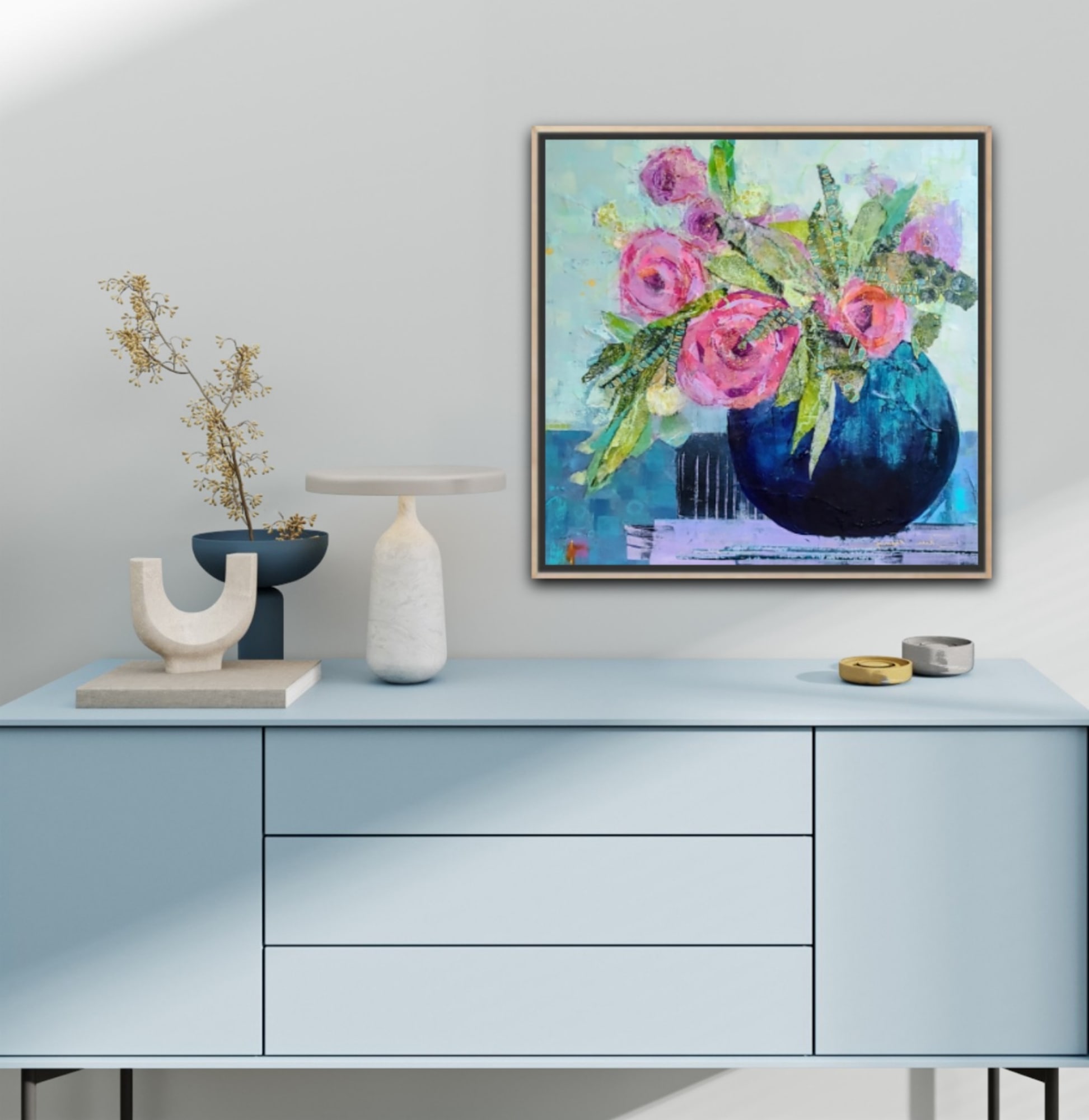 "Where Peonies Dream" features a loose expressive bouquet in a deep blue vase, set against soft, layered color. The piece balances bold floral forms with a relaxed contemporary feel.