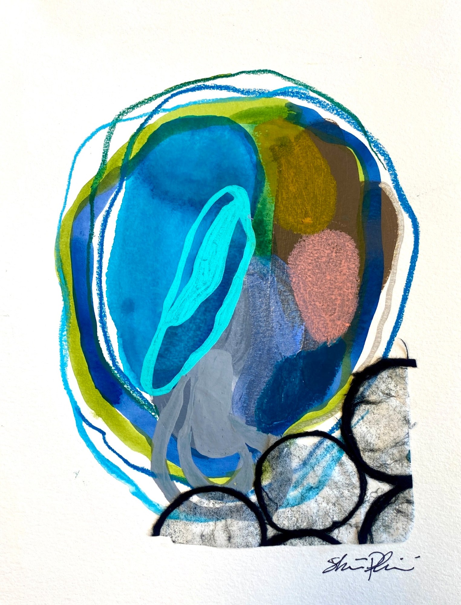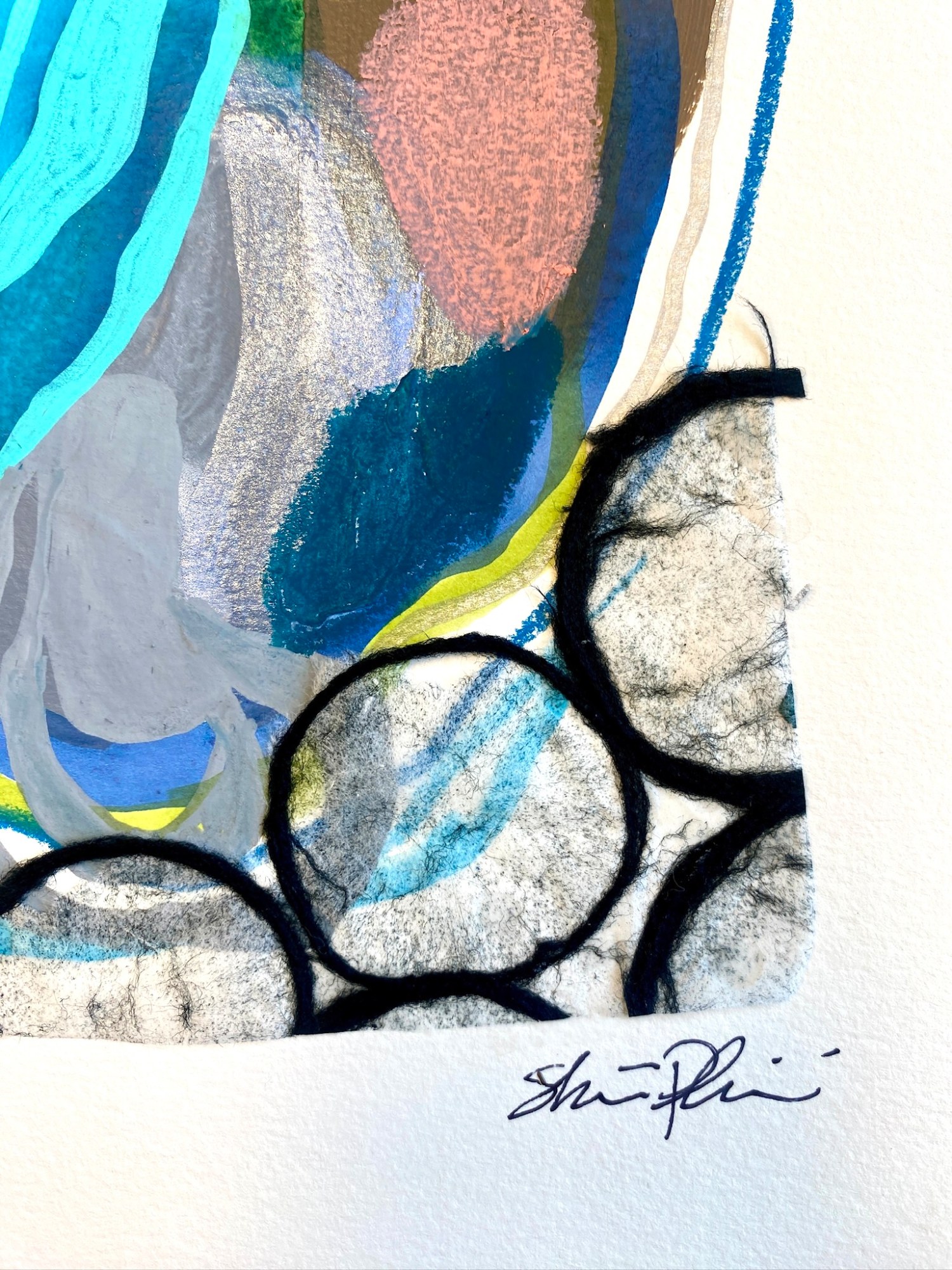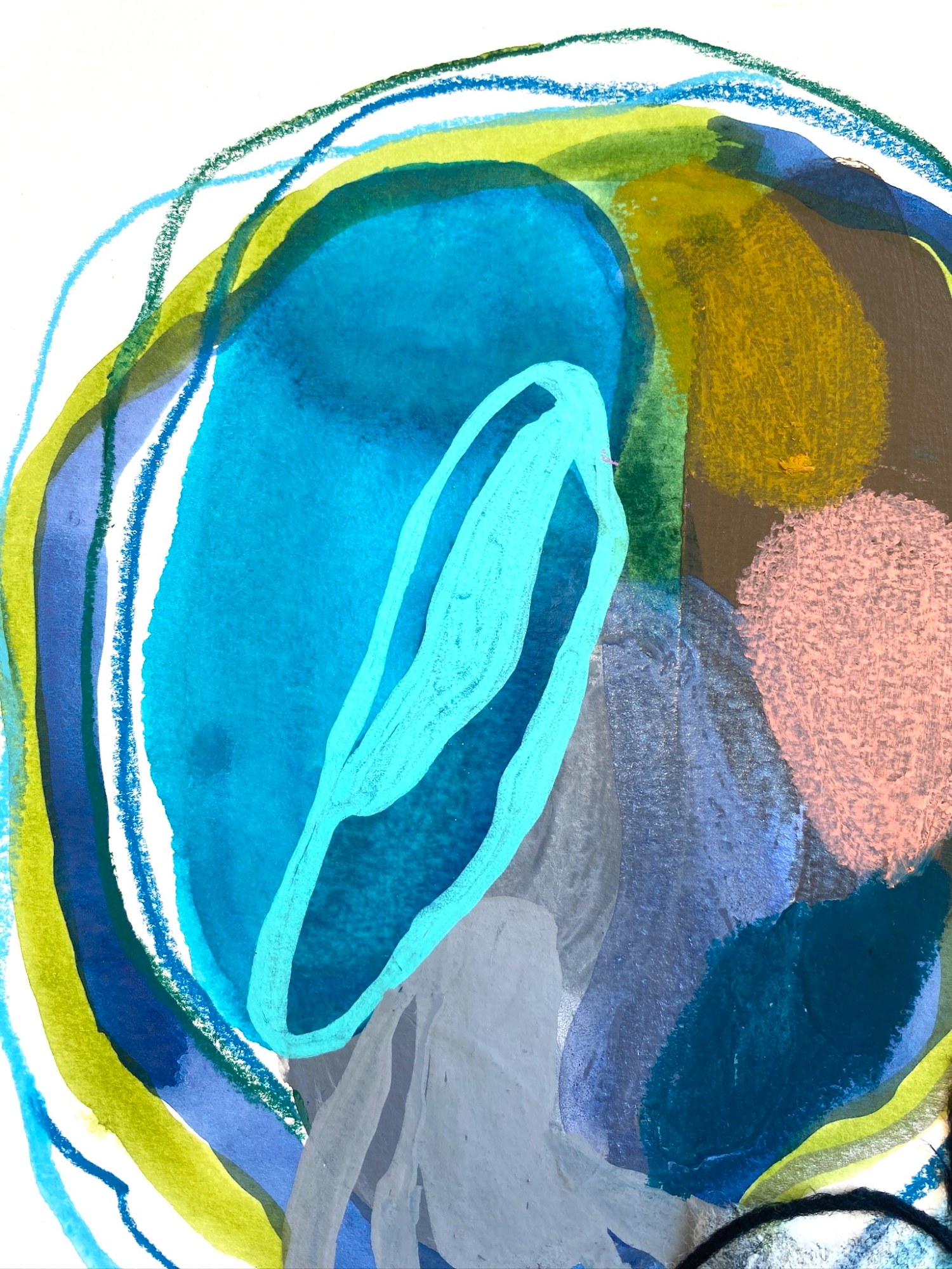 Acrylic, ink, oil pastel, wax crayon and handmade paper on paper