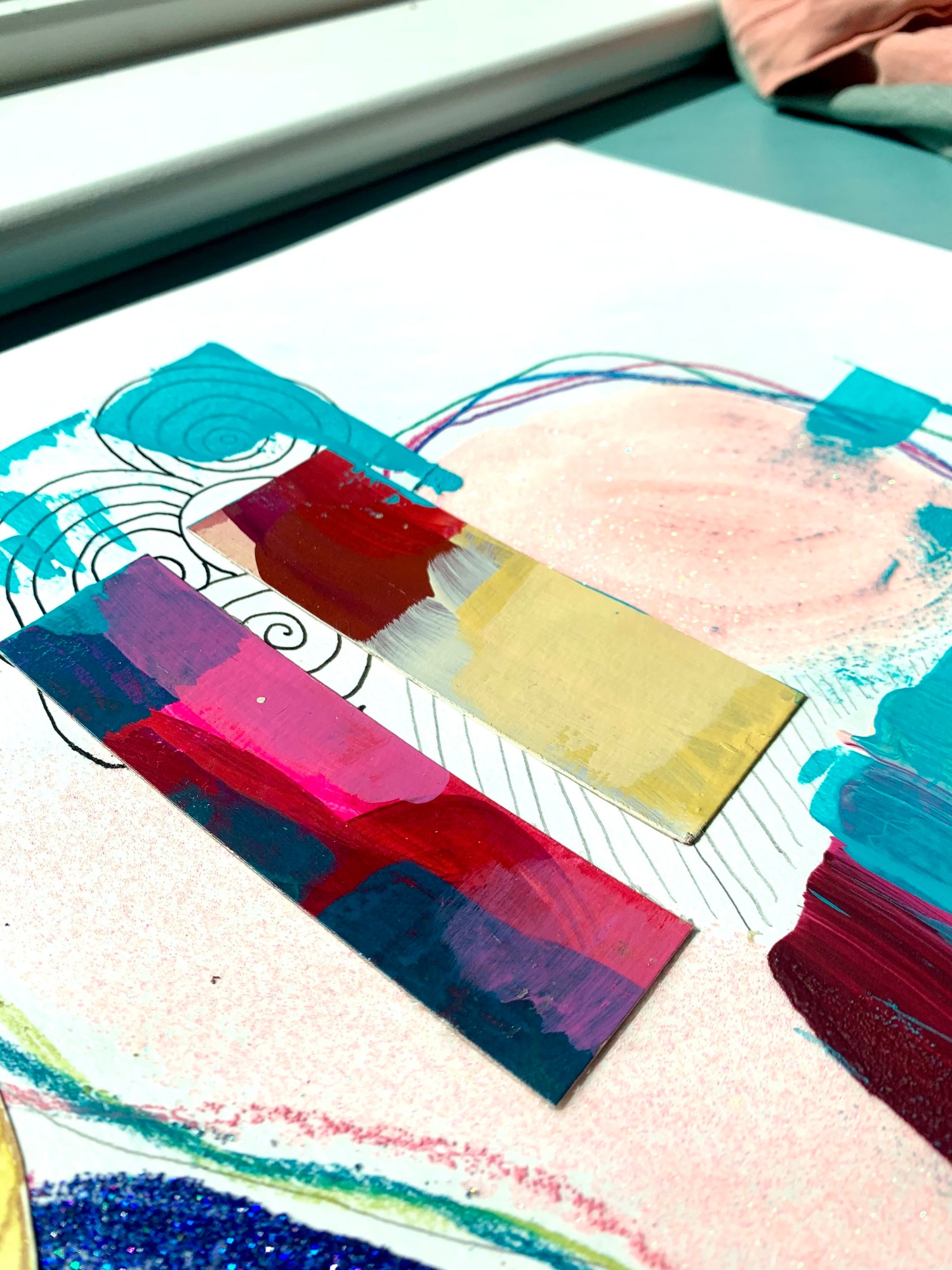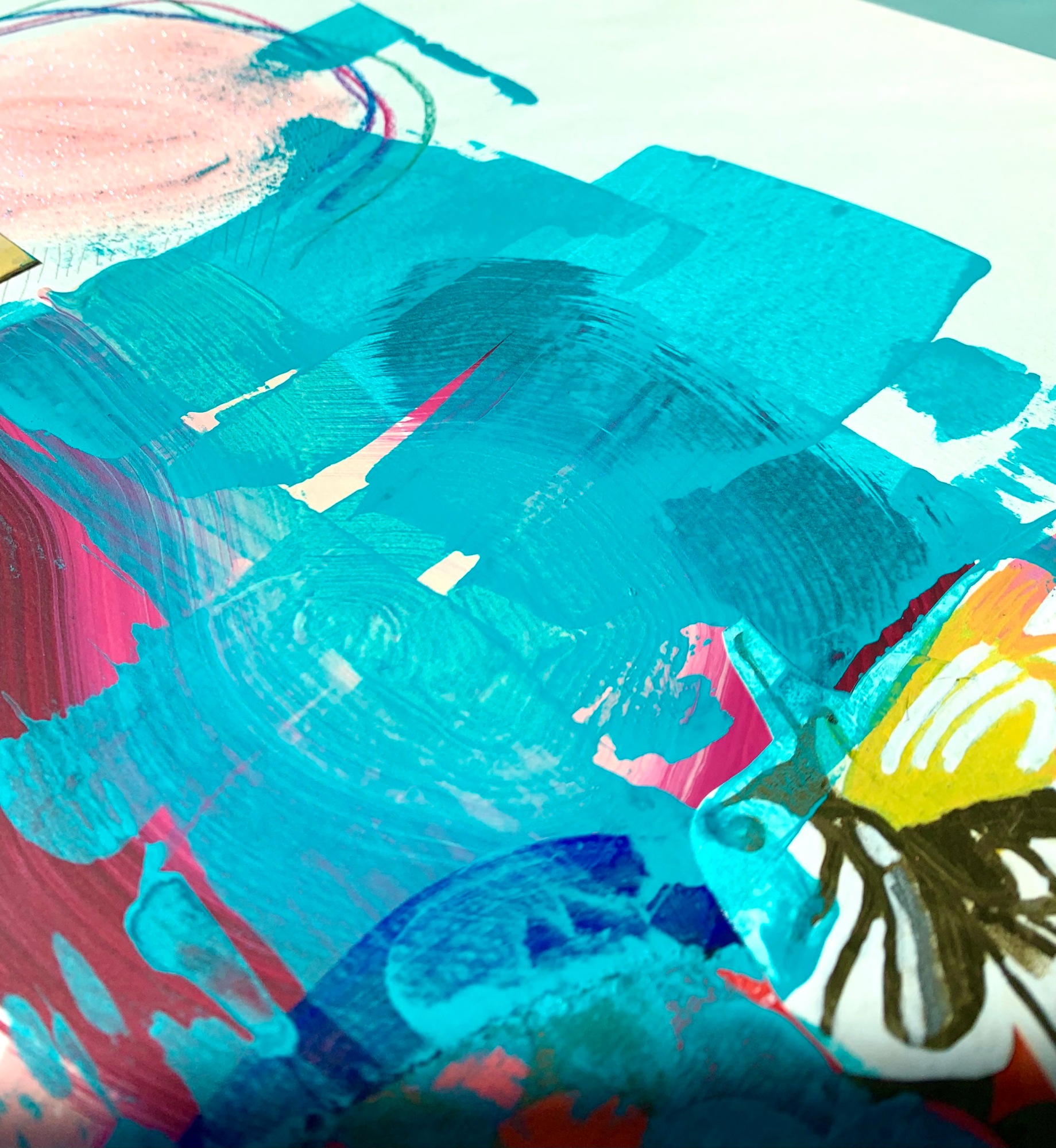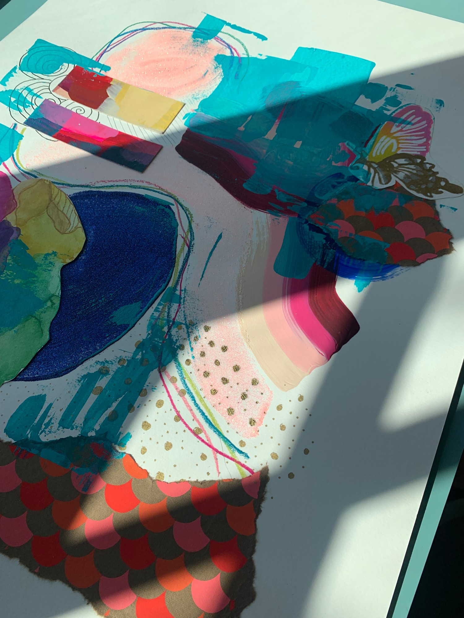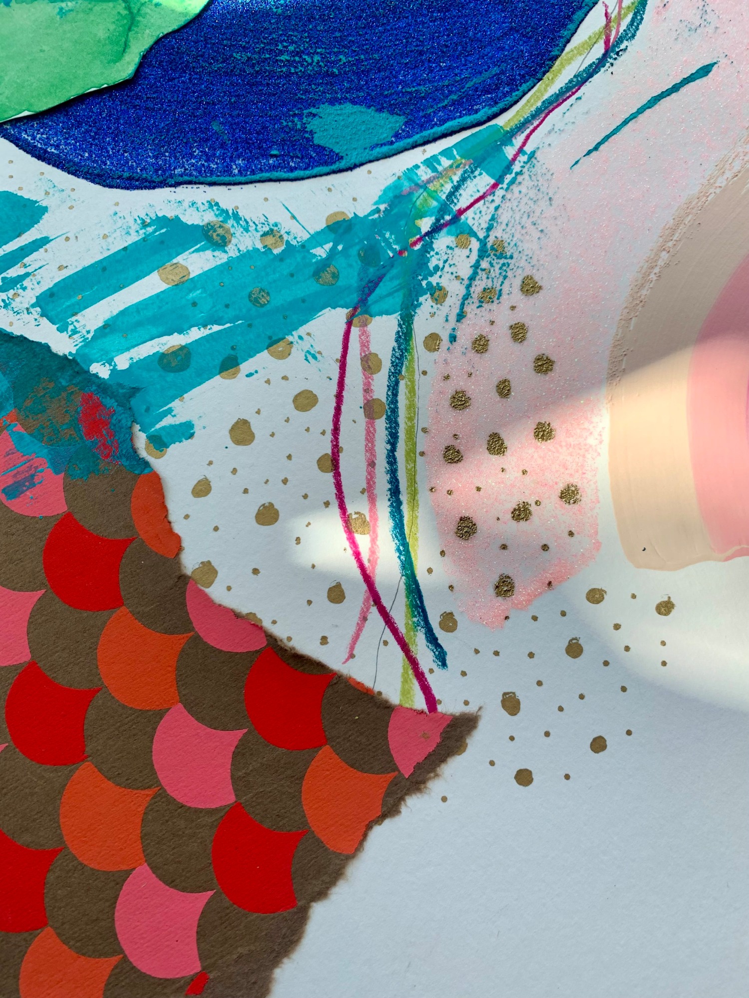 Multimedia on paper - acrylic, papers, sparkle, wax crayon, graphite, watercolor