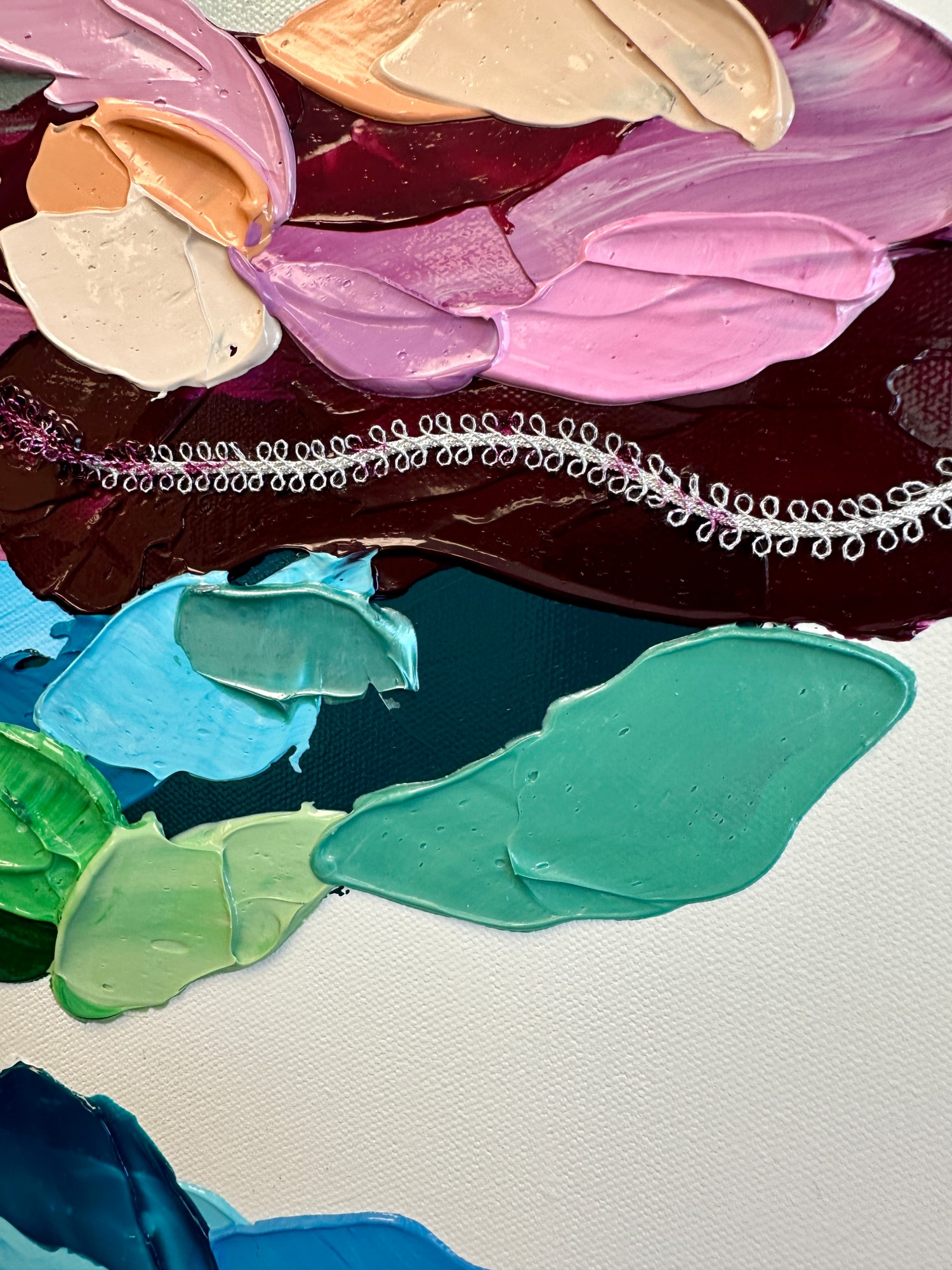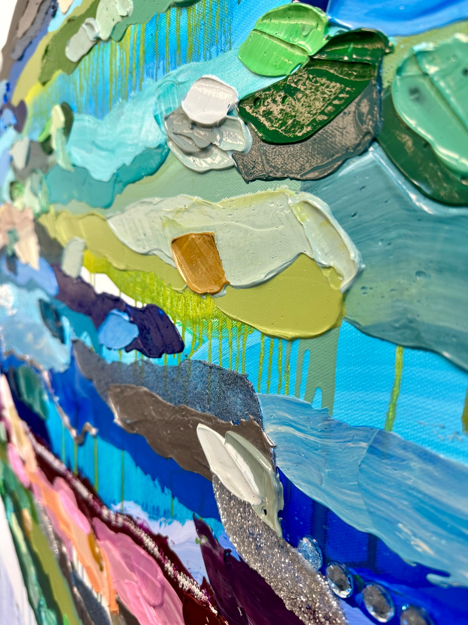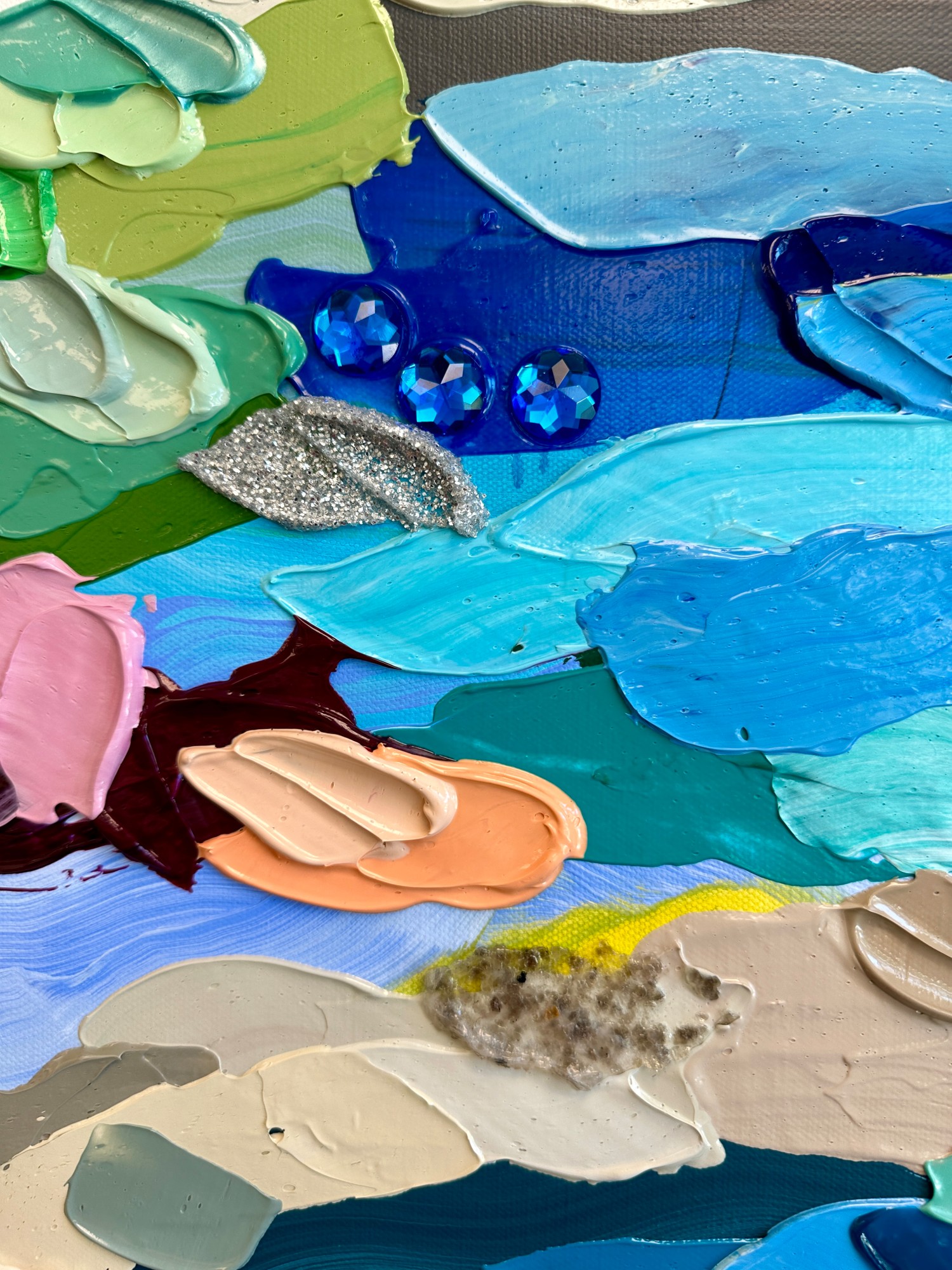 Acrylic, mica flakes, glitter, embroidery, beading, acrylic jewels on canvas