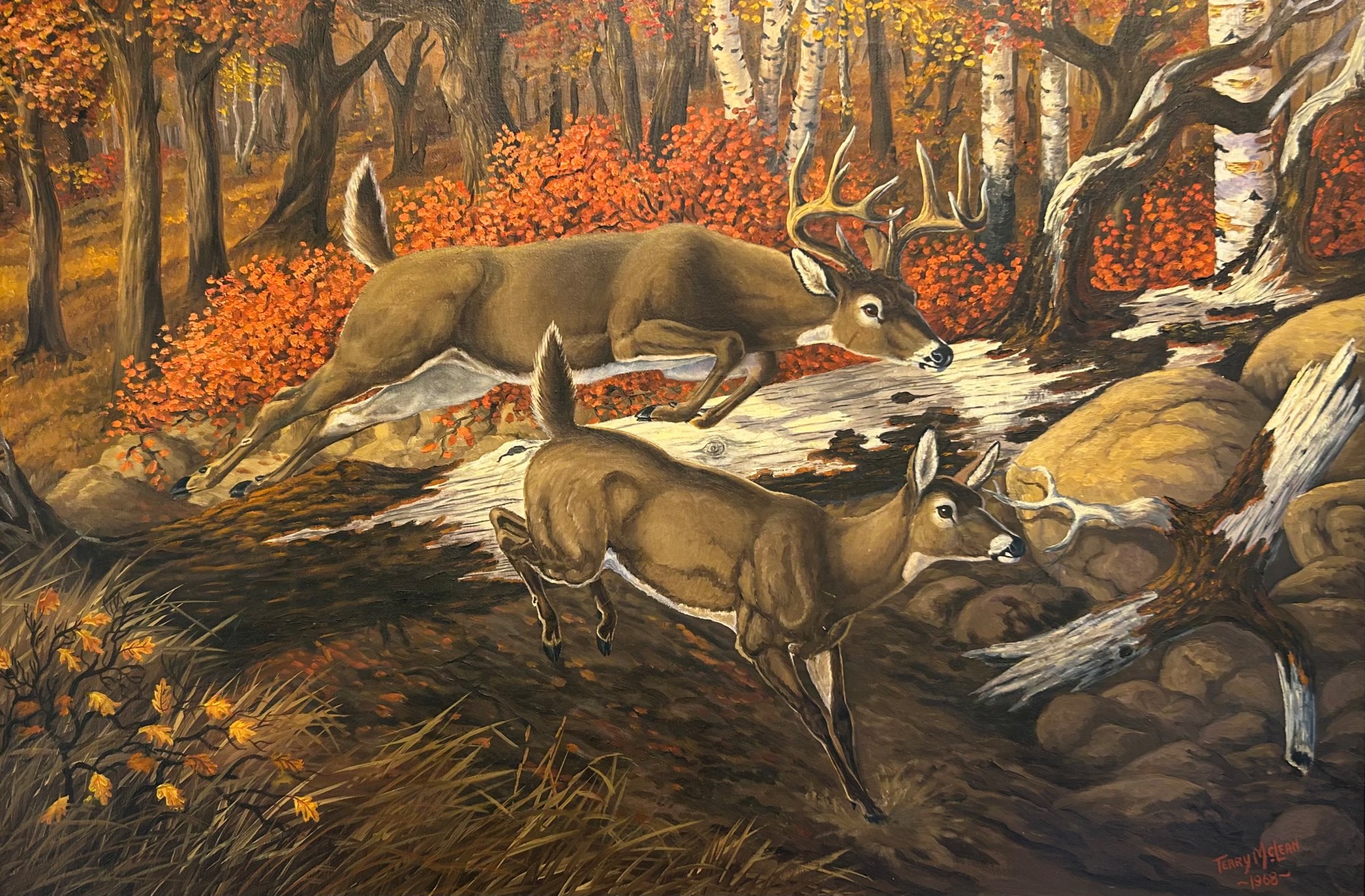 His depictions of rural wildfire are enthralling, inspired by photos he’s taken in his travels around Westman. In recent paintings, McLean portrayed an oil pump on a golden field or a buck primed for a fight during mating season.