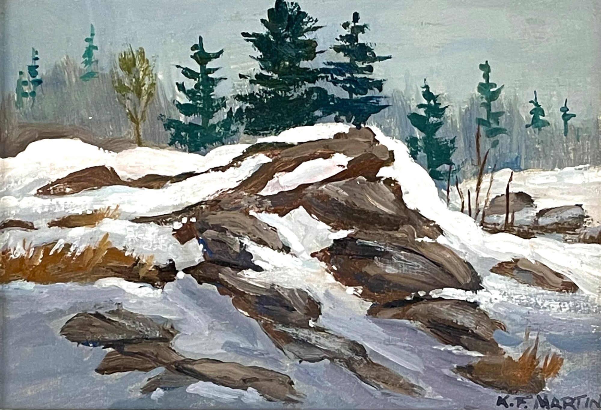 Educated at Isaac Brock, Daniel McIntyre, and the Winnipeg School of Art, Ken became a noted and prolific landscape artist, sensitively recording the seasons of the Manitoba prairie, the Whiteshell, and Northwestern Ontario, but returning constantly to the ever-changing shore of Lake Winnipeg near the cottage he and his wife Fran built in the 1950s at Ponemah. His beautifully meticulous oils, acrylics, and watercolours hang in public and private collections throughout Canada, as well as in the United States and Europe. Ken served as an aerial photographer in the RCAF during the Second World War, interrupting his career as a commercial artist. Having earlier apprenticed with Brigden's of Winnipeg in 1938, he rose after the war to the post of Brigden's Art Director before taking early retirement in order to paint full-time. He loved to study the work of other landscape specialists, and his own painting was greatly influenced by the guidance of Lemoine Fitzgerald and the constant example of the Group of Seven. He was never able to pass a Tom Thompson without pausing to examine and admire. A long-time honorary member and past president of the Manitoba Society of Artists, Ken delighted in giving workshops, and in going out on sketching trips with friends like Leo Mol and, in later years, Spence Allison.