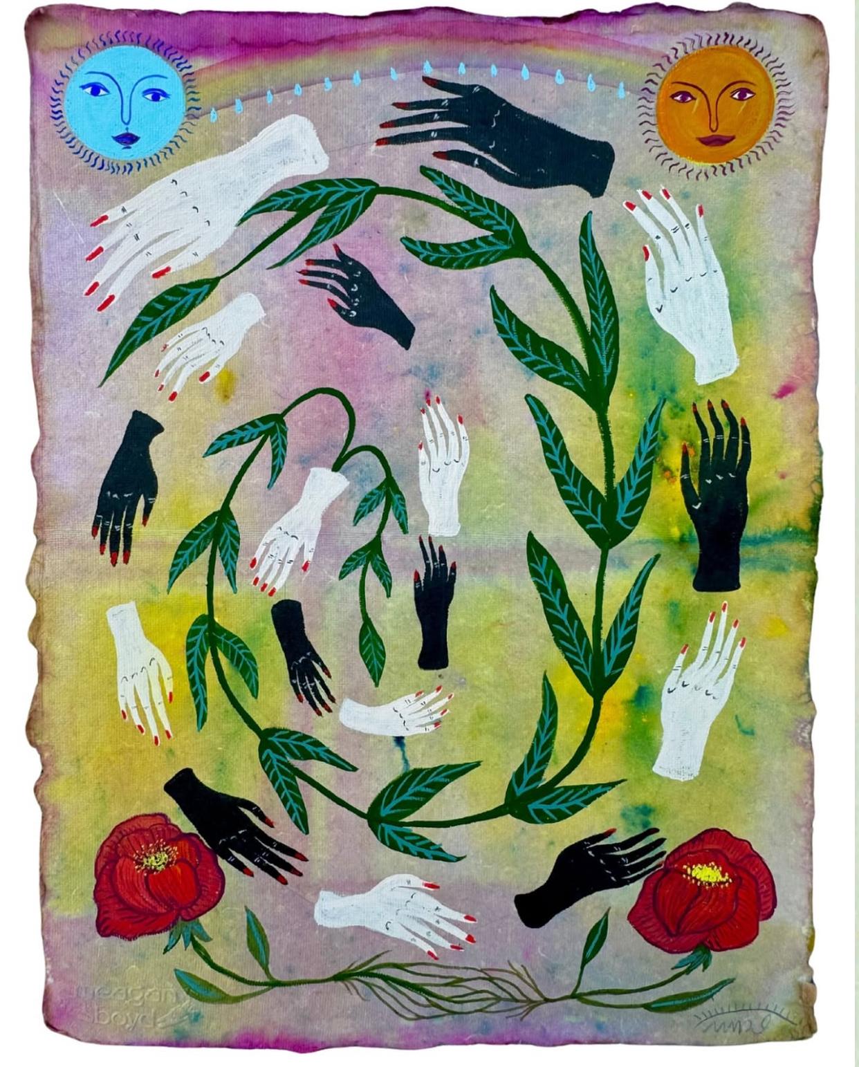 Gouache on handmade paper dyed in rose, hibiscus, mineral pigment, and labradorite essence. Framed