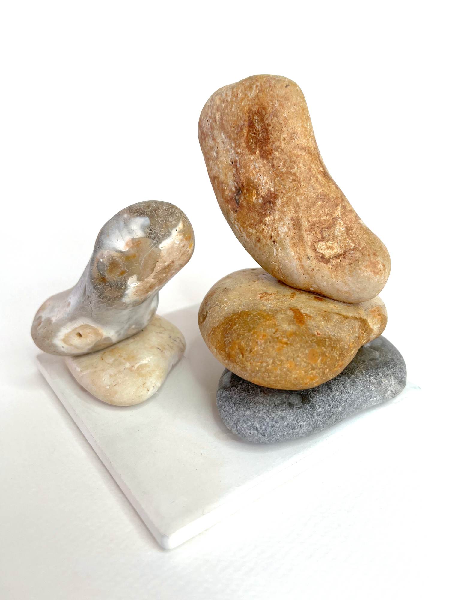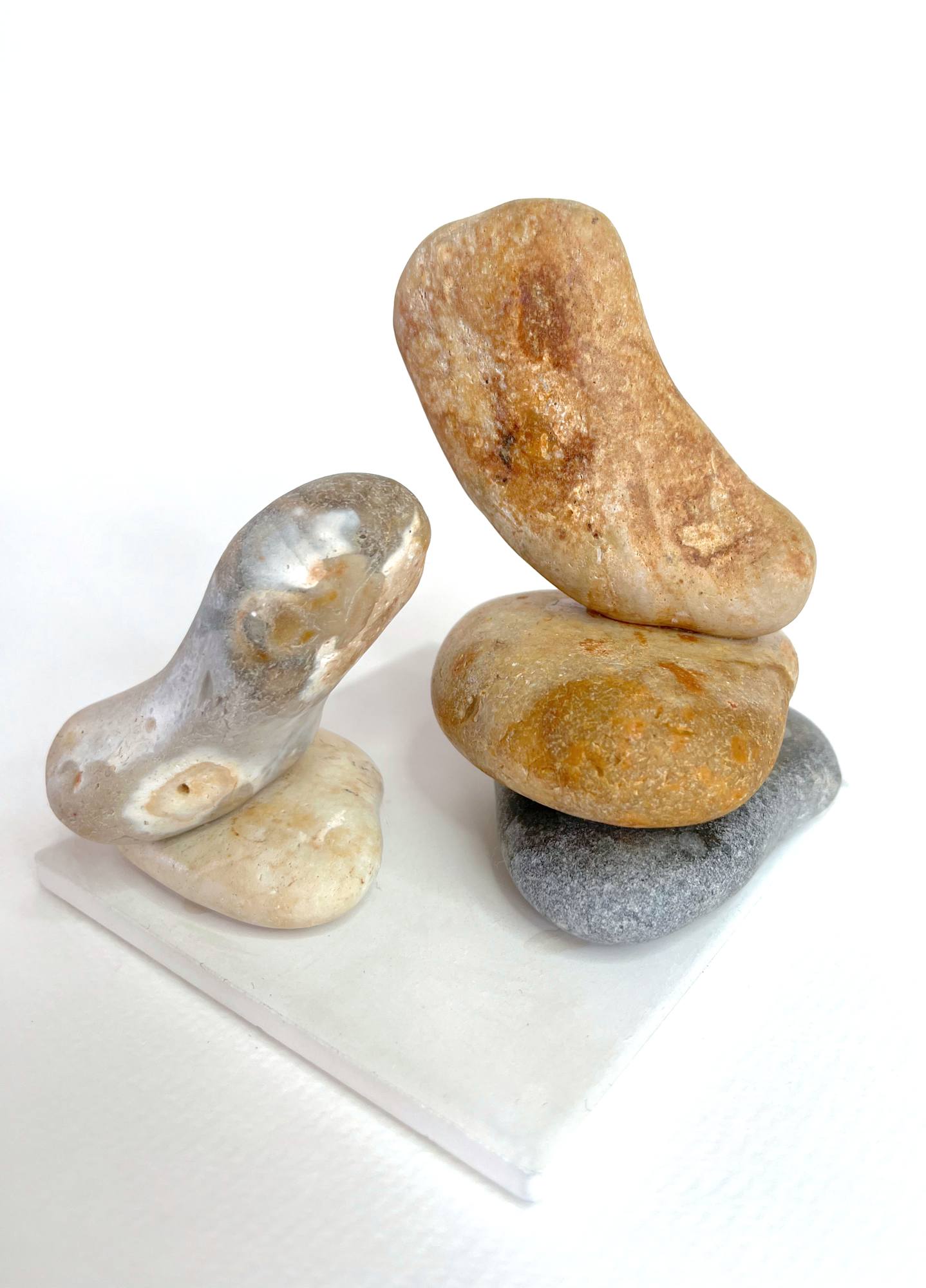 “Confluence” is a beautifully balanced sculpture where two sets of stones face one another, standing tall on pebbles like two beings in conversation or animals in quiet communion. The natural curves and forms of the stones evoke the subtle language of connection, as if captured in mid-dialogue. Each piece stands independently, yet they feel incomplete without their counterpart, symbolising the harmony of relationships and the unspoken bonds between nature, people, or creatures.
