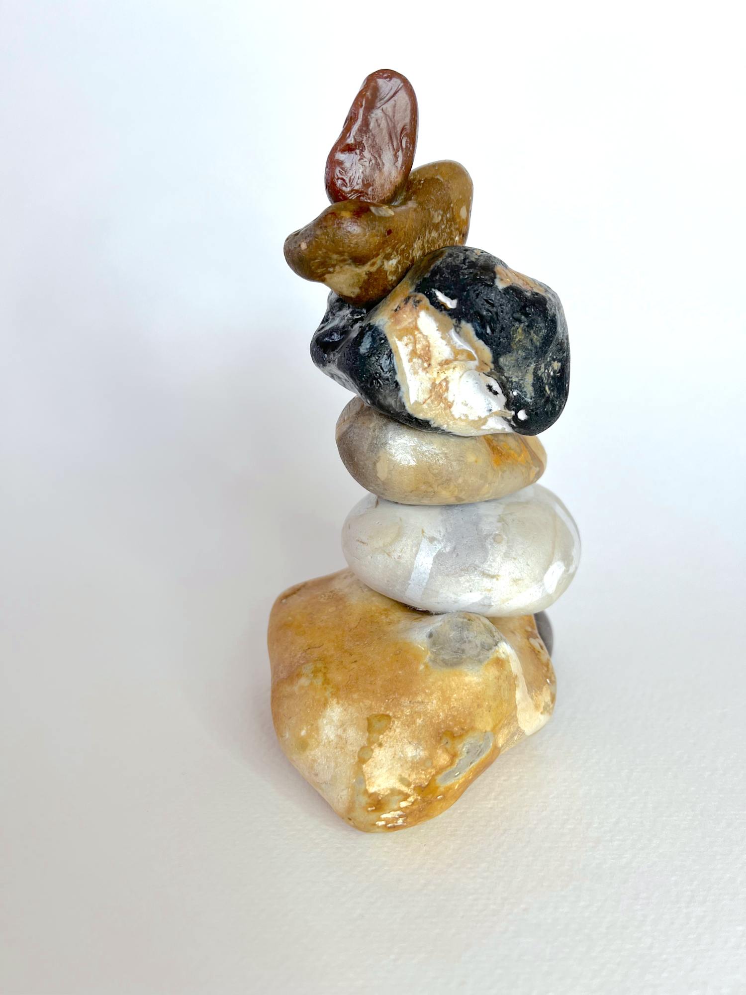 Introducing "Embrace," a beautifully organic totemic sculpture that starts with a wide base and gracefully winds upward, culminating in two natural forms that seem to nestle together like sea creatures in a protective embrace. The fluidity of the stones mirrors the harmonious connections found in nature, evoking the gentle dance of life beneath the ocean's surface. Perfectly balanced, this piece is a tribute to the beauty of natural companionship and the elegance of organic forms.
