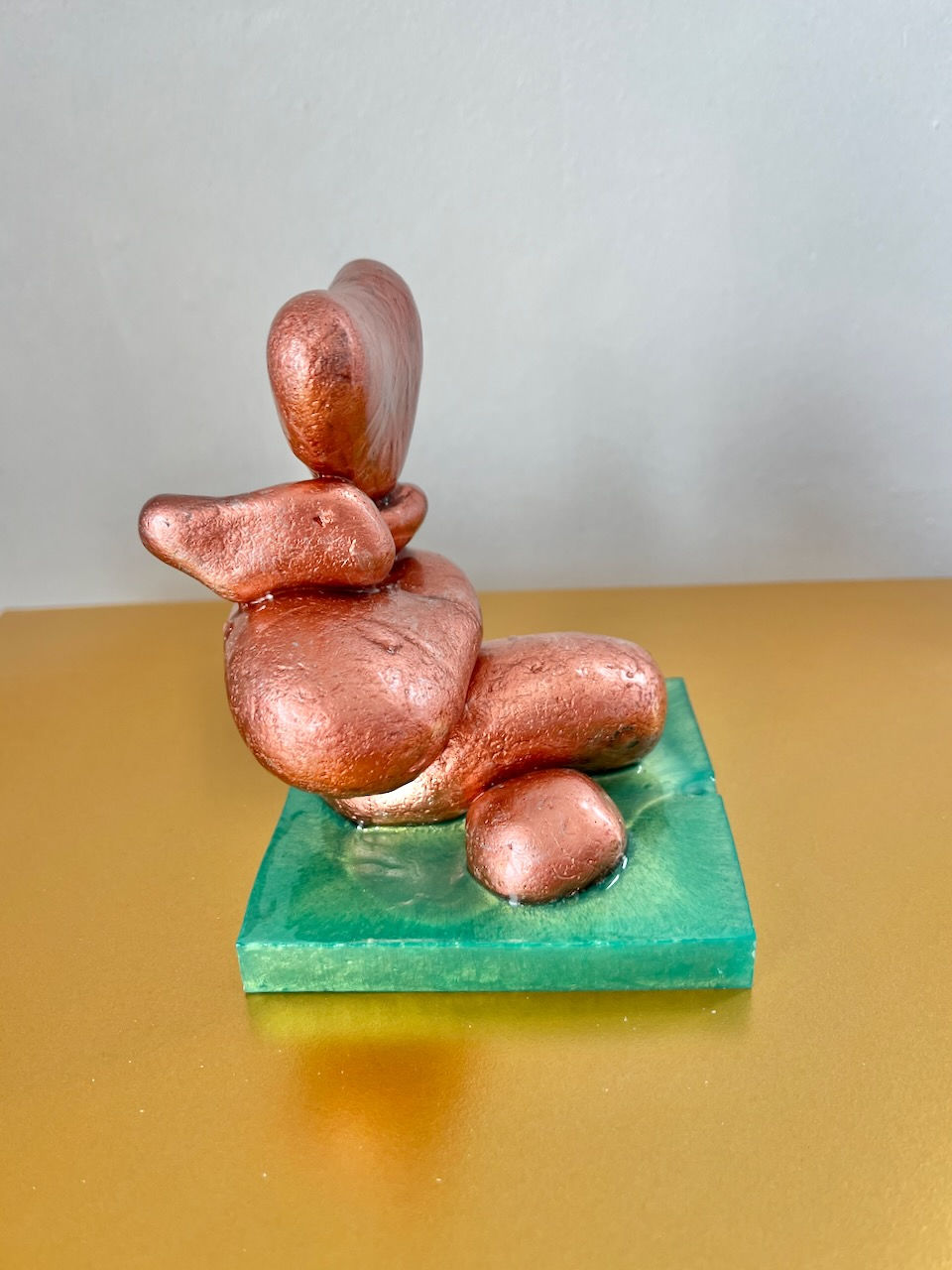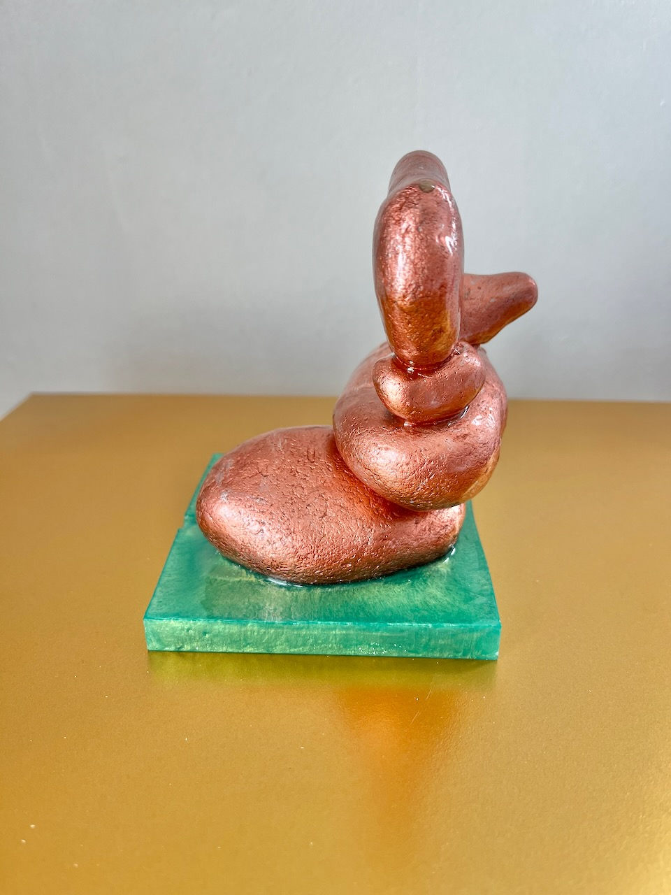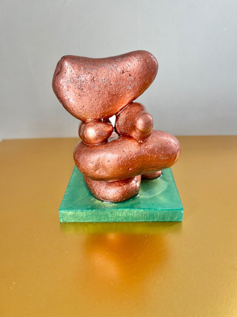 “Love is in the Air” is a tender, uplifting sculpture where organic forms in soft rose-gold seem to float above a tranquil translucent green base. The stones appear to lean towards one another in a gentle, almost weightless embrace, capturing a fleeting moment of connection and serenity. The warm metallic sheen glows softly against the cool, watery tone of the base, suggesting the meeting of earth and water — a quiet celebration of harmony and affection.