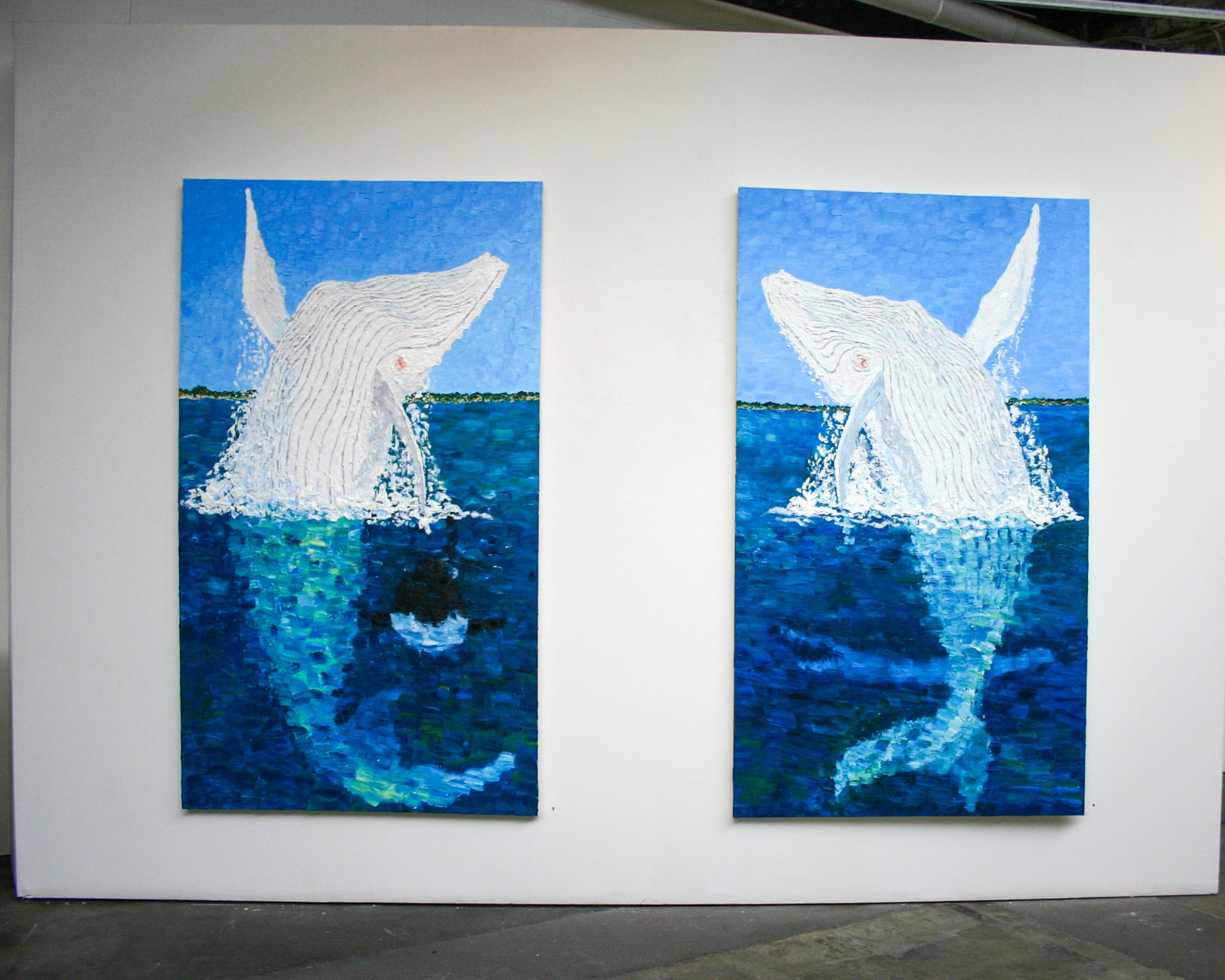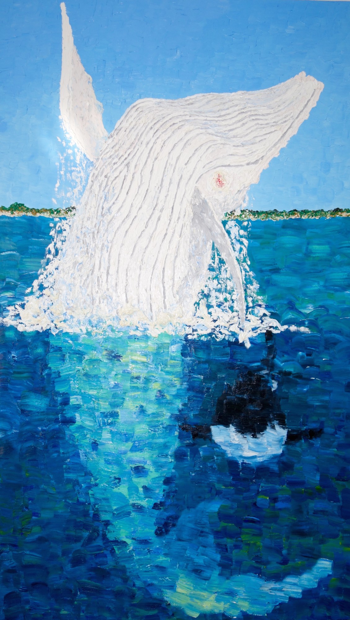 When I began painting Migaloo he represented the vulnerability of the humpback population to me. Whaling in the southern ocean is still done for "Scientific Research" by the Japanese. This Migaloo-themed series of paintings tells the story of his journey up and down the coast while also highlighting potential threats to his well-being.