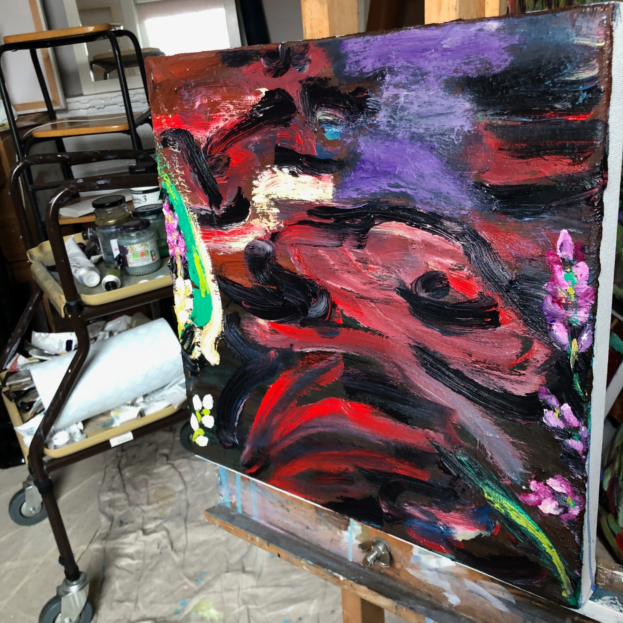 I began a large painting of the wildflower meadow and a white house on the cliffs in July. Since then I have been back many times and watched the flowers change with the seasons. I began a series of smaller wildflower paintings once the large painting was finished.