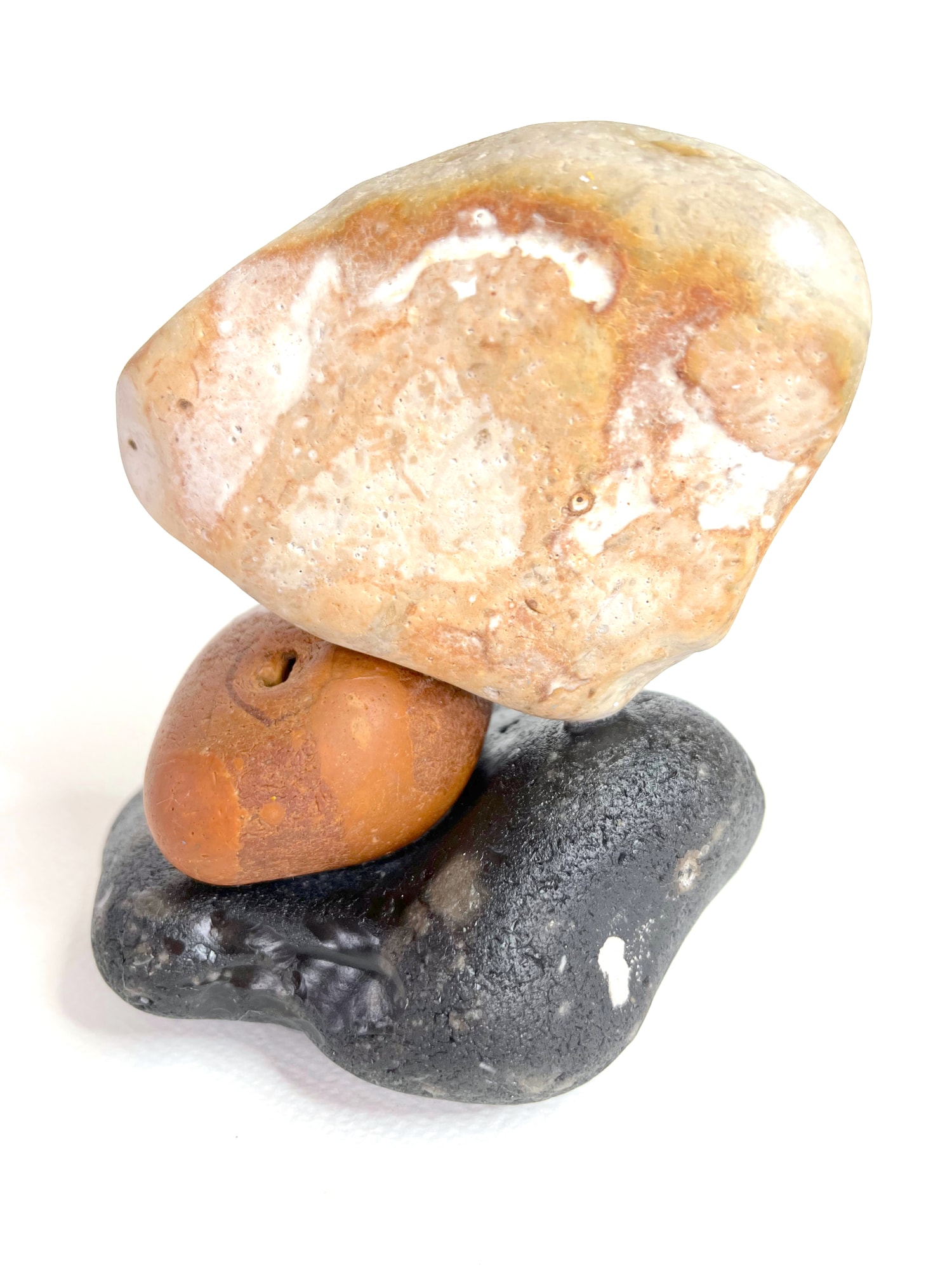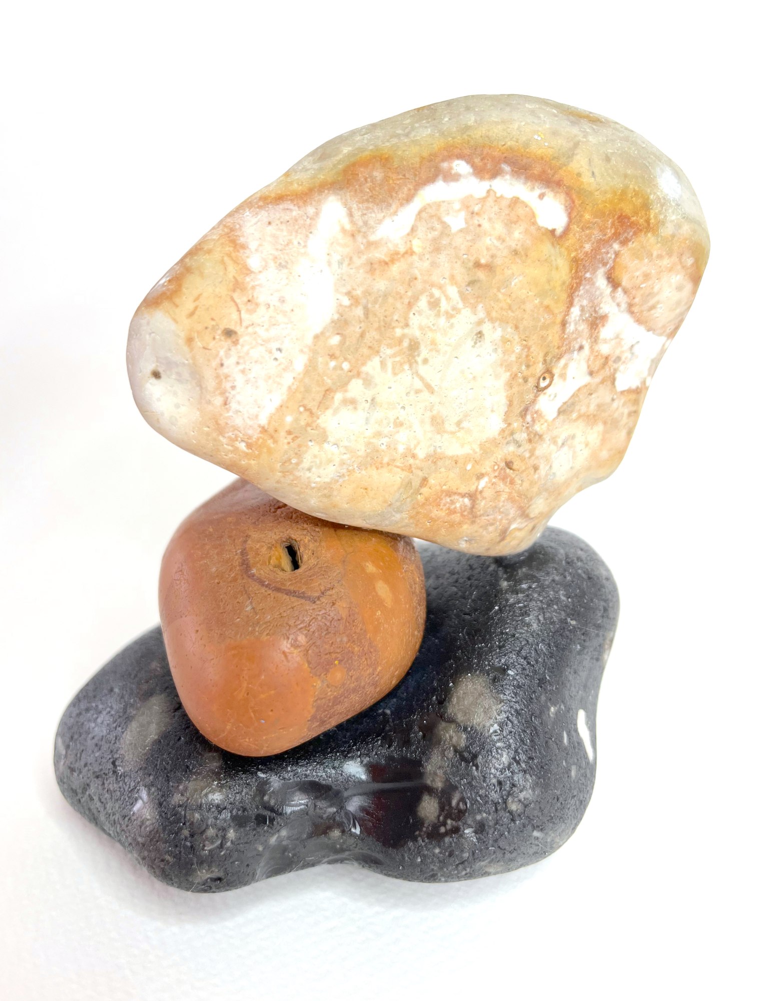 “Triad Harmony” is a captivating new sculpture that elegantly combines the simplicity of form with the complexity of balance. This piece is composed of three distinct stones: a grounding black organic form as the base, a dark sienna oval pebble nestled securely within it, and a striking white triangular fan-shaped pebble delicately balanced on its side. The contrast of colours and shapes creates a harmonious interplay that invites contemplation and admiration. “Triad Harmony” is not just a sculpture—it’s a visual symphony that celebrates the natural beauty of stone and the art of balance. Perfect for those who appreciate refined, organic design, this sculpture adds a touch of natural elegance to any setting.