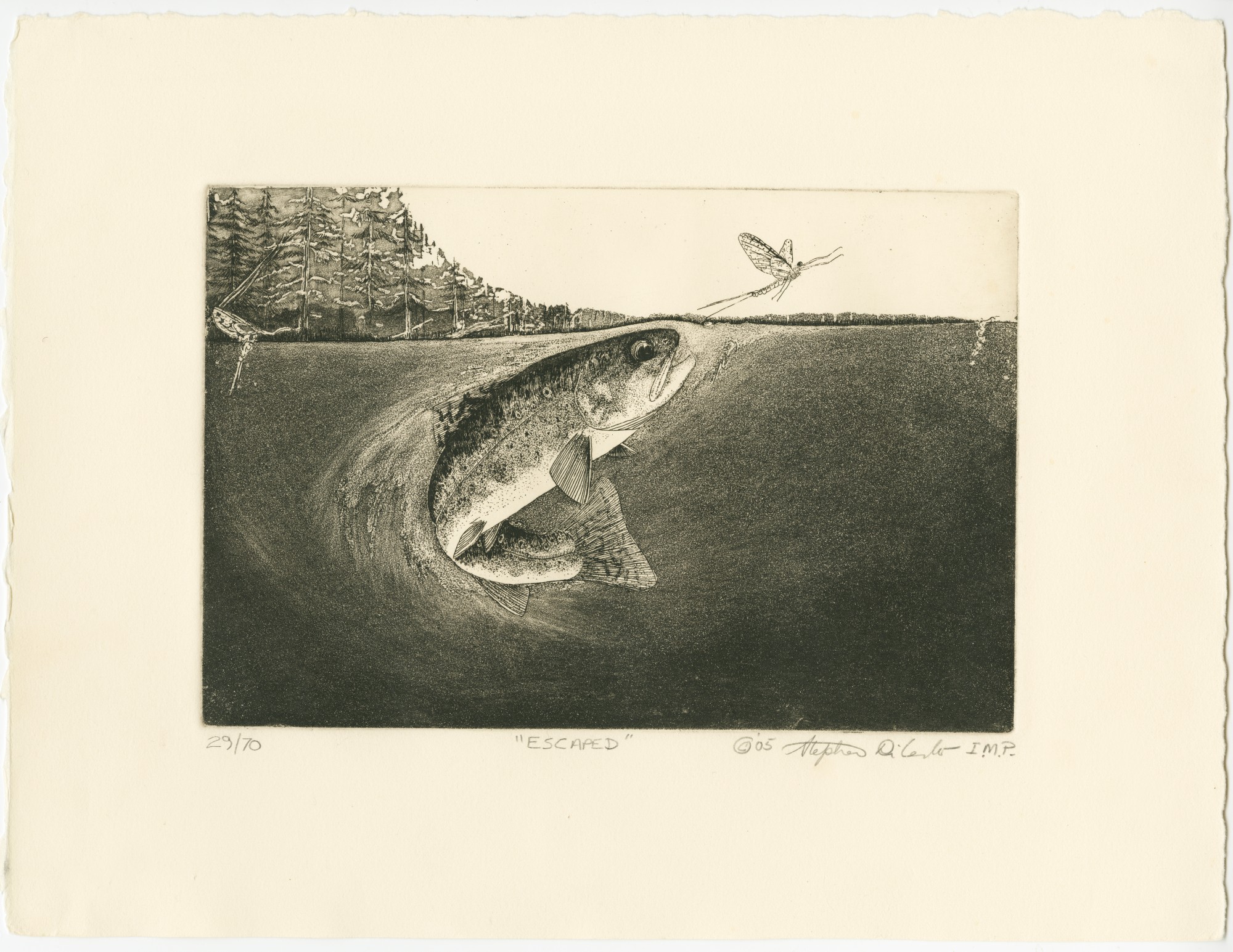 This image is a recreation of a moment between a feeding Brook Trout (Salvelinus fontinalis) and a green drake , witnessed by a young boy on a Pond in Vermont and never forgotten.