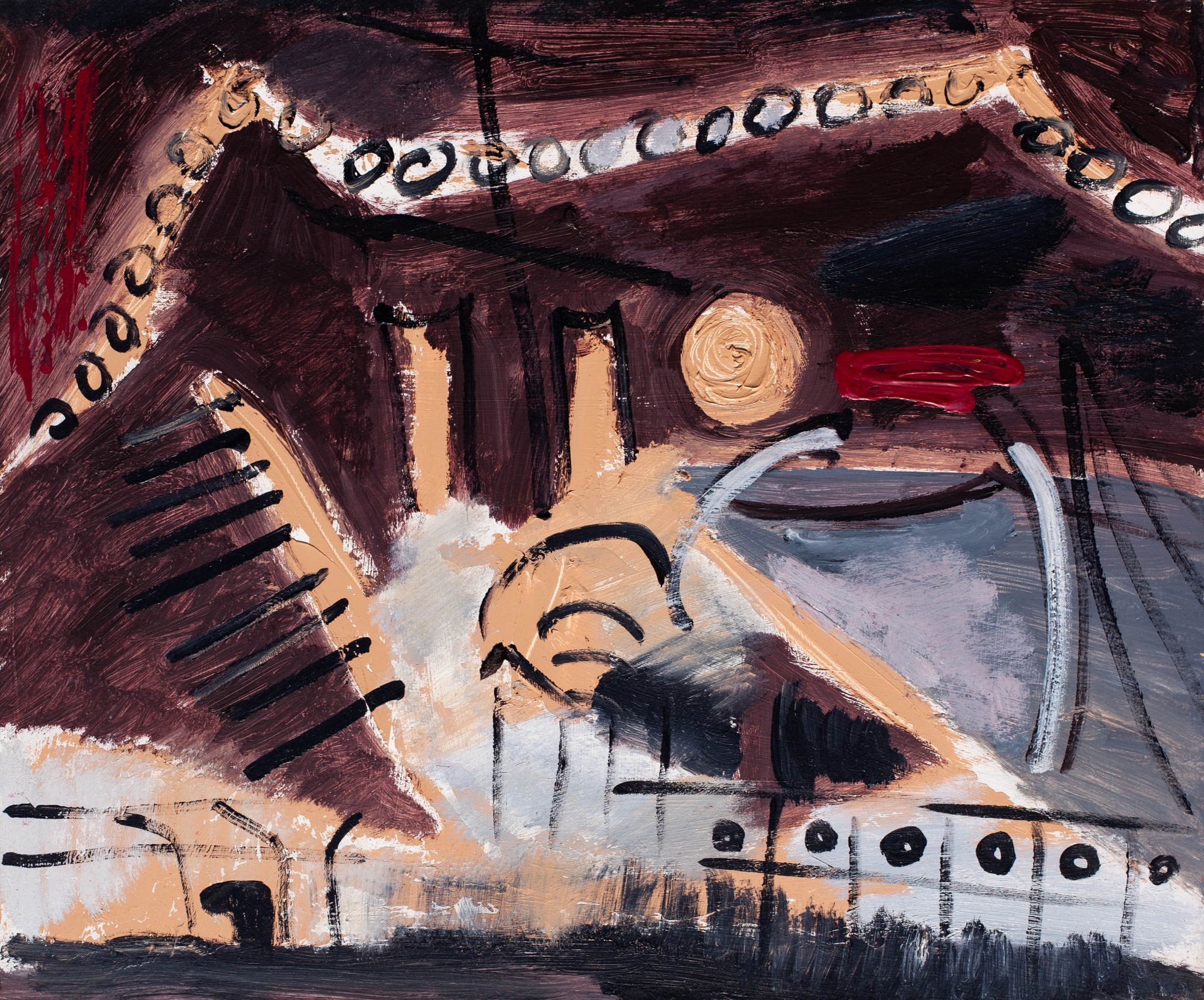 Pintura realizada in situ de noche representando la fragata Sarmiento en Puerto Madero