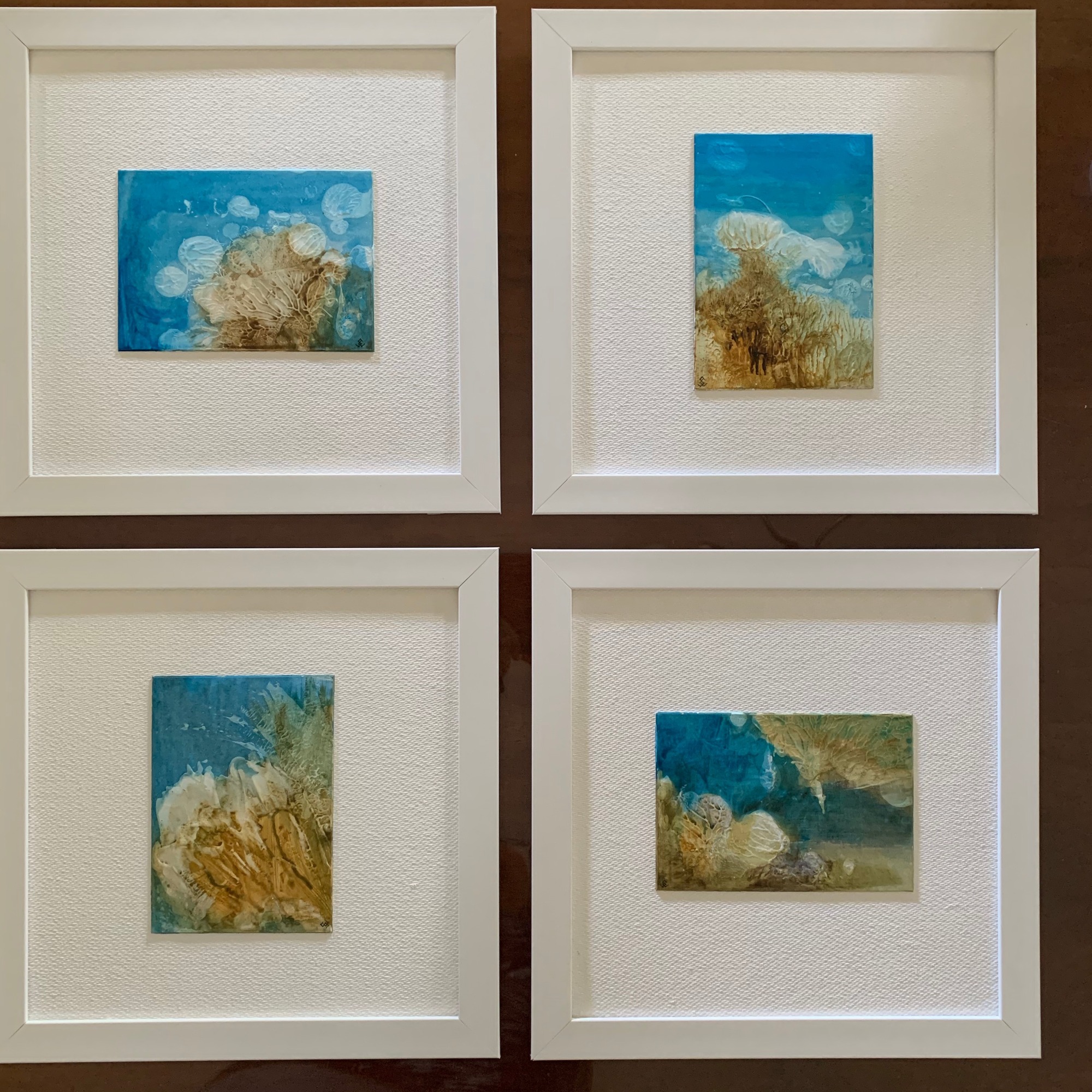 The inspiration for this series was the underwater shallow reefs, their colours textures and the sea. Combining gesso for texture and acrylic, creates some unusual organic looking patterns.
