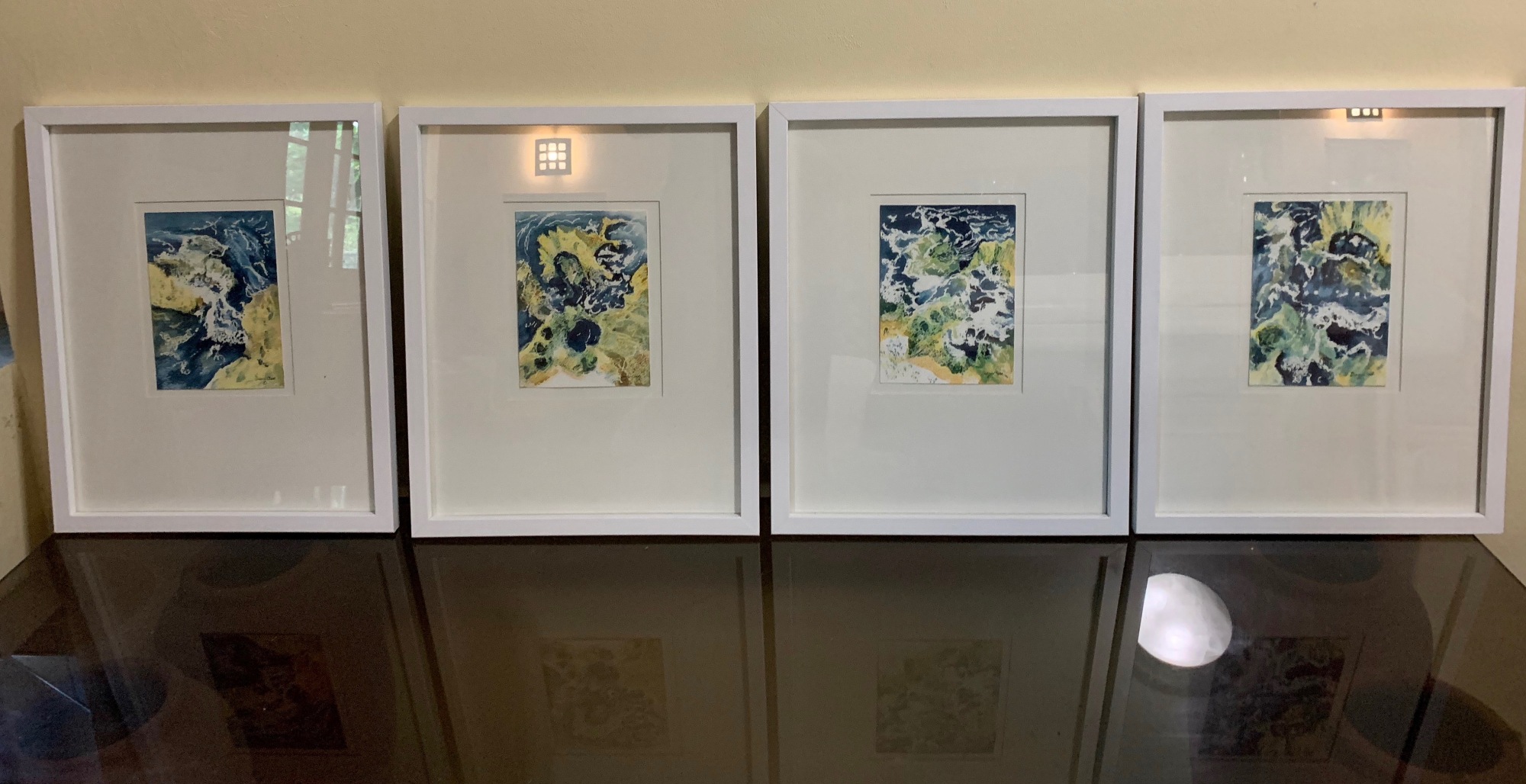 These can be bought individually or as a set of four. Framed with a pristine, broad, white mount, float mounted, under glass with a simple white frame.