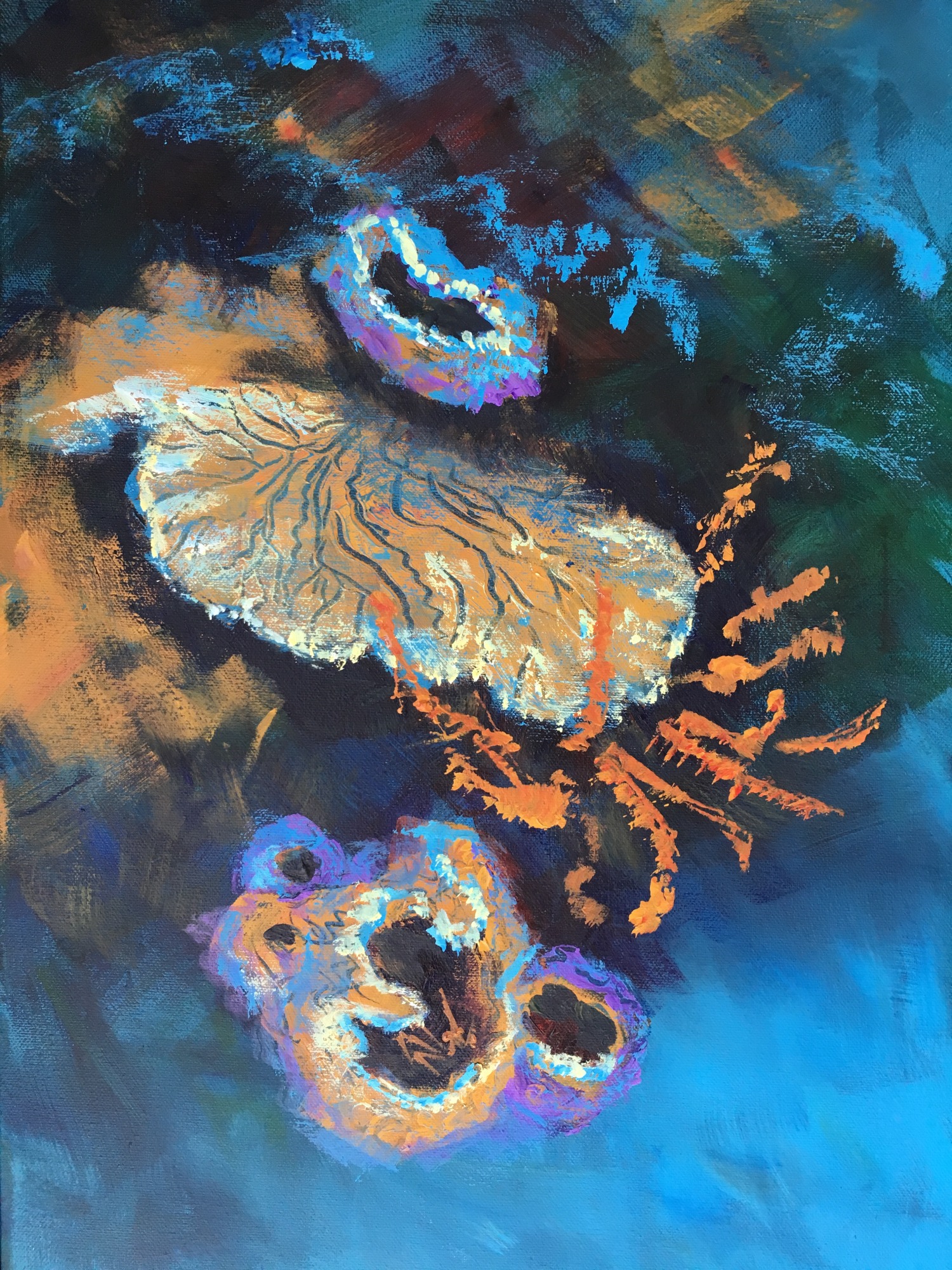 Vibrant vases, glowing with iridescent shimmer, for part of this coral reef scene depicted in blocky brushwork, sgraffito texture and contemporary style.
