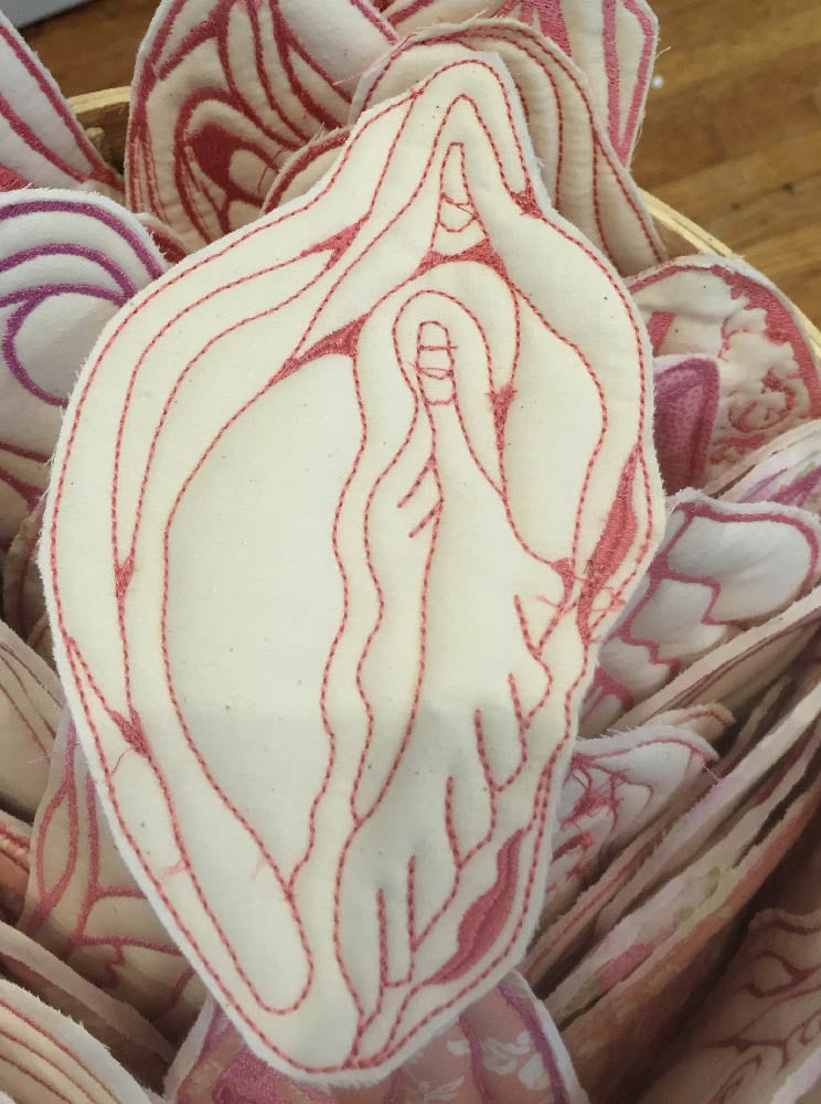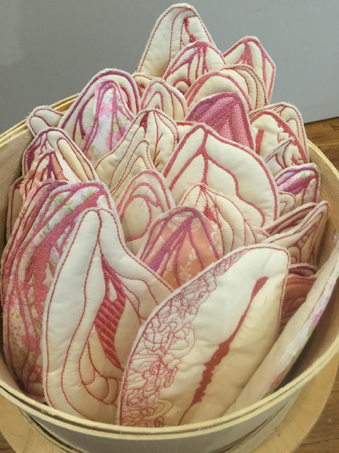 I am now, officially, an older artist and far less embarrassed. My issues are the feminist issues of power, gender and ageism. As with all body parts, vulvas age, but they remain silly, sexy and life giving. When I began to accumulate these trapunto vulvar objects, they made me giggle. And why not? It is a garden of vulva/shells, shuffling for space, in all shapes and configurations. In Grandmother's calicos and respectable muslin, they compete to be seen. It's a party! In a cheese box! And, why not?